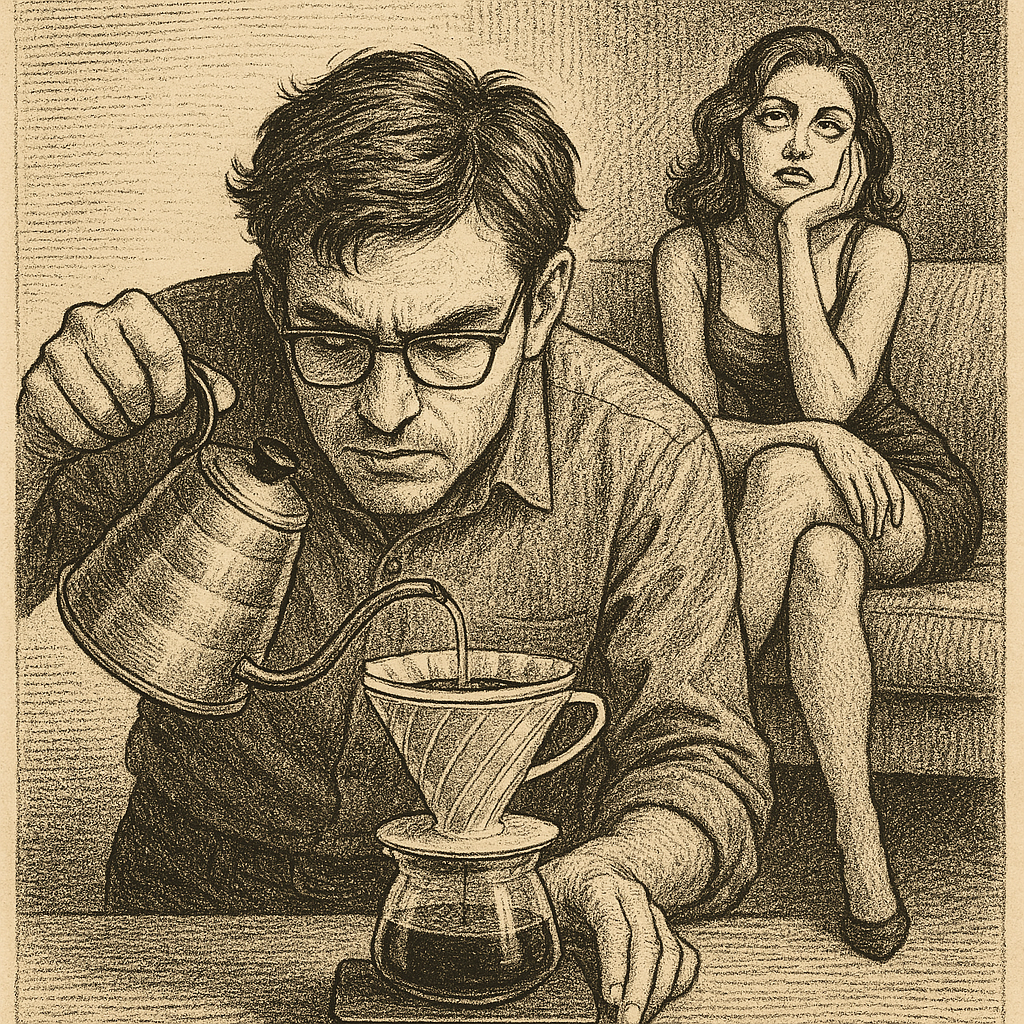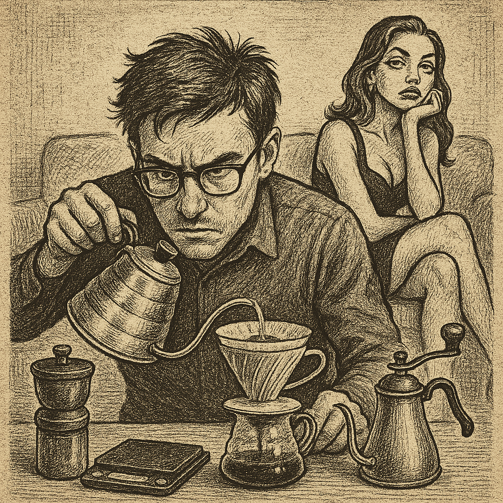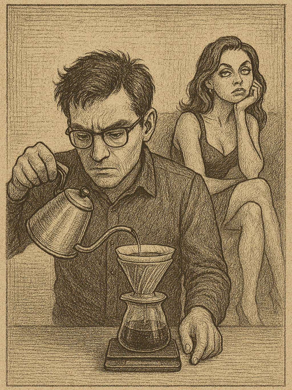 Девушка сначала подумала, что это странная форма прелюдии. А Кирилл не спешит. Он ставит перед ней весы, начинает объяснять: — Вот смотри, сейчас вода ровно 94 градуса, это оптимально для мытой Эфиопии с оттенками жасмина и нектарина. Ты кстати понимаешь разницу между натуральной и мытой обработкой Она смотрит на него, будто он говорит на шумерском: — Ну... самый крутой кофе это же эспрессо?