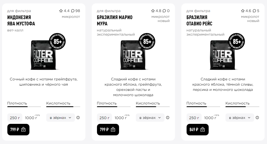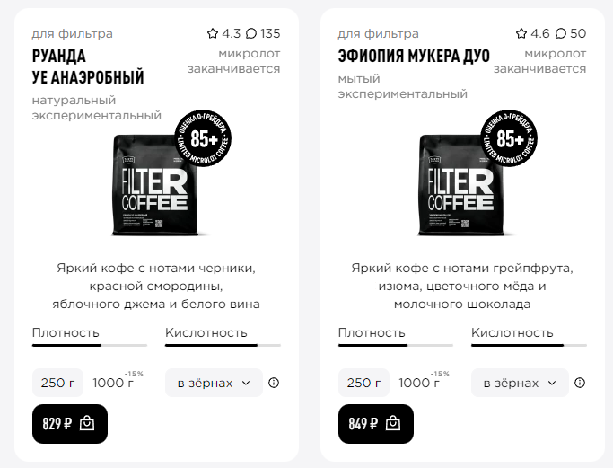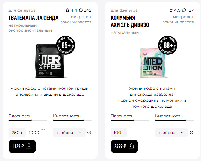 >>718002 >Тести все лоты по ~650 толкает Если только по скидкам брать недельным и новые лоты. Вот микролоты что прямо сейчас продаются, некоторые пачки по цене как катерина, а лимитки всегда были очень дорогими, дороже чем похожие сорта у других обжарщиков