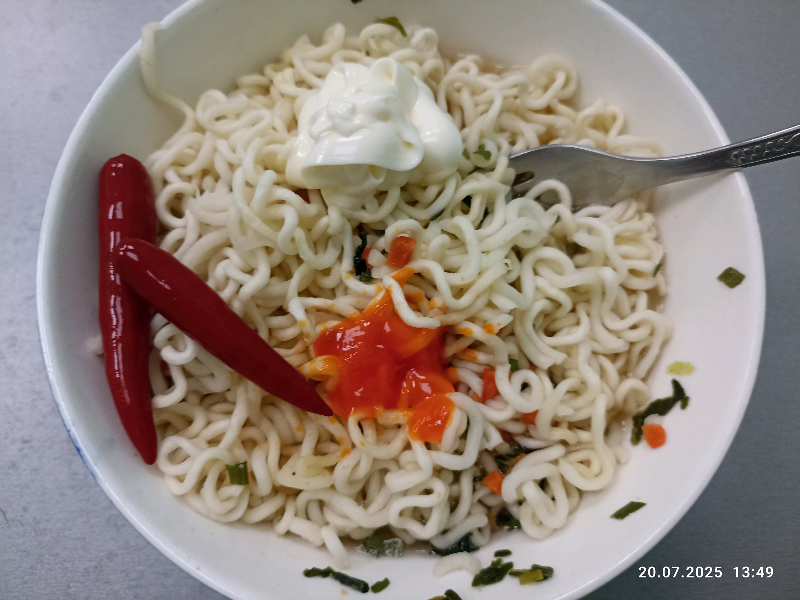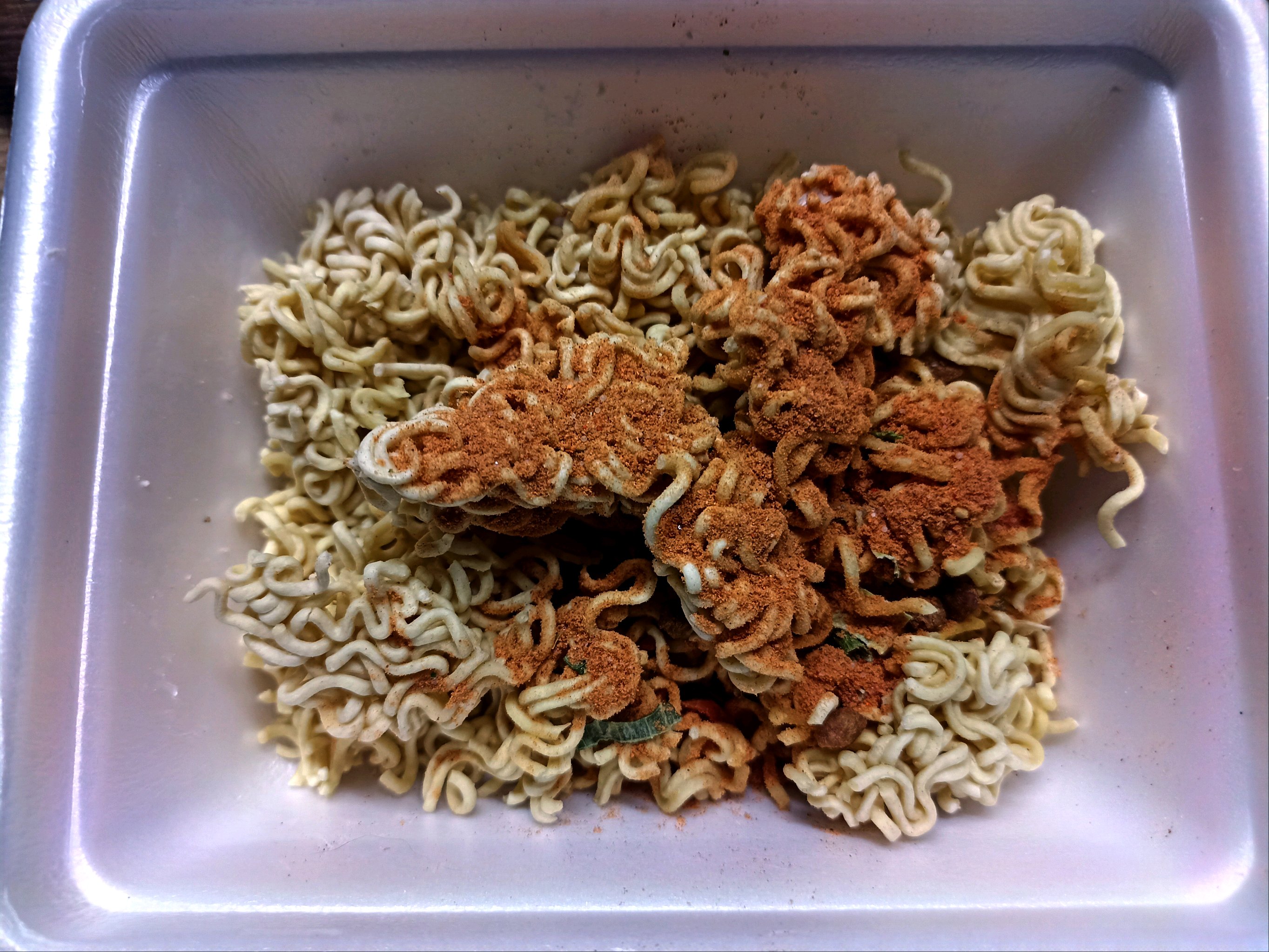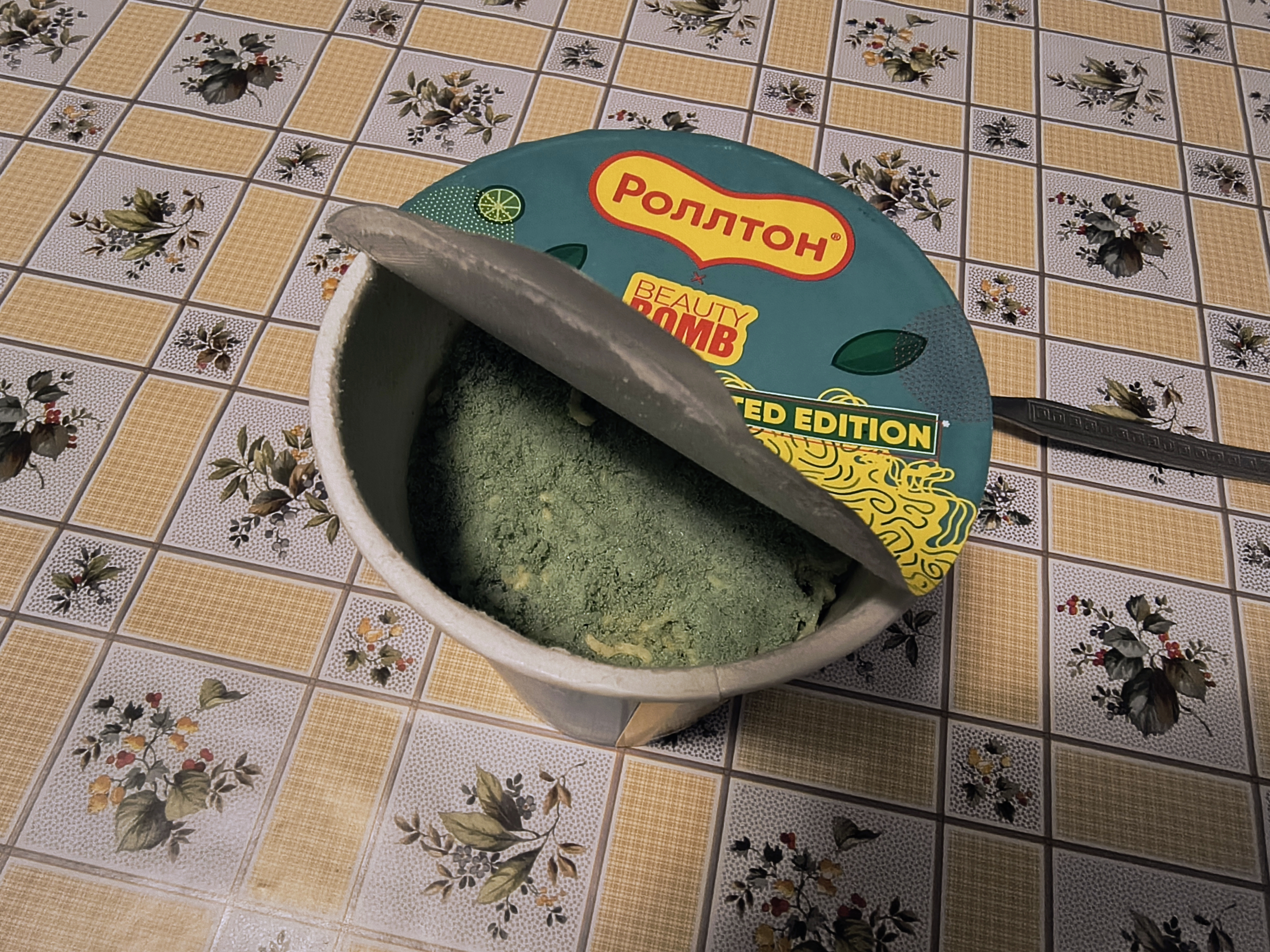 Перец где-то на половине порции вызывает сопли и слёзы, губы жжёт, но тут та же проблема, что и у прочих безводных вариантов: очень быстро пролетает внутрь и забывается. Пока жуёшь макароны, вкус есть, потом сразу исчезает.