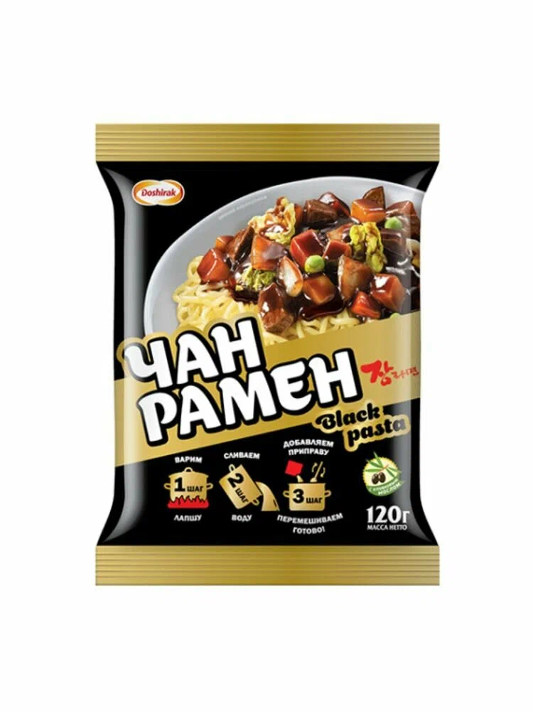 Стоит заметно дороже, потому что в комплекте более-менее целые кусочки овощей и жевательные кругляшочки с рисунком (сами найдёте в интернете, как они правильно называются). Понятно, что только это того не стоит. Зато в комплекте маслянистая паста с довольно натуральными свойствами. Лапша не слишком толстая, и варится всего две минуты, видимо, взяли ту, на которую соус лучше налипает. Воды после слива всё равно лучше оставлять самое минимальное количество, не занимаясь никаким подсчётом ложек.