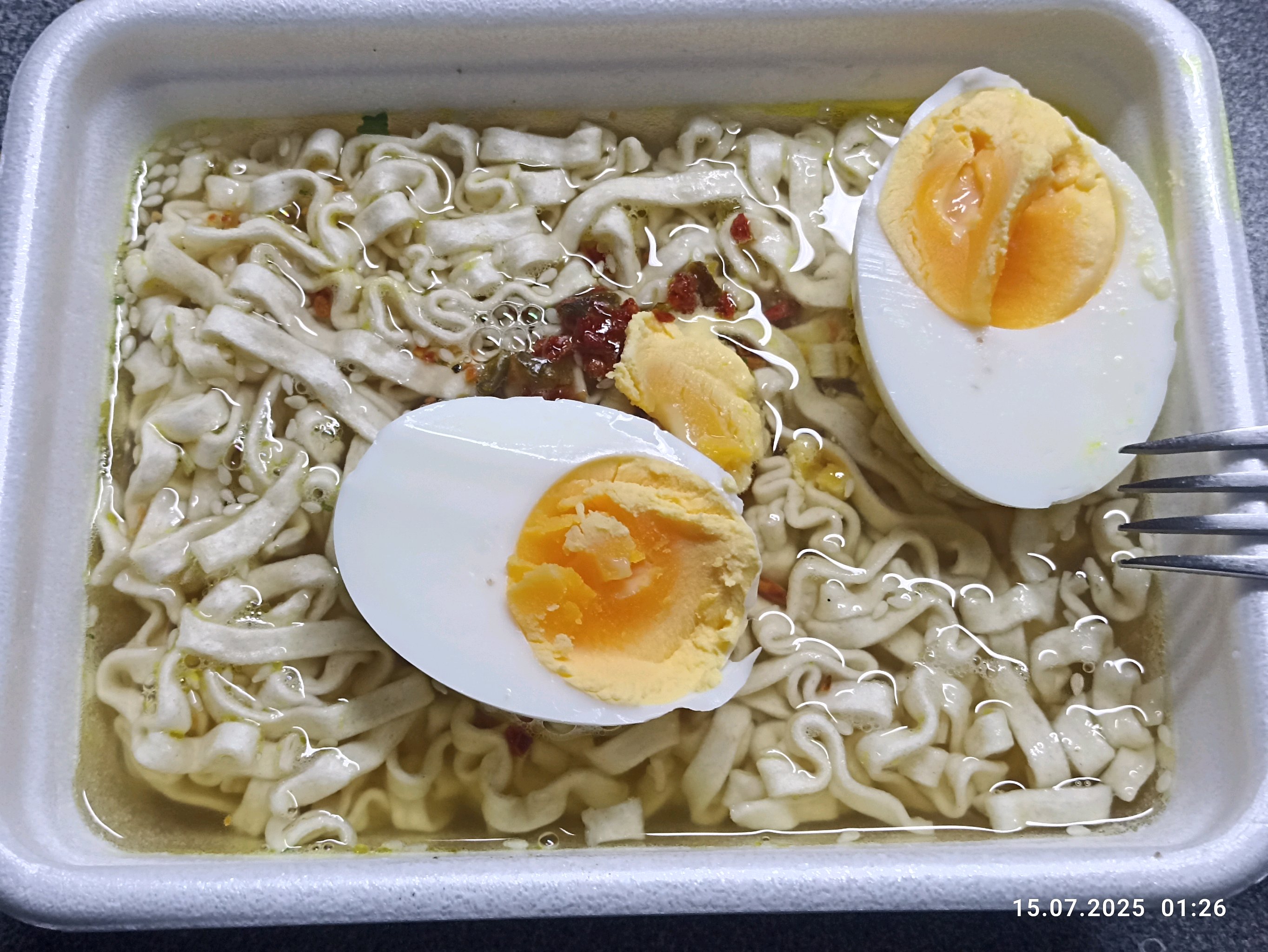 >>722791 Чего 150 грамм то? Это полноценная лапша с соусами и тд, в нее дополнительно докинуты ингредиенты уже мои собственные. Я тестирую разные сочетания с разными видами лапши, в этот раз просто яиц не было в холодосе, обычно есть и я стабильно их кладу вместе с другими добавками. И вроде такой подход это стандарт в раменах.