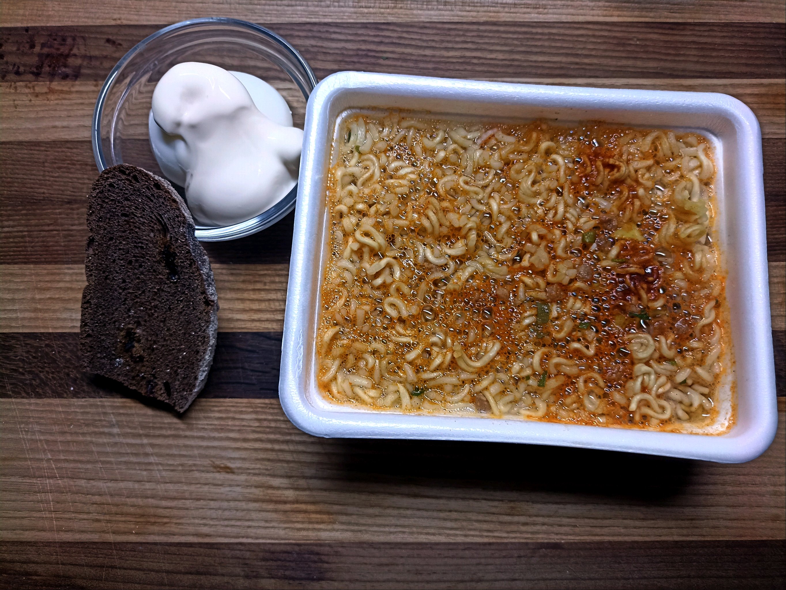 Это просто охуенно. Соус х3 даёт ощутимое от старта до финиша припекание, но не такое лютое и забивающее собственно вкус как если ебашить лапшу с ним одним, лапша вся обволакивается нежной сырно-сливочной плёночкой, при этом не раскисает в кашу. В сумме - заметно острее чем бульдак карбонара, но не менее выразительно по вкусу. Ощущения дикого нажора, кстати, нет - это вам не миску рамёна с бульоном и яйцом въебать. Вполне вменяемая порция, без перебора.