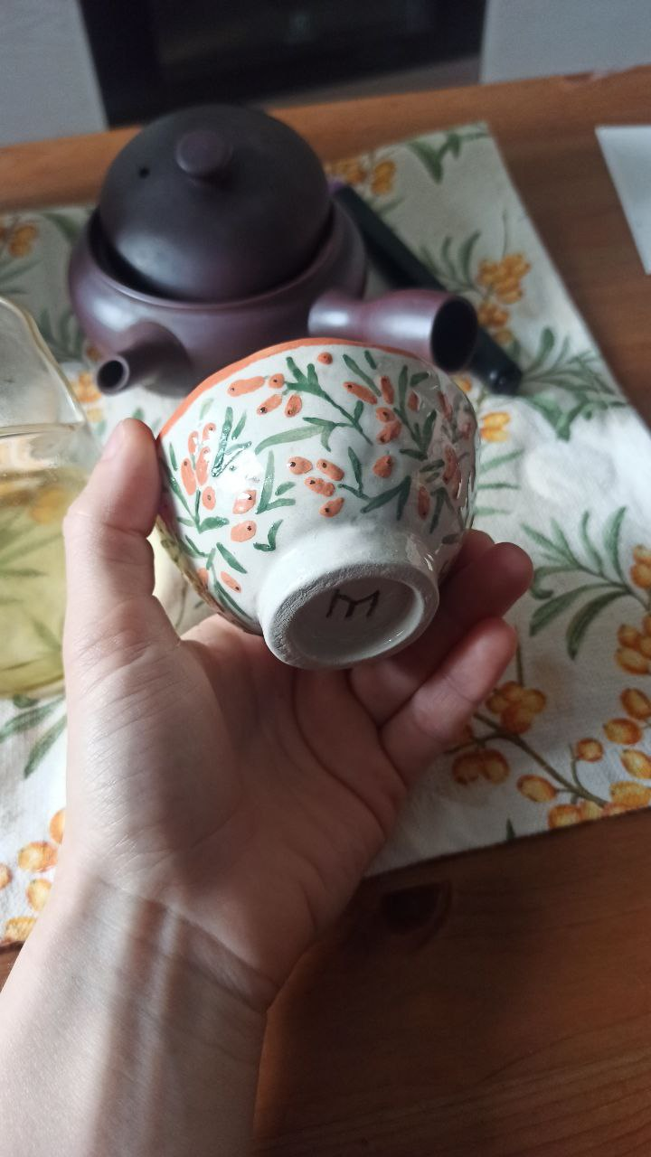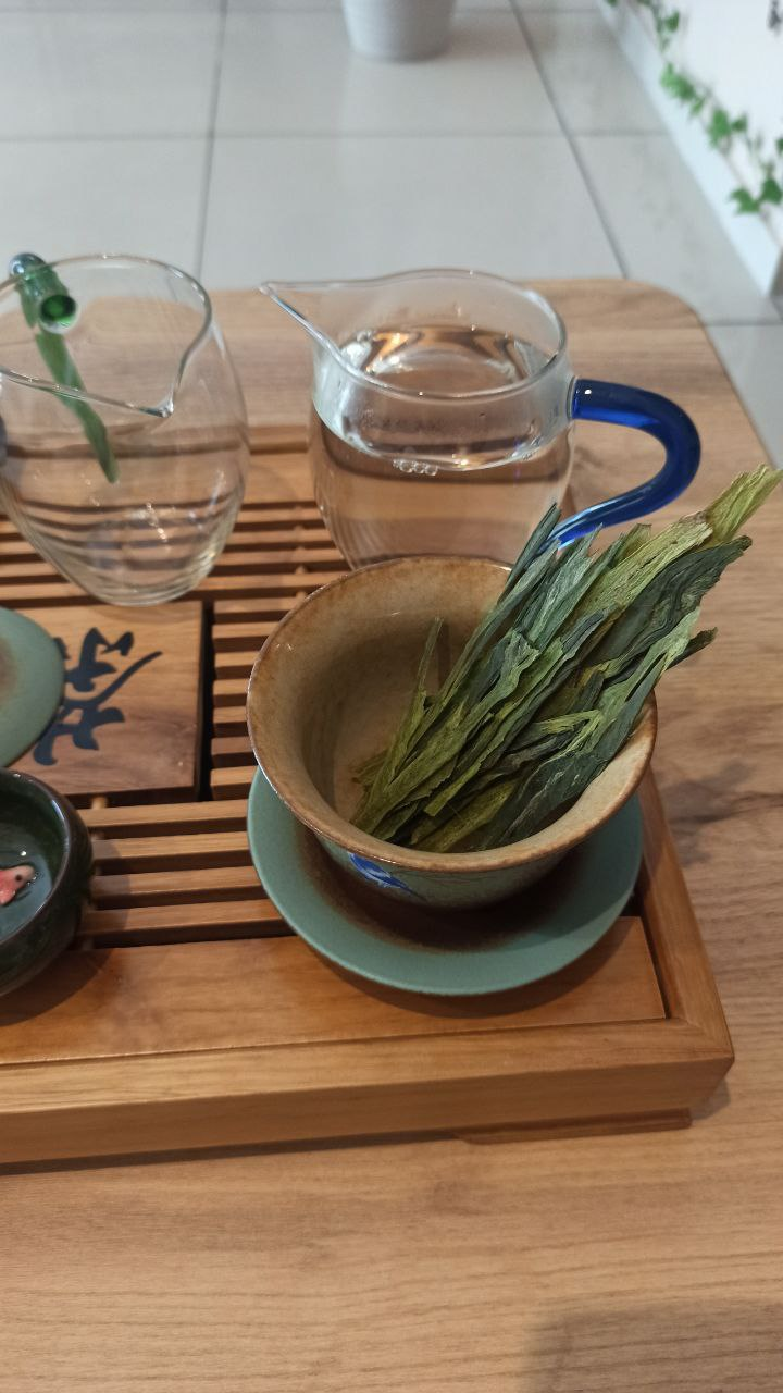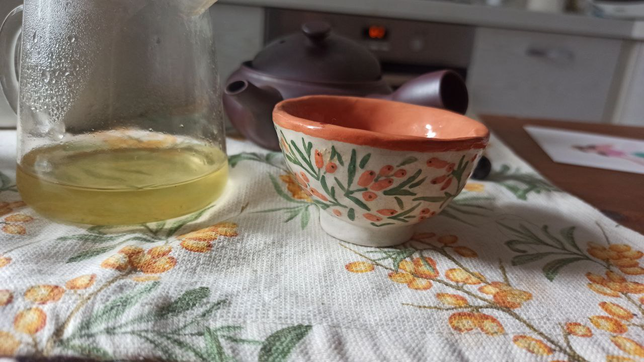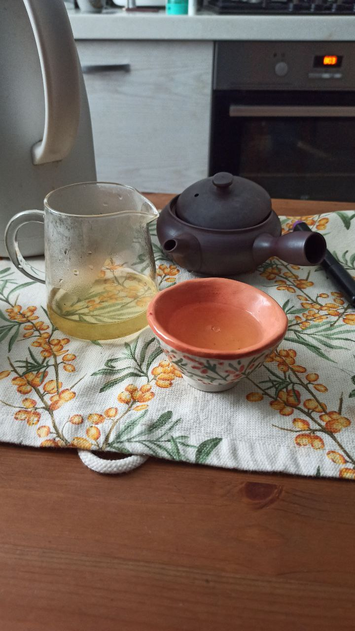 Внутри вот такая зелёнка. В чашке на фото первый пролив после технического, как видите всё равно мелкой взвеси и пыли многовато. Пахнет овощами, но не так интенсивно как маофен из даочая (пил недавно, единственное что могу за референс взять). Показалось что быстро экстрагирует, но это я вчера вечером чаи гонял и был жутко уставший, поэтому мои "быстрые" движения налить-кипятка-отставить-чайник-накрыть-гайвань-слить-в-чашку могли быть на самом деле жутко тормознутые.