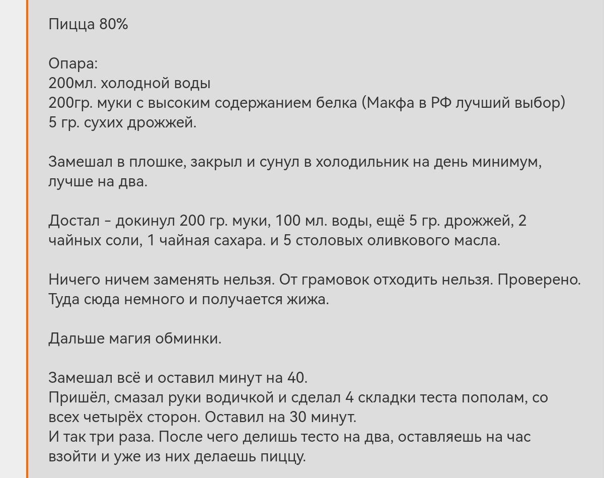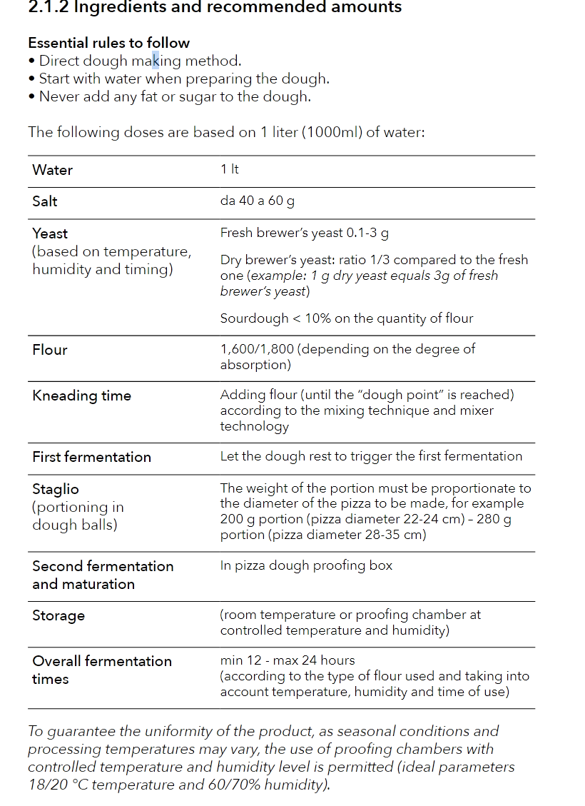 >А как объяснишь тот факт, что в рецепте выше дрожжей добавляется в 10 раз больше? https://www.pizzanapoletana.org/public/pdf/Disciplinare-2024-ENG.pdf Ну вот ассоциация неаполитанский пицы, говорит, что еще меньше дрожжей нужно. Но в том рецепте проебали первичную растройку, так что будет не так активно, в любом случае.