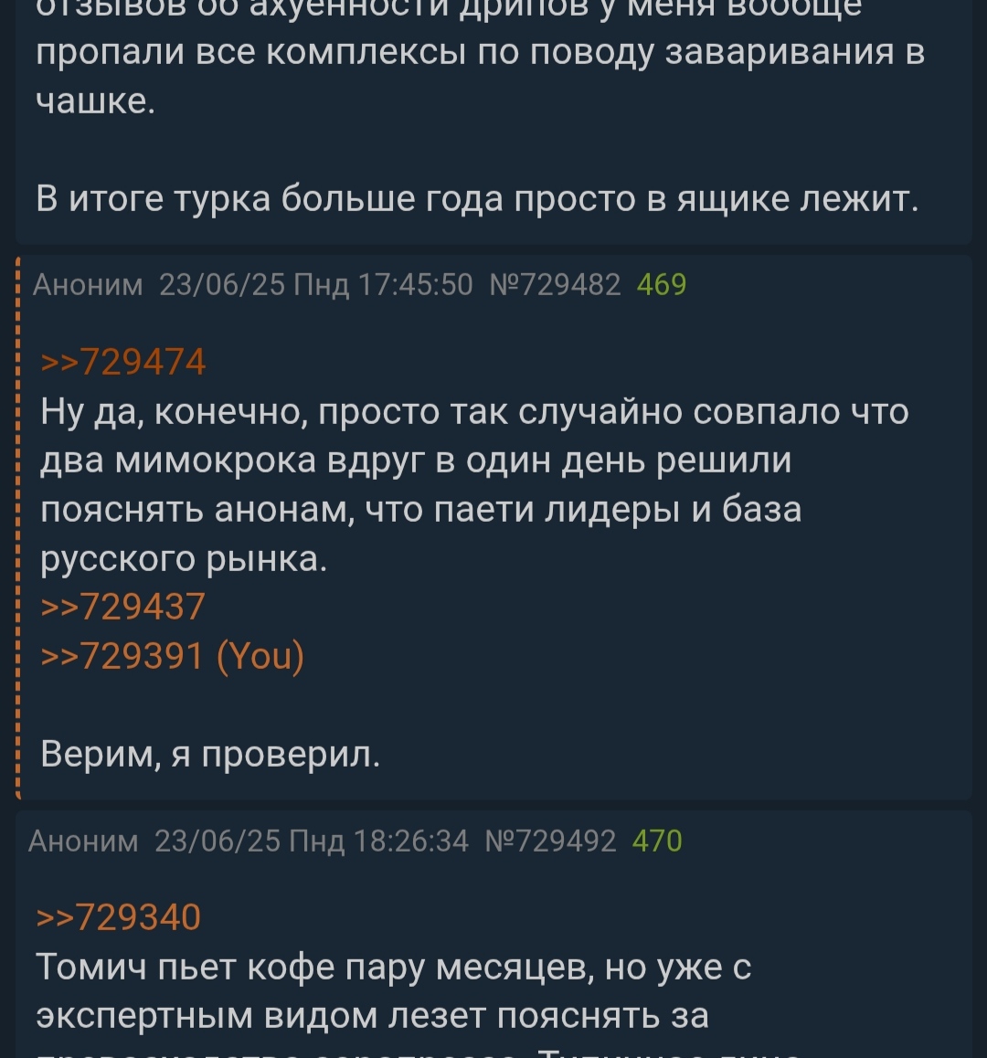 >>729874 Дело не в том, лучше или хуже, дело в том, что понравится именно тебе. В России среди домашних потребителей "спешелти" сложилась, благодаря все тем же Тейсти, довольно ебанутая мода на максимальное подчеркивание кислот в обжарке, хотя в странах с нормальной кофейной культурой это считается дефектами. Такое зерно обычно заваривается в гомеопатической пропорции типа 12/200 в пластиковой, а некоторыми уникумами керамической воронке еле теплой водой, половина которой шурует мимо закладки, потому что от настоящего кофе зумер скорее всего упадет в обморок. Похожую ситуацию ты можешь наблюдать в чае, где любят залить 5 грамм 200 миллилитрами, подержать это секунд двадцать и пить еле подкрашенную воду, да еще и проливать это дело по 150 раз. Или там в табакокурении с электронными дудками вместо хорошего трубочного табака. Сладкий, плотный, развитый кофе как у Мануфактуры этими людьми называется "пережареным". Ньюфаг приходит в эту среду, покупает пачку кофе, понимает, что у него в чашке что-то невкусное (пускай обычно и весьма ароматное) и начинает сомневаться в своем собственном вкусе, навыке заваривания, оборудовании и т. д., ведь все так убедительно расписывают богатый букет с нотками личи; и либо он уходит, разочарованный в таком кофе, либо начинаются мантры с самоубеждением в том, что в этом кофе и правда есть все заявленное. Но правда в том, что со вкусом у него все в порядке, просто он стал жертвой маркетинга. Но опять-таки, все вышесказанное относится к людям, которые в тусовочке домашних спешелтихлебов в России в меньшинстве. Вполне может быть, что компот от Тейсти и тому подобных обжарщиков тебе понравится больше, чем обжарка Мануфактуры. >>730001 Так ведь в том-то и дело, что разным людям нравятся разные вкусы и они склонны подчеркивать в кофе, вино и прочем именно то, что им нравится. Ну и о какой объективности может идти речь, когда каппер попил зерно с сэмпл ростера, заваренное в одних условиях одной водой, а ты пьешь с большого ростера, заваренное в других условиях и другой водой? Он еще и свежее попил, а ты в лучшем случае недельной, а то и месячной давности, смотря сколько пачка валялась на складе, прежде чем ее отправили тебе. Поэтому для меня больше о кофе говорит сорт, терруар, обработка, используемый ростер, и самое главное - профиль обжарки, если обжарщик им делится, то вообще круто. А маняфантазии каппера наименее информативны, кофе с одинаковыми дескрипторами может быть совершенно разным.