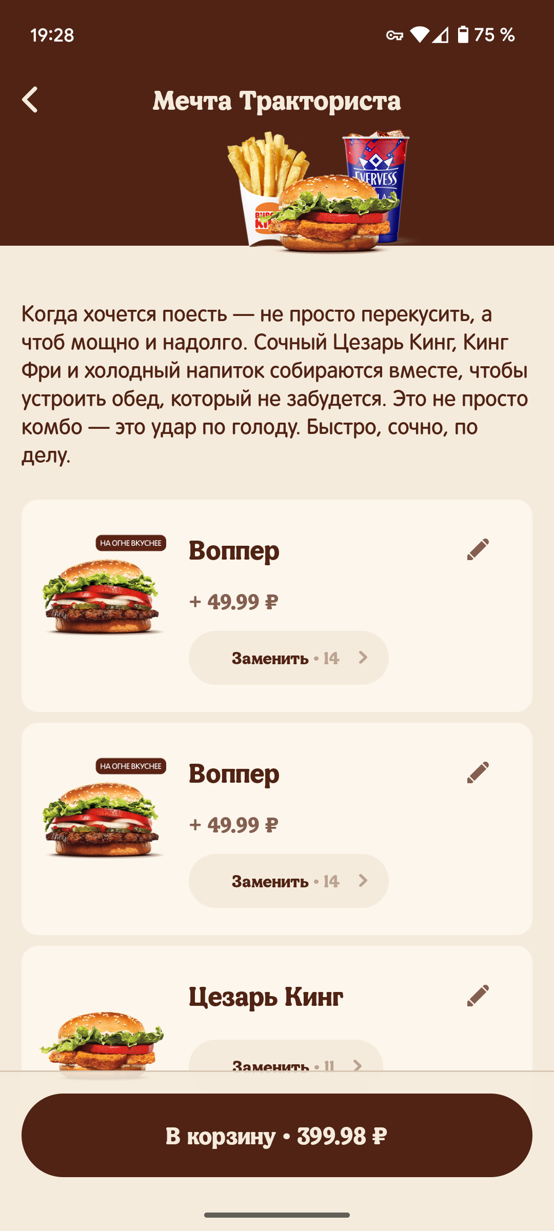 >>730121 Лолчто так можно было.... А я сегодня давился Цезарь кингами и хотел написать что лучше уж комбо из воппер Джуниор и чизбургера за 189 р. Цезари не очень, это просто булка с тремя наггетсами и мазиком, если уж курятину брать то лучше в гойстикс