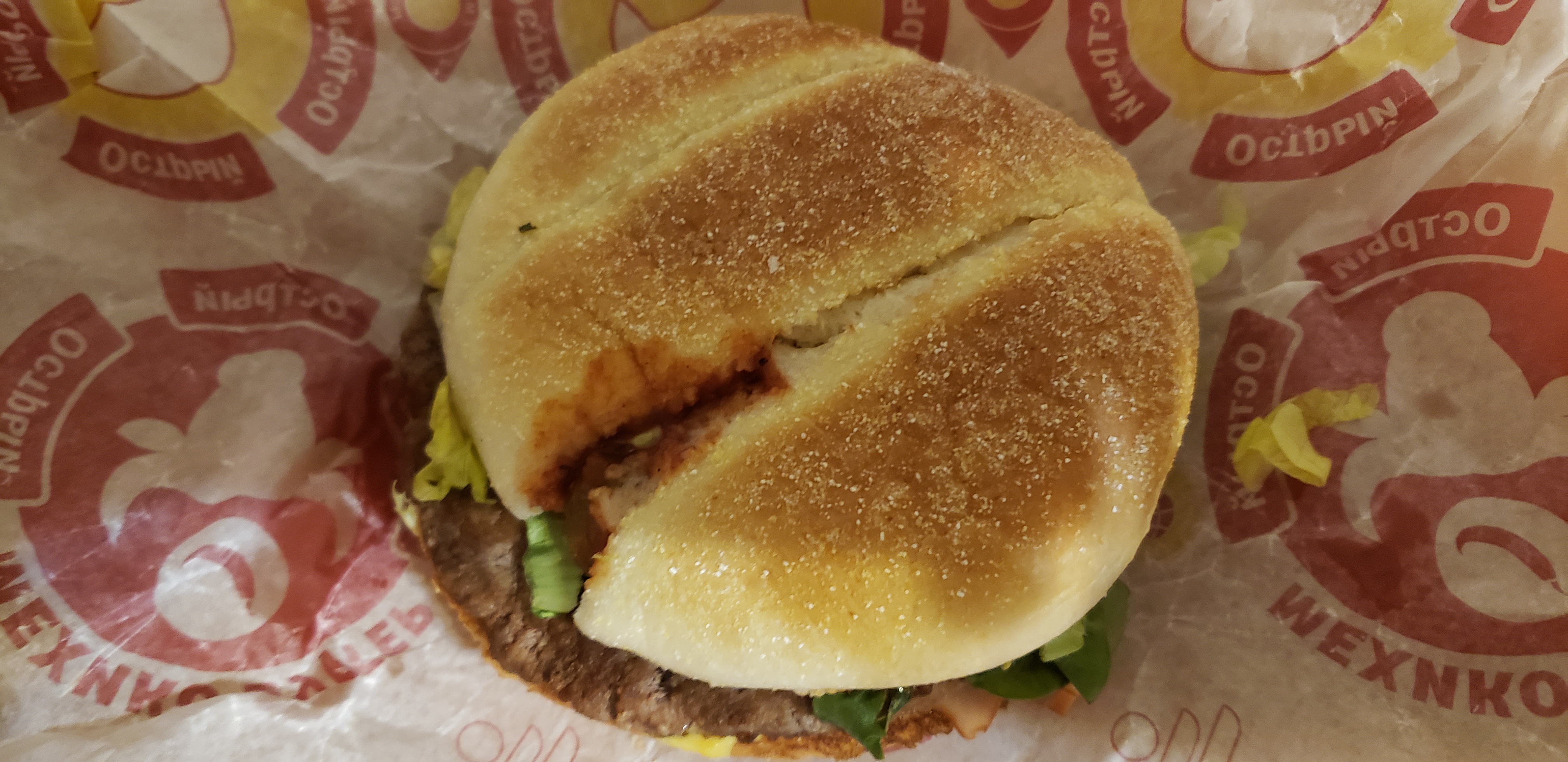 В ростиксе у дешевых бургеров булка всратая. Она пористая, не мягкая, будто полежала. Мне напомнило всратые пирожки с мясом, которые готовит чья-нибудь бабушка. Котлета тоже всратая. Ниже шефбургера ничего брать не имеет смысла.