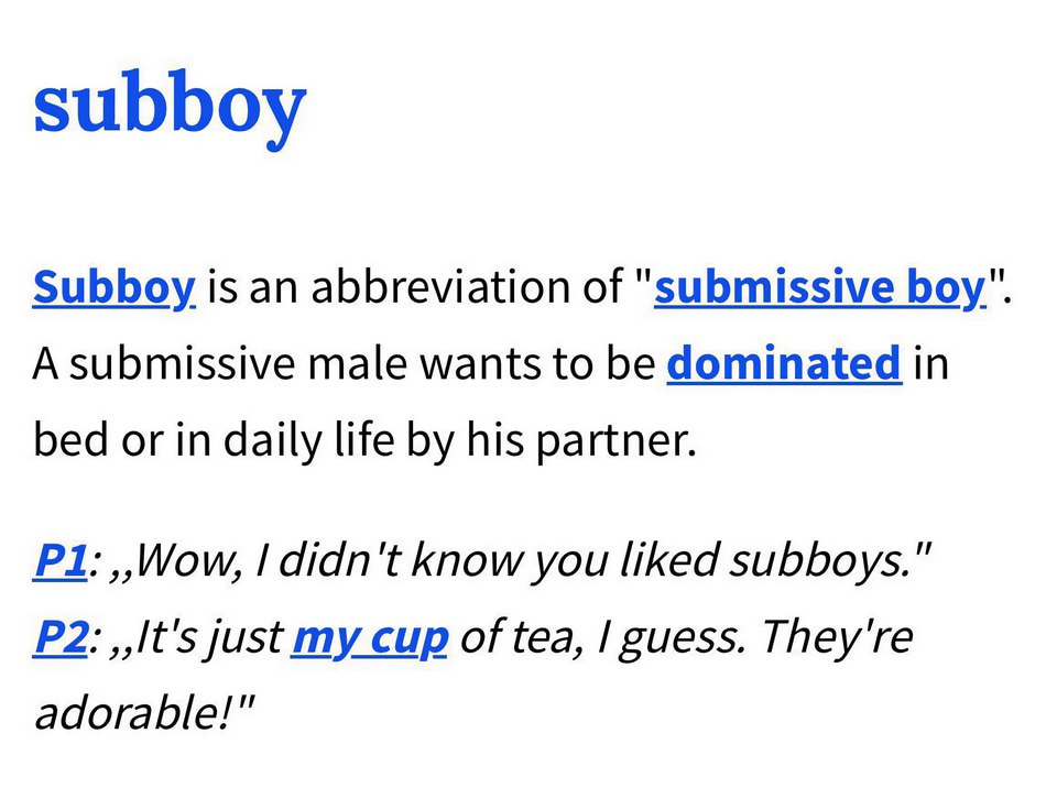 Дело в том, что в разговорном английском subboy означает «покорного мальчика, который хочет, чтобы партнёр доминировал над ним – в сексе или в обычной жизни».