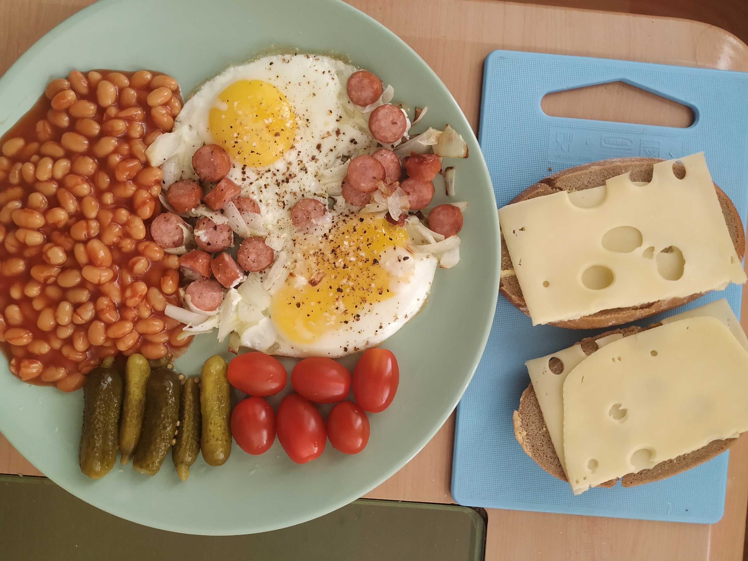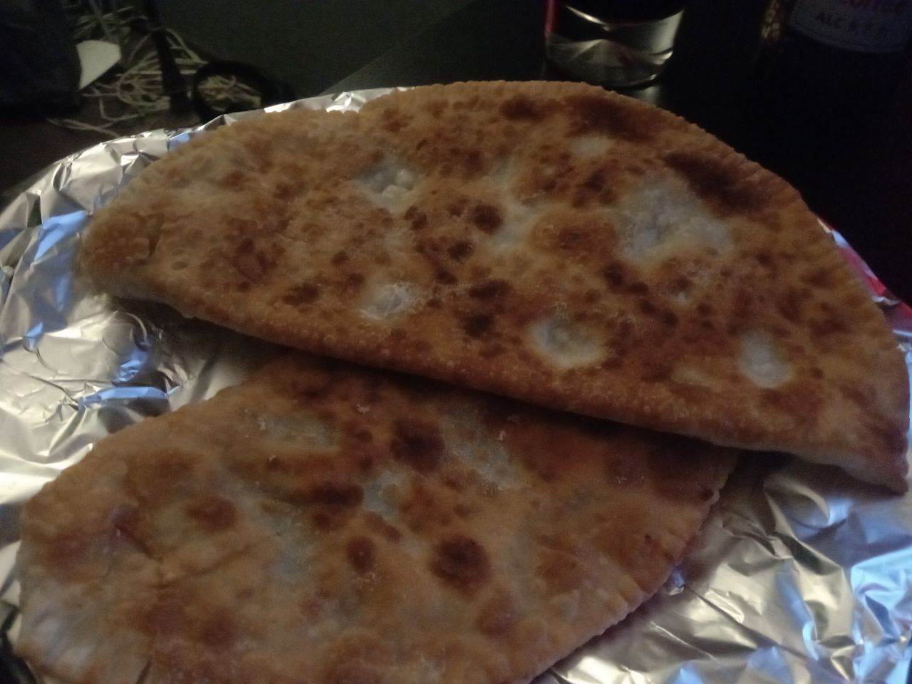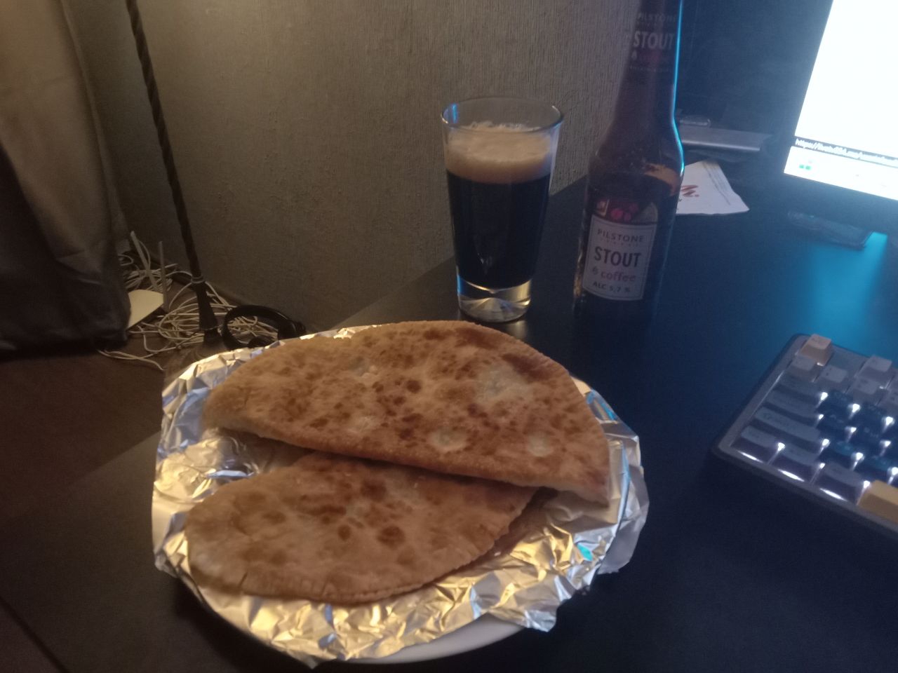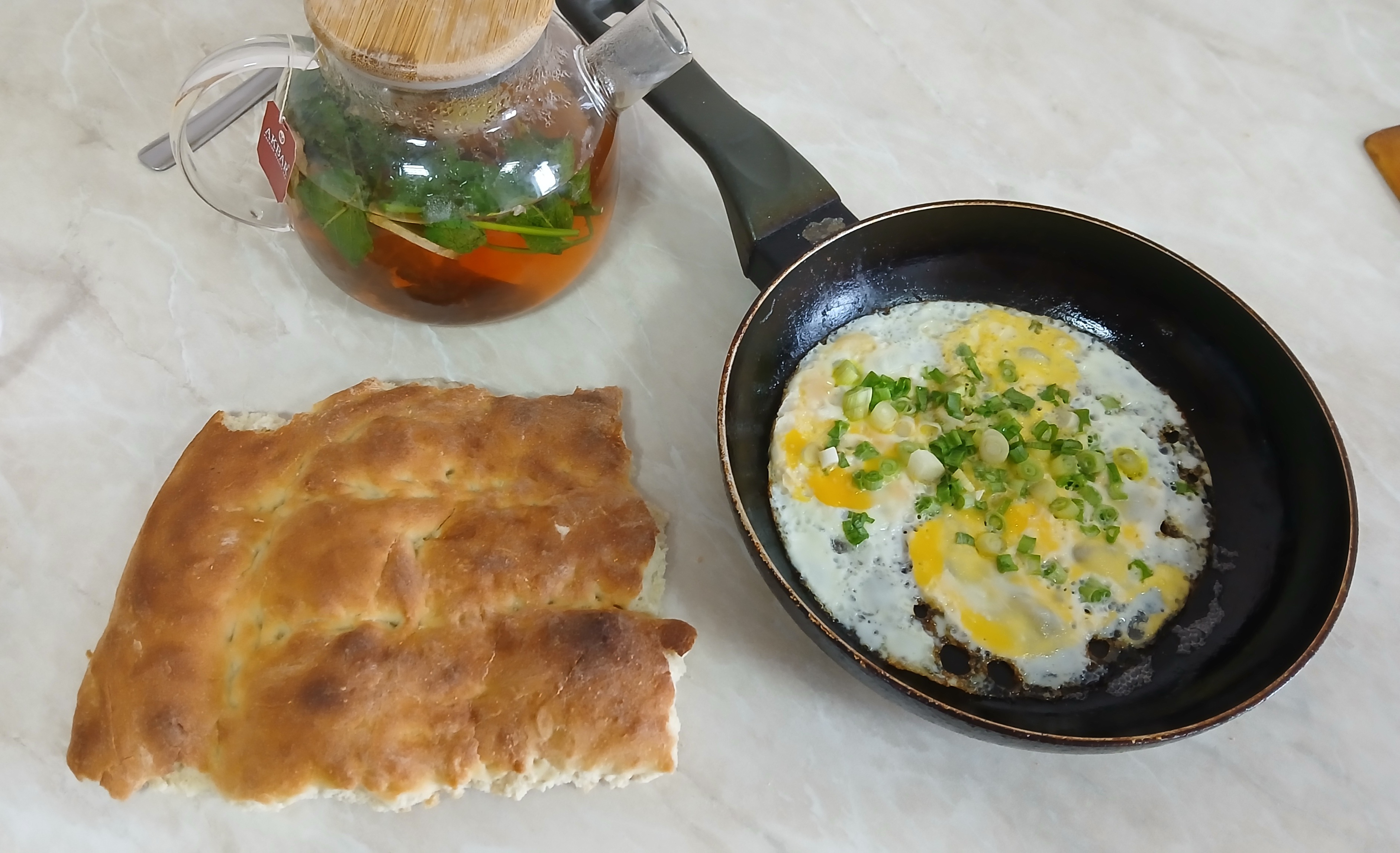 Картофельный хлеб из перекрёстка, последние два яйца из холодоса, все сушёные травы что нашлись в шкафу и остатки острого соуса. Съел, но жрать всё ещё хочется, а нечего...