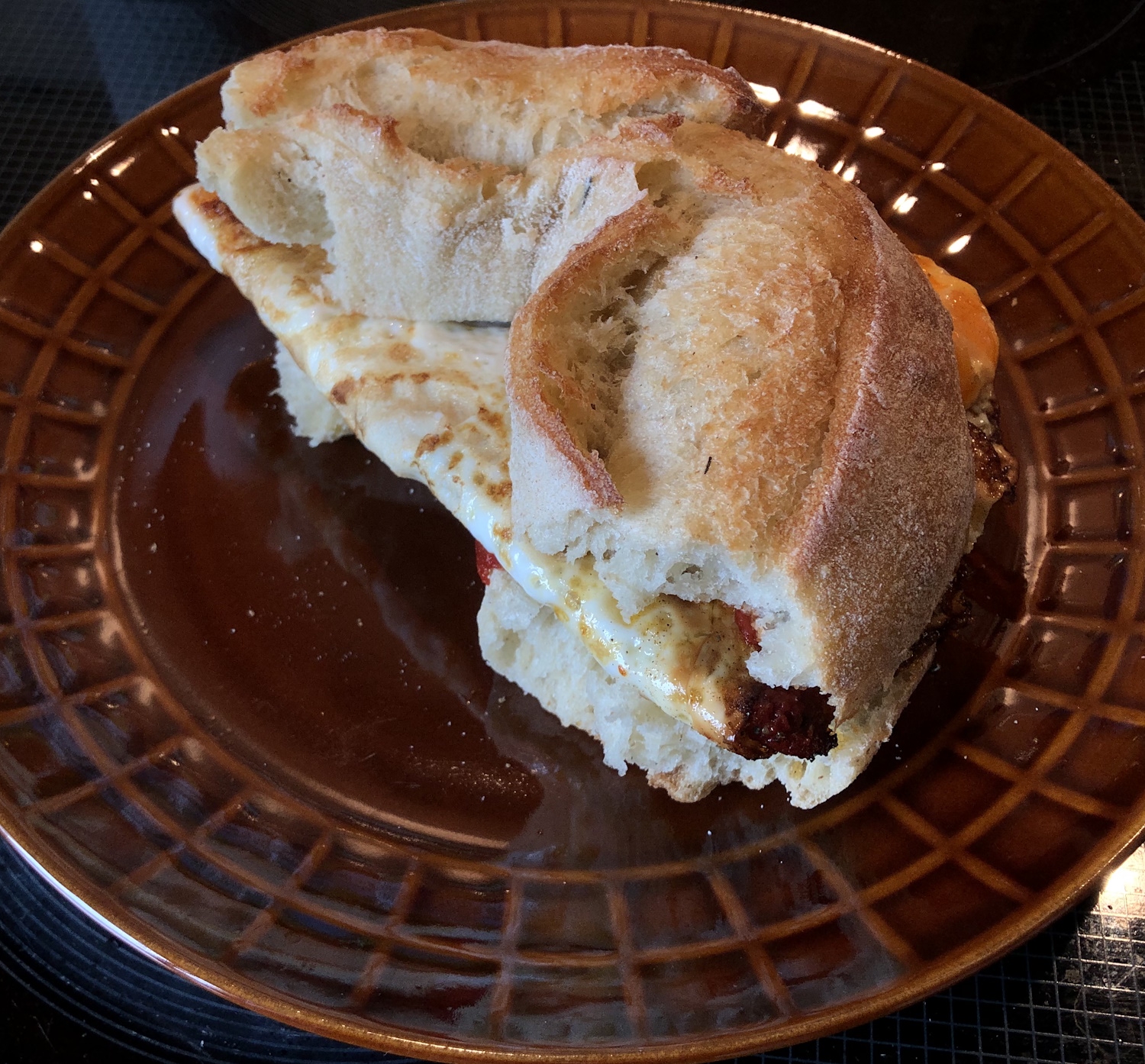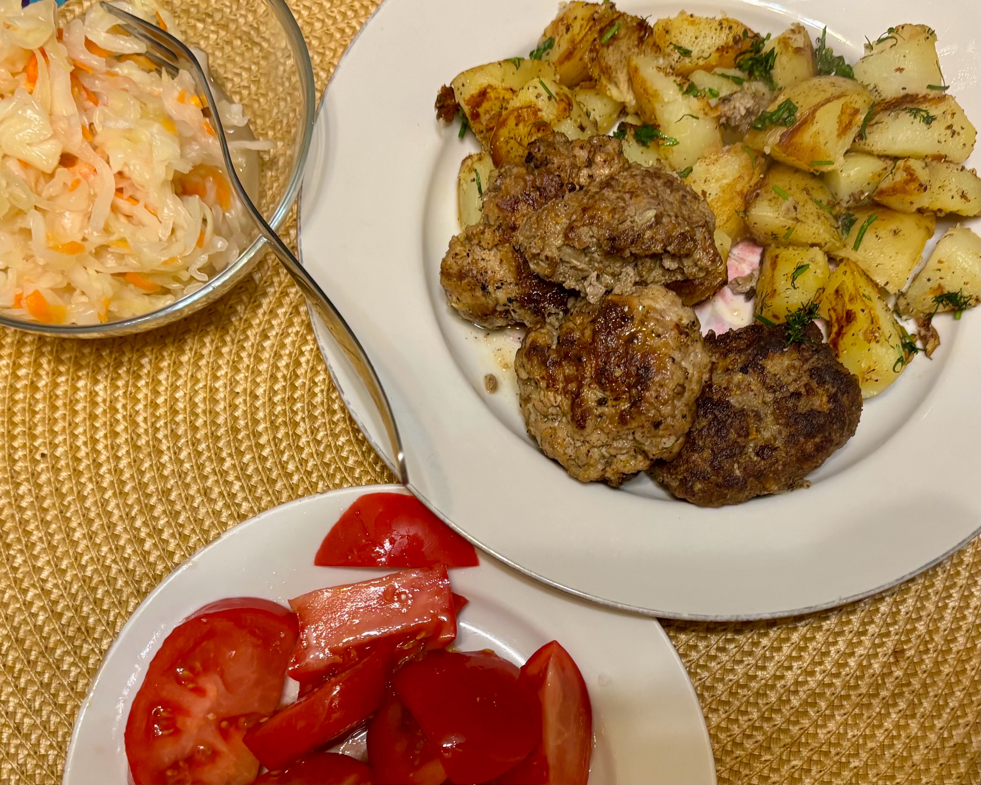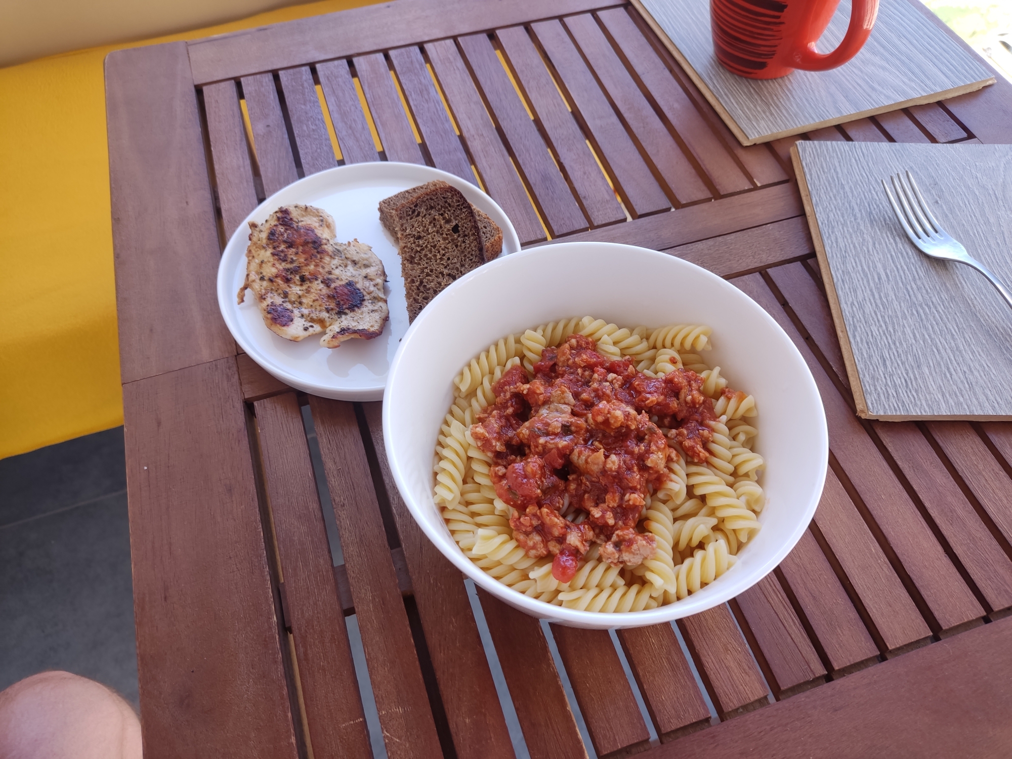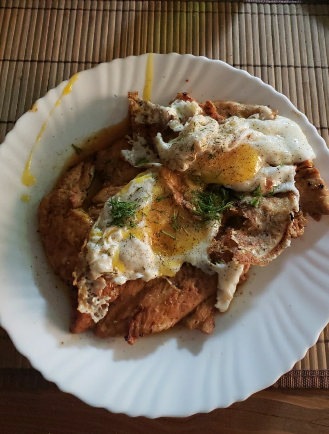 Картофельный хлеб из перекрёстка, последние два яйца из холодоса, все сушёные травы что нашлись в шкафу и остатки острого соуса. Съел, но жрать всё ещё хочется, а нечего...