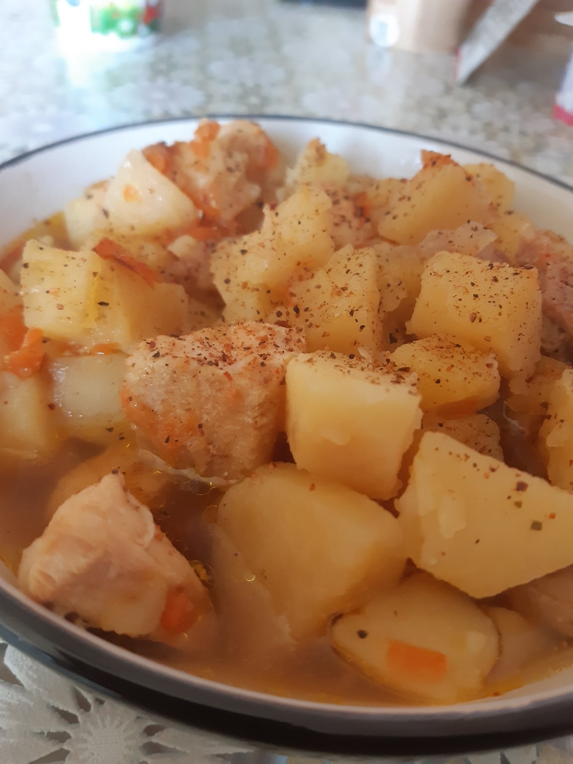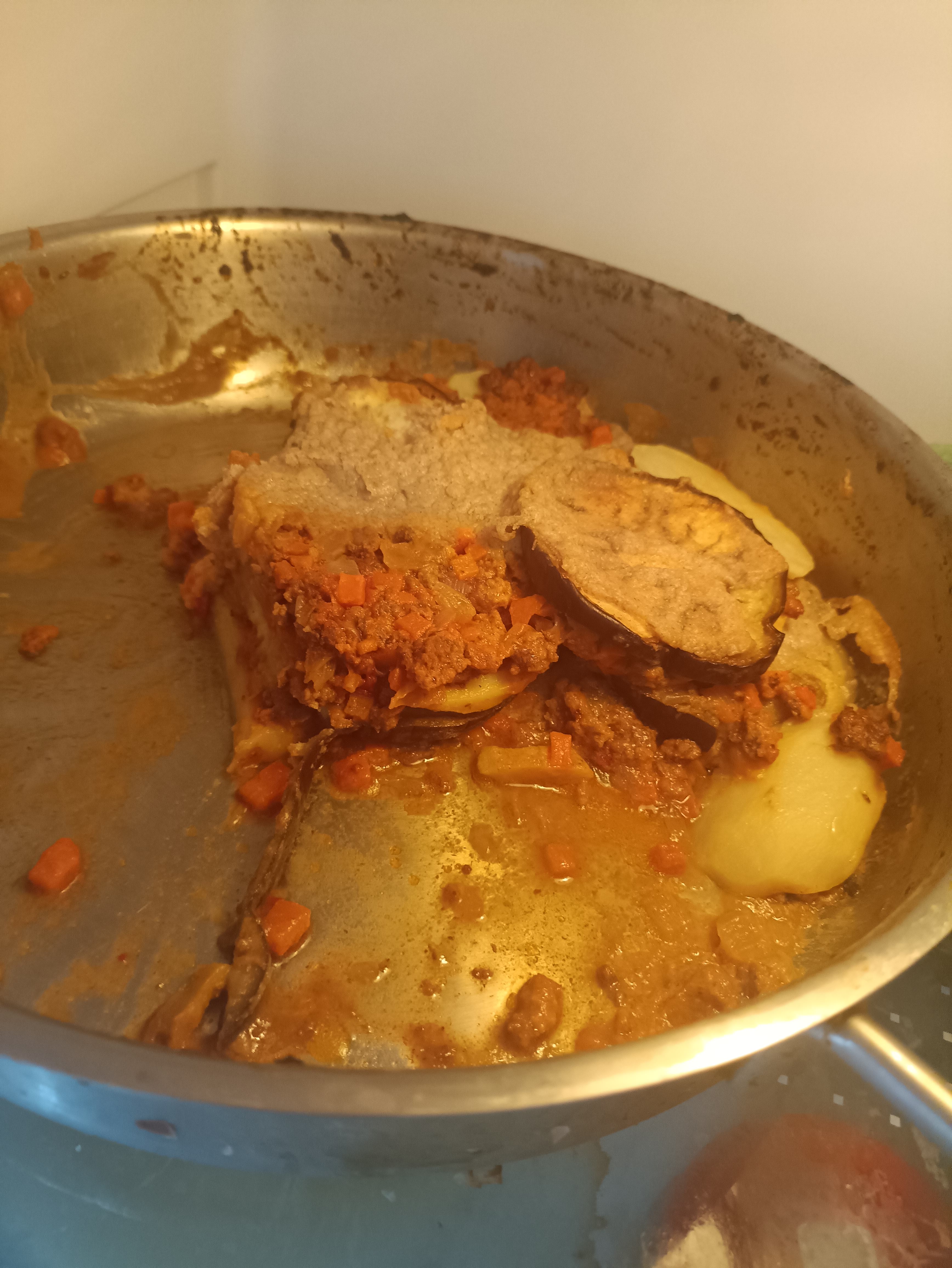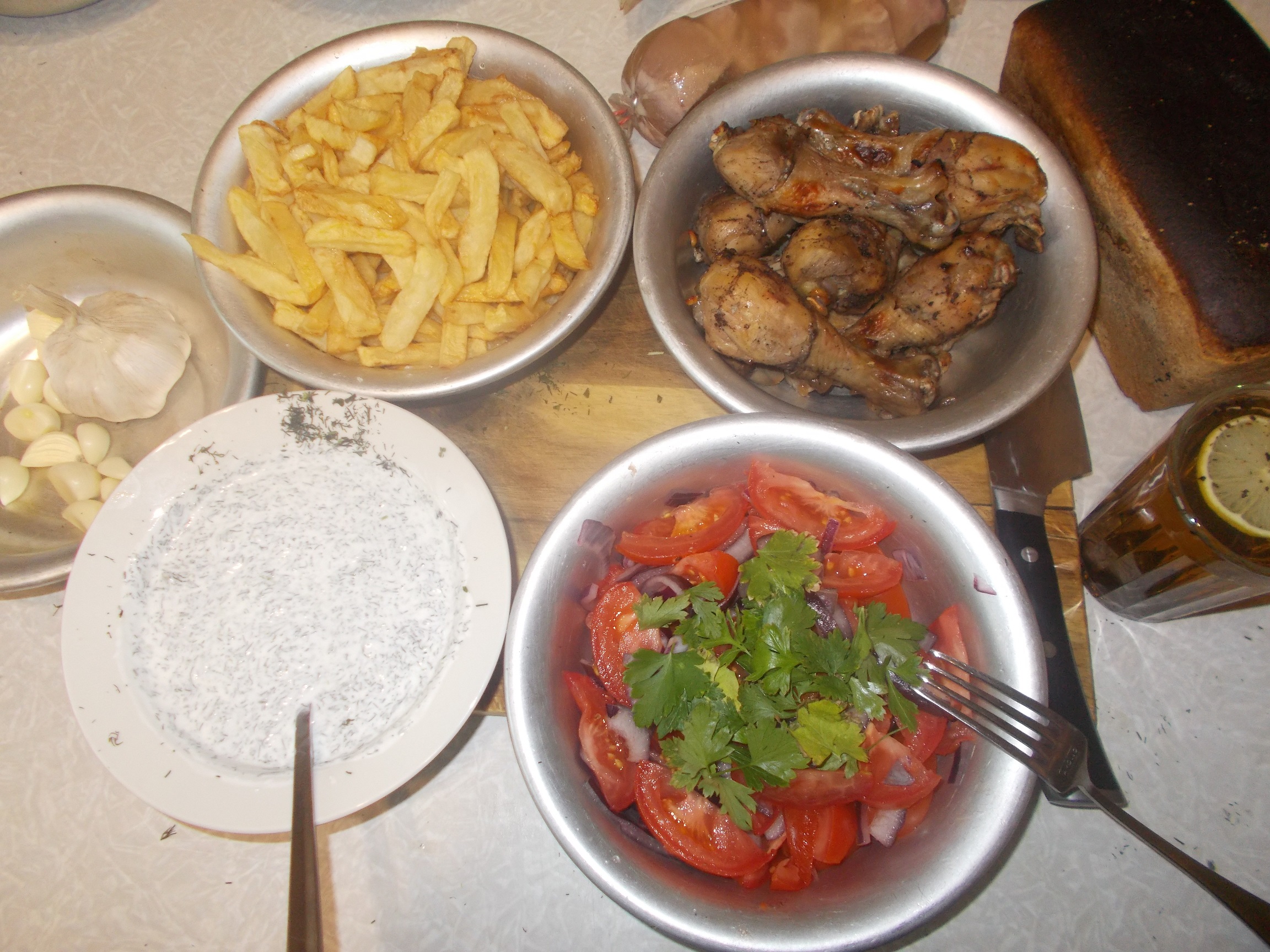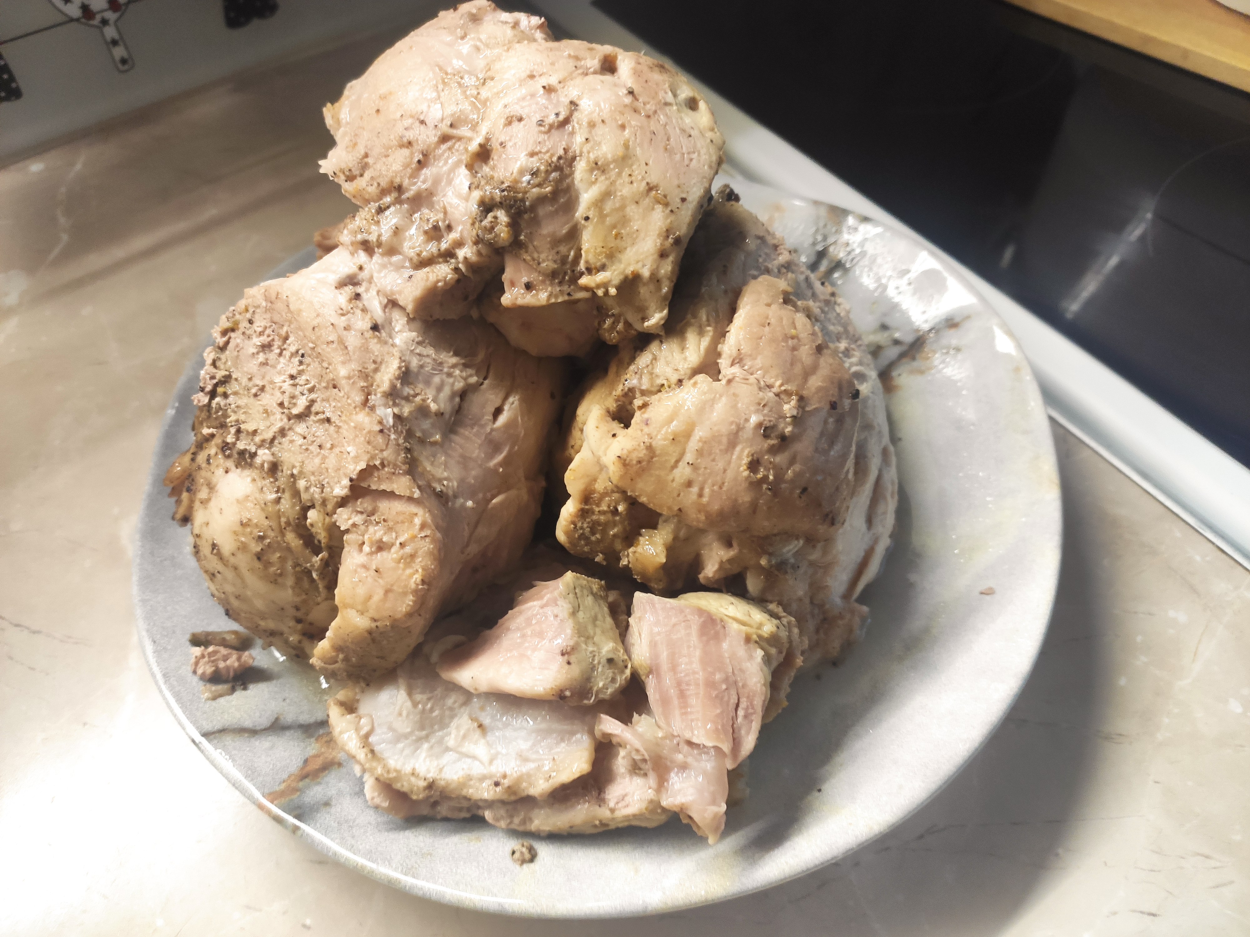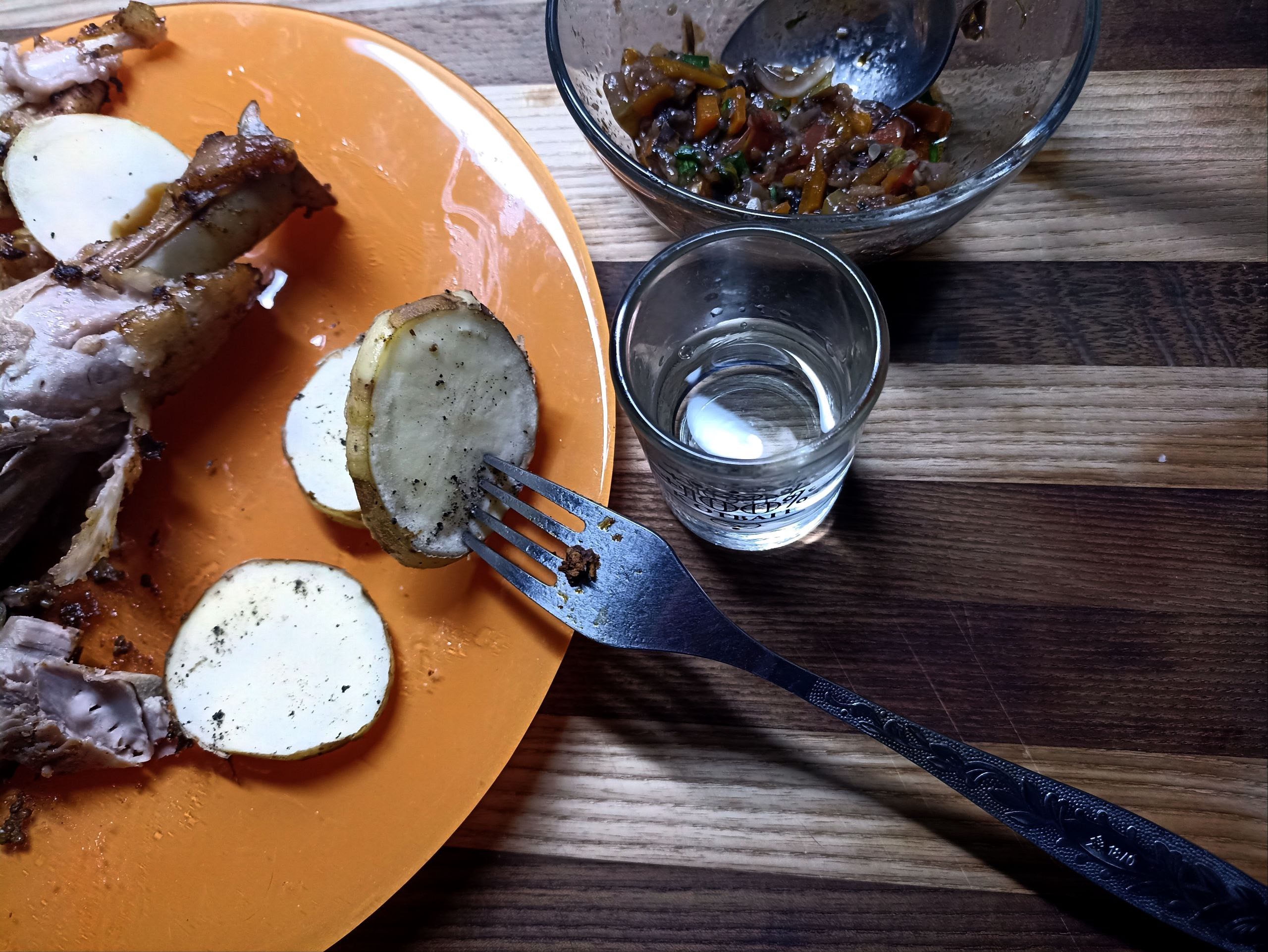 Насмотрелся я на эти ваши >>731124 индюшачьи ноги и взял пару голеней. Потушил в МСК 20 минут на бульоне от предыдущей курицы, который уже месяц лежал в морозилке, затем подснял шкуру сделал надрезы и упихал туда немного аджики, натянул как смог кожу обратно, но херово размазал аджику по поверхности. Духовка на 25-200 подсушила это всё, однако молодой необкатанный картофель вышел то полусырым-полузасушенным, можно смело отдать его голодающим В качестве отвлекающего манёвра тушеные овощи с кинцой и зеленым луком, тут всё отлично я постоянно готовлю такое к рису. Понимаю что это всё в сочетании с недопитой в прошлые выходные прокаченной до 0.375 чекухой водки сведёт меня в могилу лет на 5 раньше, но ничего не смог с собой поделать