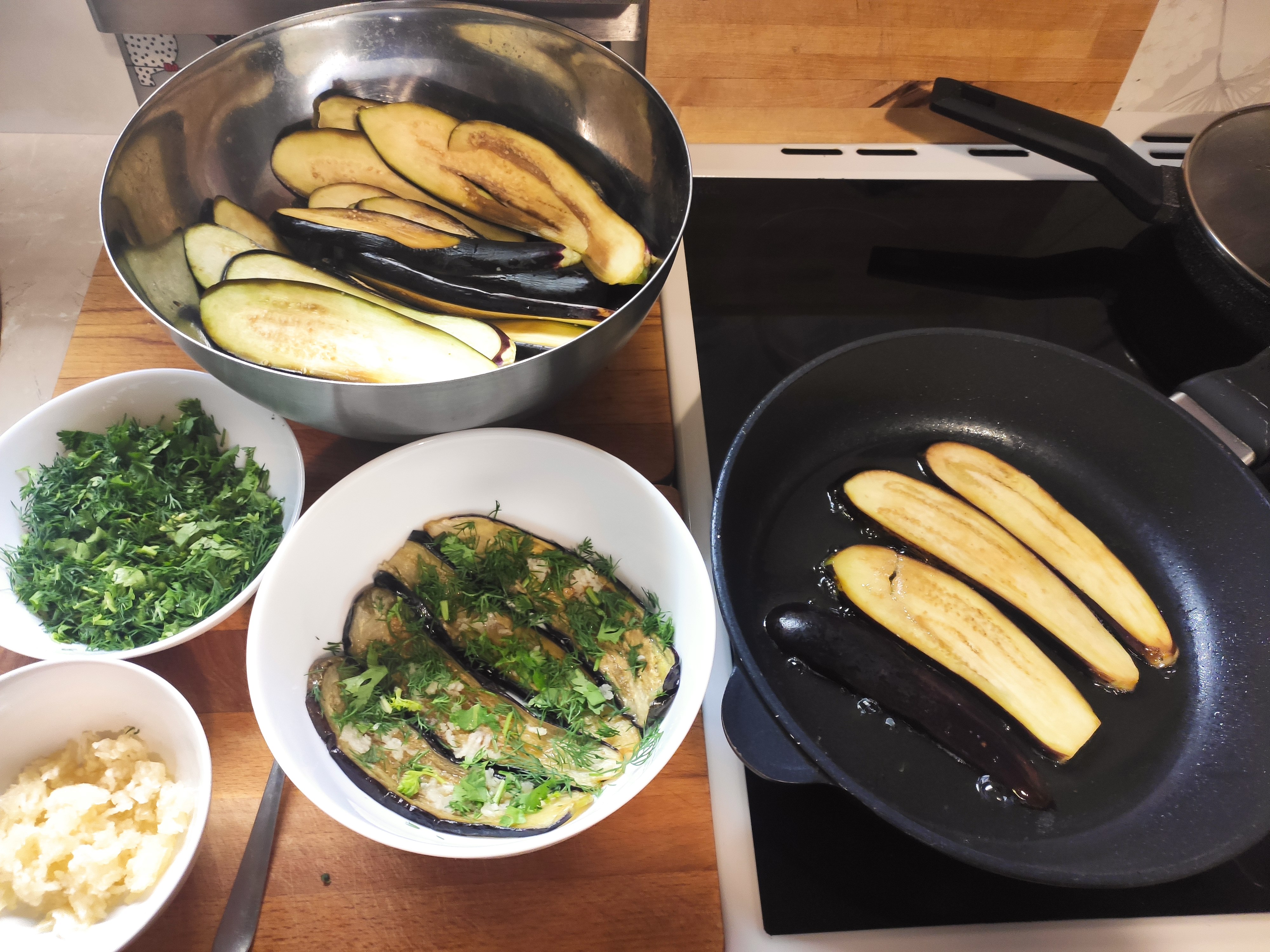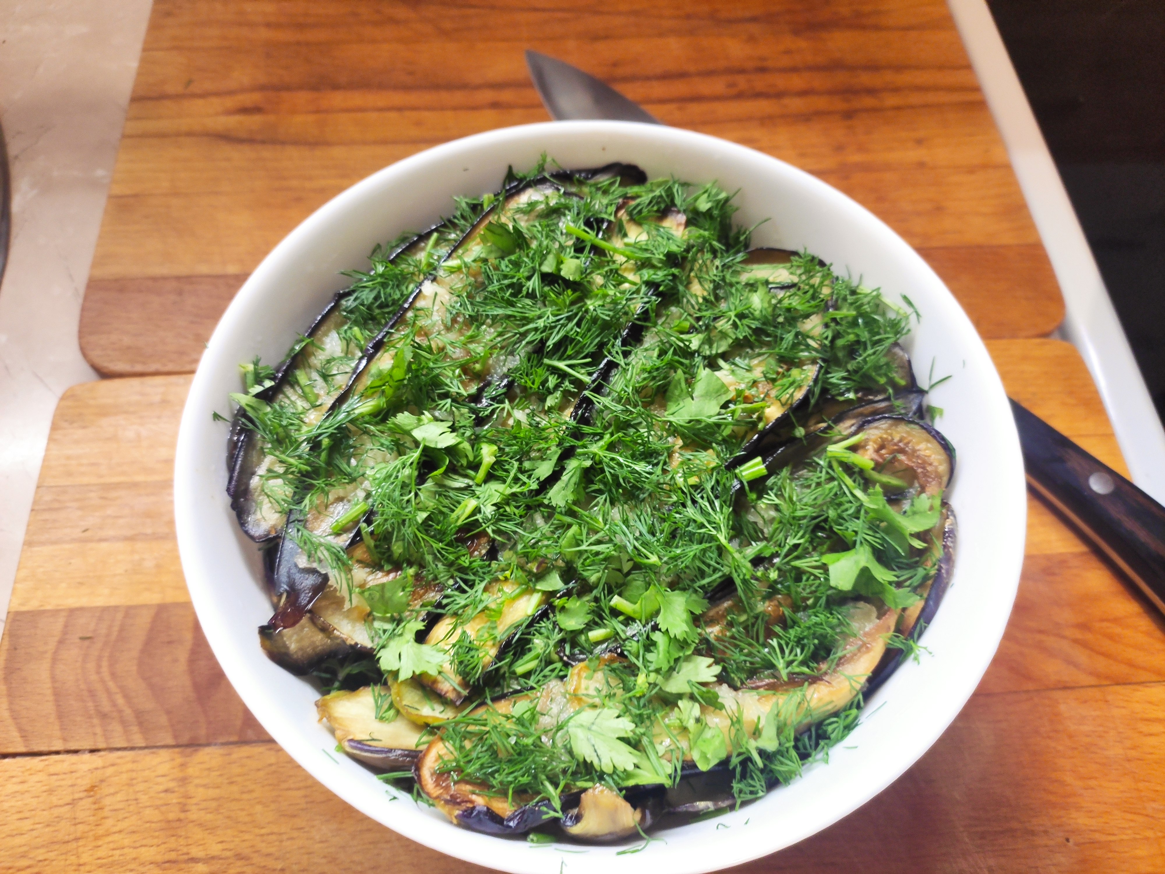 Продолжаю готовить закуску из баклажанов: баклажаны, молодой ческок, укроп, кинза, соль, растительное масло. Нюанс, необязательно вымачивать баклажаны в воде чтобы брали меньше масла - достаточно присолить минут на 20-ть - соль сделает баклажаны достаточно влажными. И, да, без грецких орехов - лично для меня вкус слишком жирный получается.