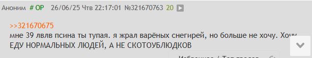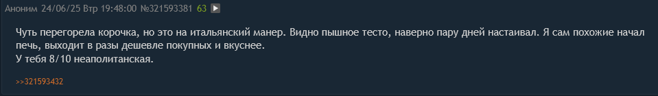 Я довольно древний олдфаг, когда еще не было ГКД, и палочник потом-потом уже появился и постепенно исчез. Тогда чётко было видно - интересна анону еда или нет - каждый создавал свой тред со своей едой, у некоторых с полной технологической картой. Тогда ругали за неправильную съёмку, за чуть пережареную или чуть недожареную яичницу, требовали срезы мяса, и срачи были между well done, medium rare, medium, rare стейков. Вот это вот всё. Тогда, вдруг, появился вариант нынешнего комбикормыча на айфоне - годный алгоритм постпродакшн простецкой еды - анусы рвались как ядерные бомбы. Он тоже потроллил, потроллил и как-то так незаметно исчез спустя полгода.