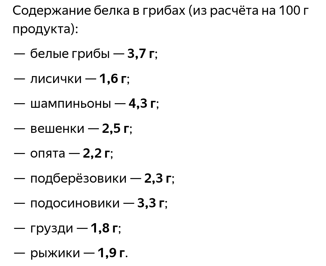 >>738204 Ну присутствуют но они плохо насыщают, их скорее для вкуса жрут >>738218 Так ты посмотри сколько там белка, около 5 грамм на 100гр грибов, то есть хуйня)