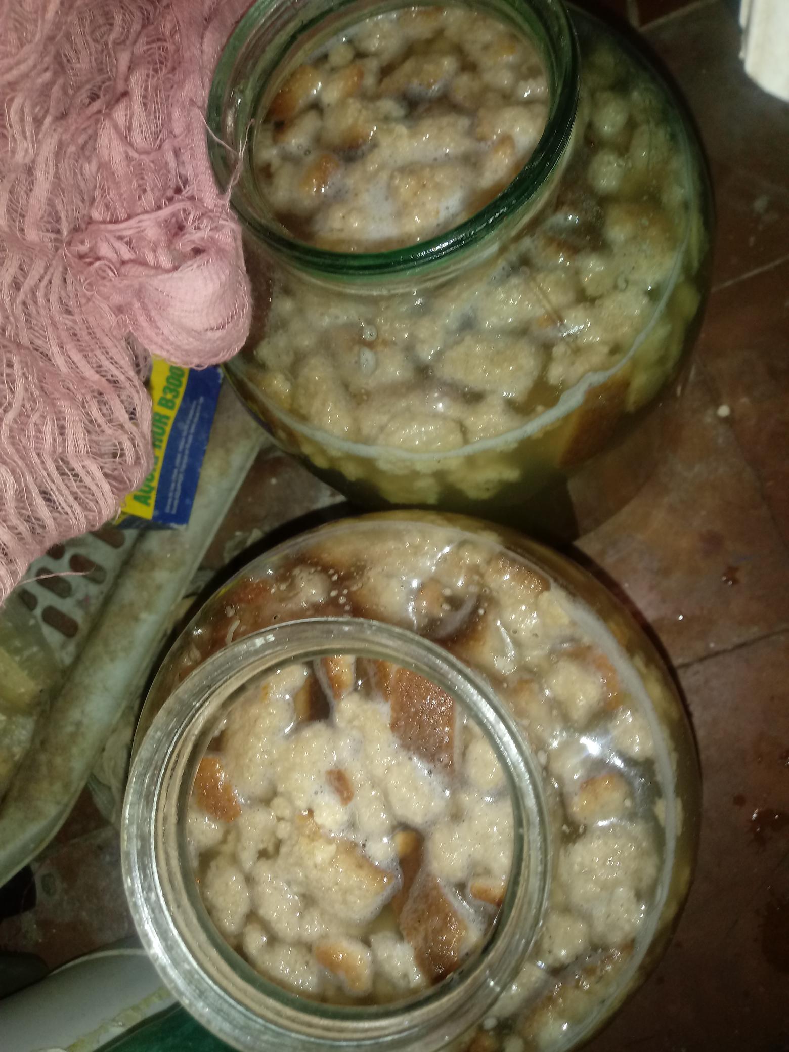 Но делать сука неделю . Терпел долго. Но зато щас получу супер окрошку. Первый тест выдал немного запах алкоголя, но второй раз на моей закваске (она на фото в банке) будет без него.. Пью с удовольствием. По бабкам вышло: хлеб 450 г ржаной с Семишагофа стоил 29 рублей. и сахар. ну изюм пришлось купить еще белый, 65 р большой пакет там же. ВСЁ. Дрожи еще 10р сухие.