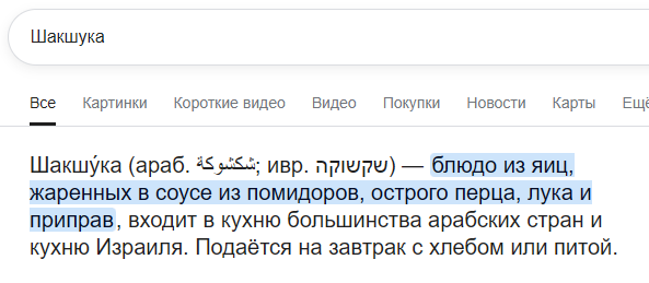 Твоя шакшука буквально яичница с помидорами. И у турков тоже есть такая же хуита. И у мексов это сранч вроде называется или как то так. я тоже знаю слова. Просто признайся, ты услышал 1 единственное вумное слово и форсишь тут. Так вот новость: слов много.