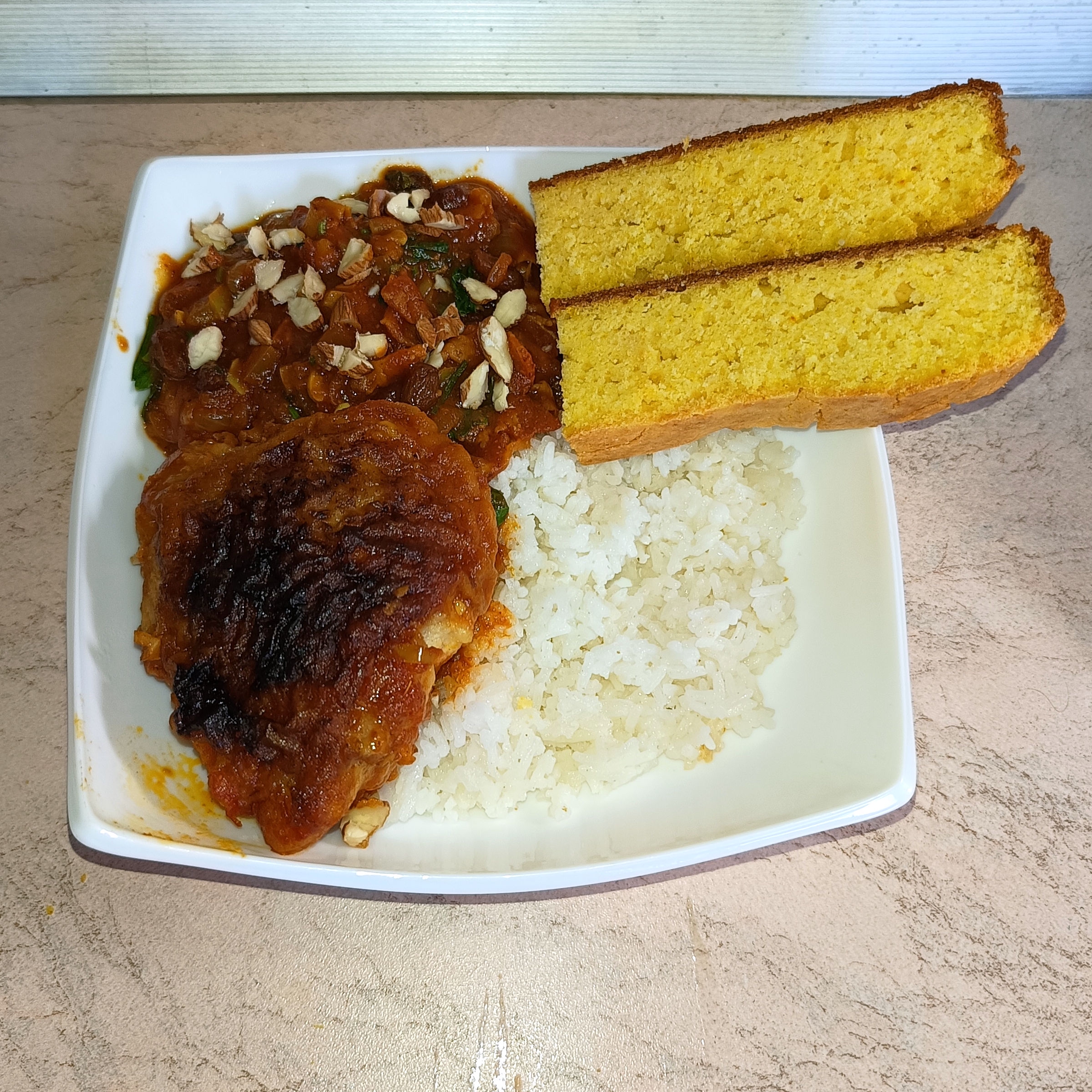 >>745199 >>745205 >Country Captain Chicken — блюдо из курицы типа карри, подаваемое с рисом, популярное на юге США. Имеет индийское происхождение и было завезено в Соединенные Штаты через Чарльстон, Саванну, Нью-Йорк и Филадельфию. >В своём традиционном виде представляет собой стью, приготовленное из обжаренных кусочков курицы, лука и порошка карри. Обычно добавляют миндаль и золотой изюм или чёрный изюм. Многие версии также требуют наличия помидоров, чеснока и болгарского перца. Блюдо подается с белым рисом. За исключением риса, все они должны быть приготовлены в одной кастрюле. Тут я проебался немного по времени в духовке, вот кожа на бёдрах и подрумянилася.