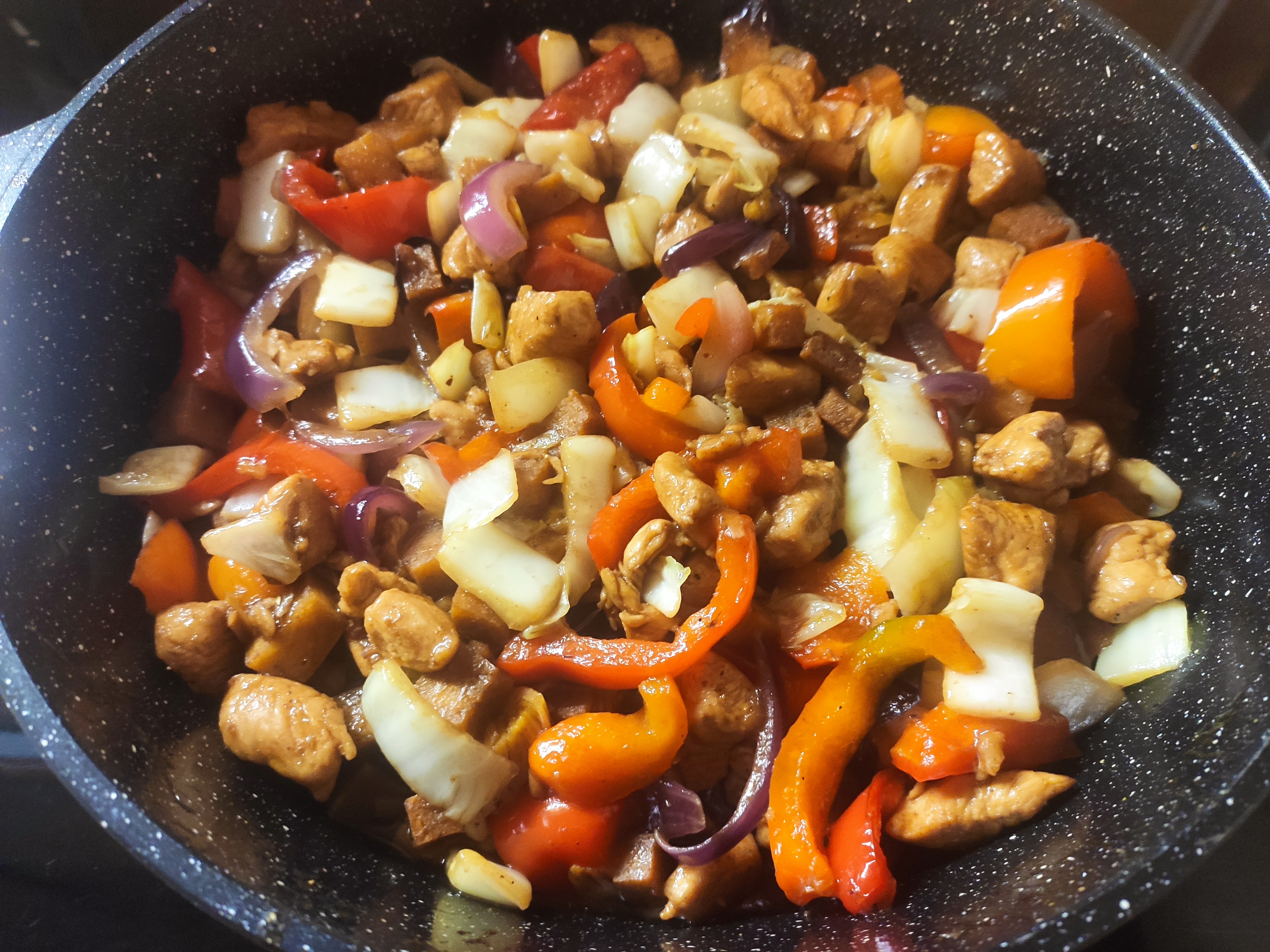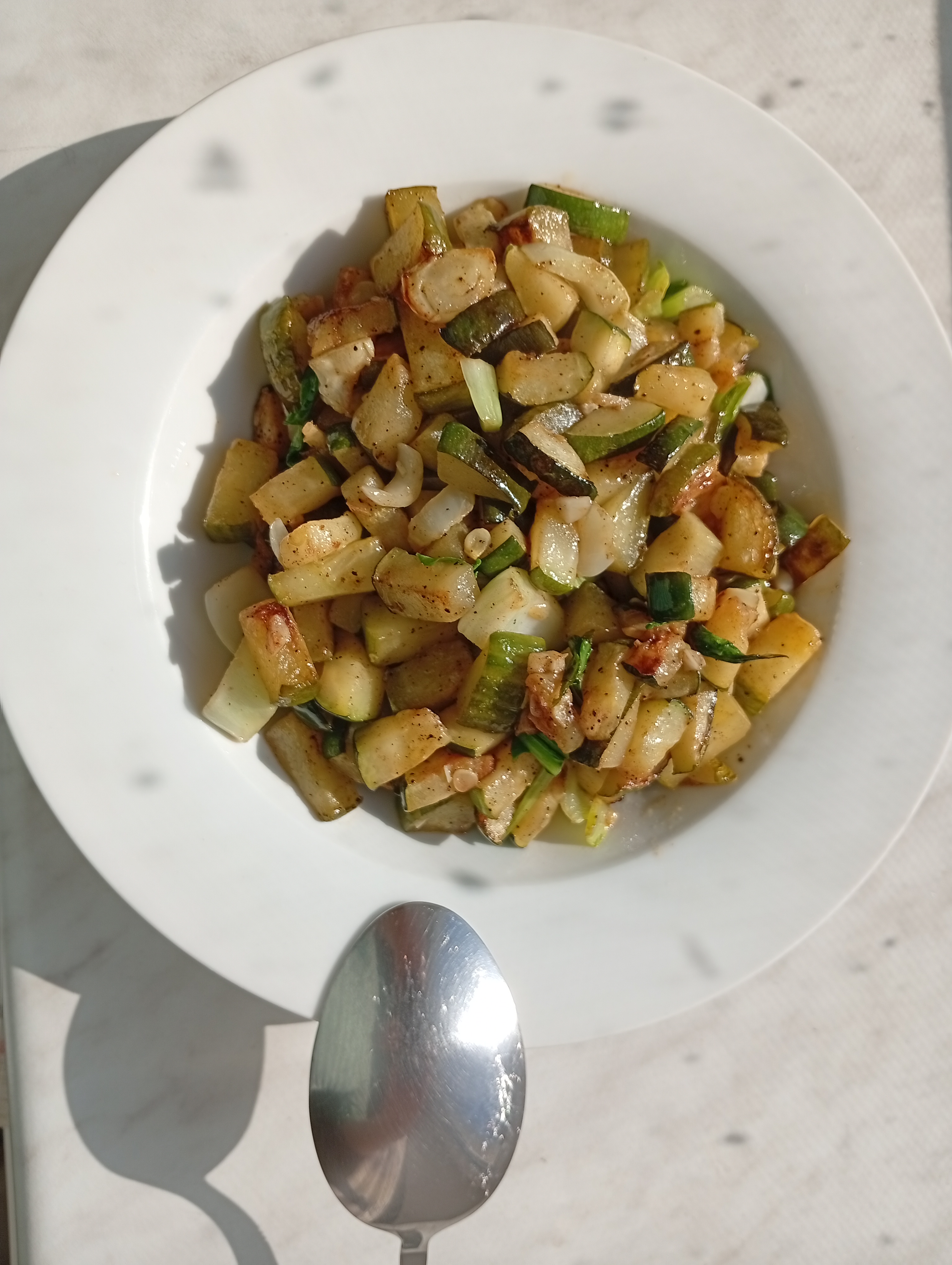 >>746548 Да все гига-просто. Нарубил кубиками кабачки, потом на среднем огне и паре ложек масла жарил их, помешивая раз в 4-5 минут. И так до тех пор, пока они все не подрумянились. Потом добавил порезанную на небольшие кусочки китайскую капусту и еще минут 10 периодически помешивал. Потом дал соль, перец, паприку, мелко порубленный чеснок, и это все еще некоторое время помешал, чтобы все перемешалось и обменялось запахами. Ну а потом можно хрючить