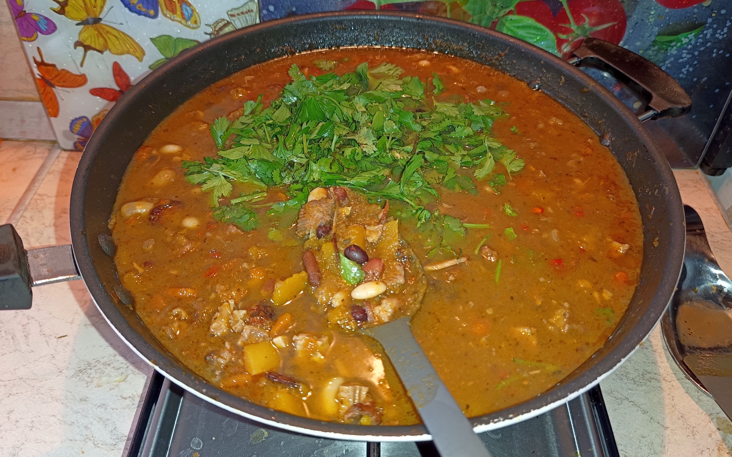 Локро (исп. locro, от языка кечуа ruqru) — густое мясное стью из тыквы, связанное с коренными андскими цивилизациями и популярное в горной цепи Анд. Это одно из национальных блюд Перу, Боливии, Эквадора, Чили, Парагвая, северо-западной Аргентины и юго-западной Колумбии. У меня сегодня оно из фасольки трех цветов, свинских рёбрышек, индюшьей жопы и колбаски. В следующий раз, если соберусь, сделаю с кукурузкой, нутом и картохой.