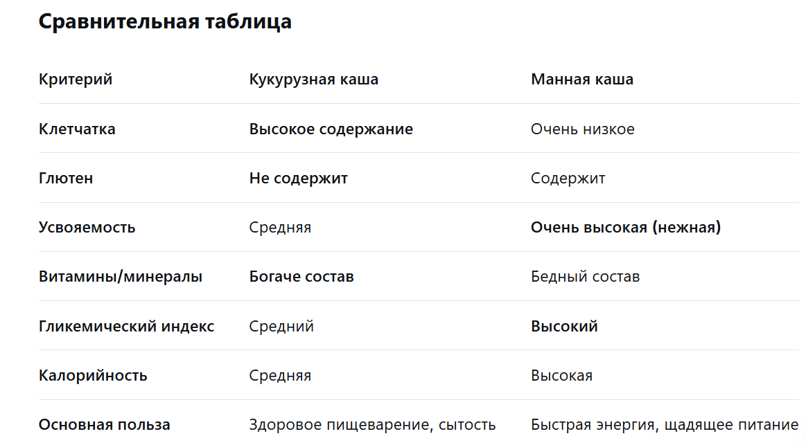 Вывод: что же выбрать? Для регулярного здорового питания, детей и взрослых — однозначно полезнее кукурузная каша. Она обеспечивает организм клетчаткой, витаминами и дает стабильную энергию.