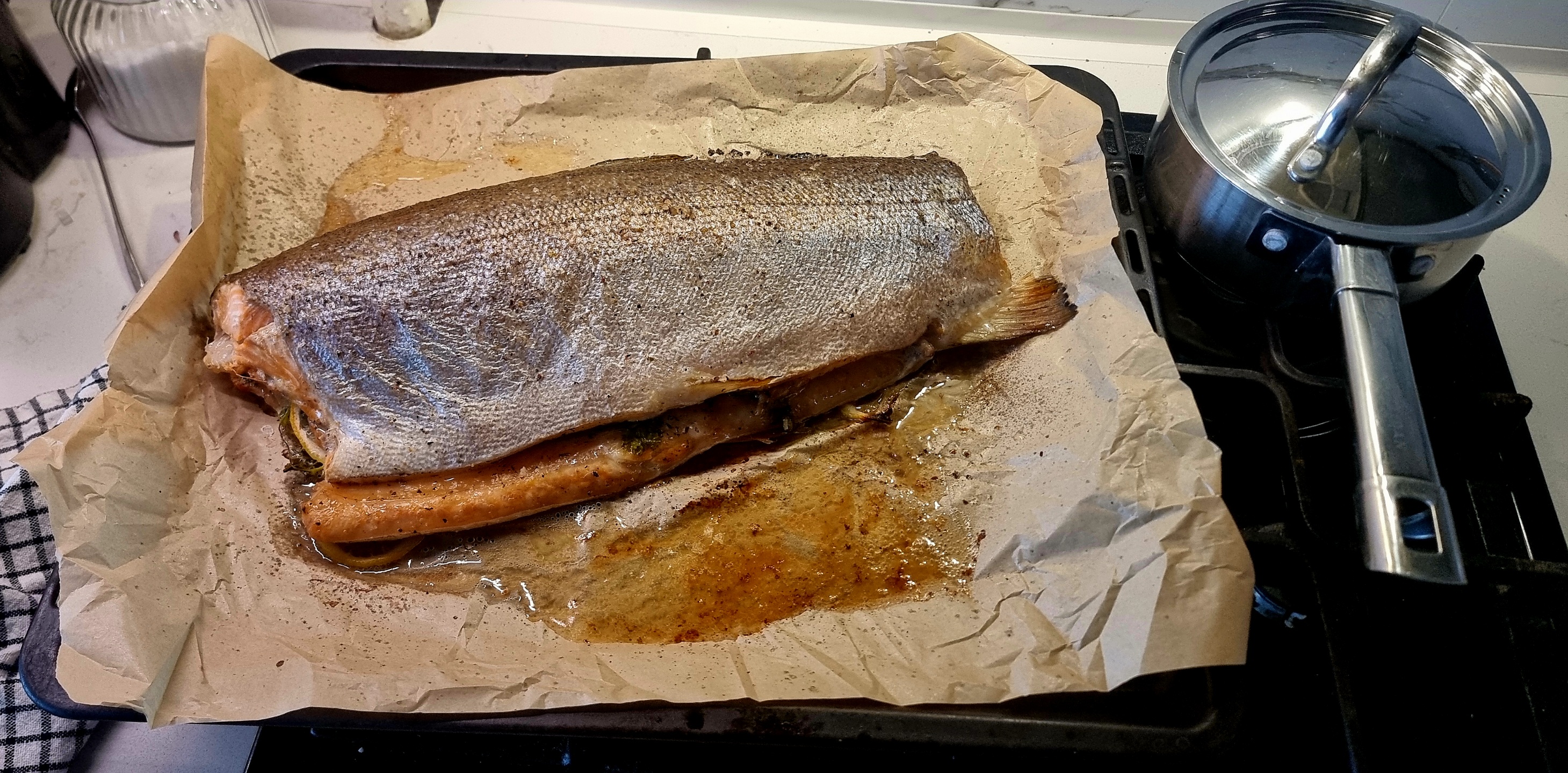 Анонизмасы, нужен совет. Имеется маленький стейчишка из красной рыбы (125 грамм), с одной стороны кожа. Также имеется пакетик специй для рыбы, но там на упаковке нарисована белая рыба, хз подойдет ли он. Специй много всяких, наборов типа итальянские травы/французские травы/етц, и всякого рандомного что мне случайно досталось, от специй для лазаньи до специй для стейка. Как лучше всего приготовить этот стейчик? К нему планирую яишенку из 2 яиц сделать и немножко овощей нарезать как гарнир