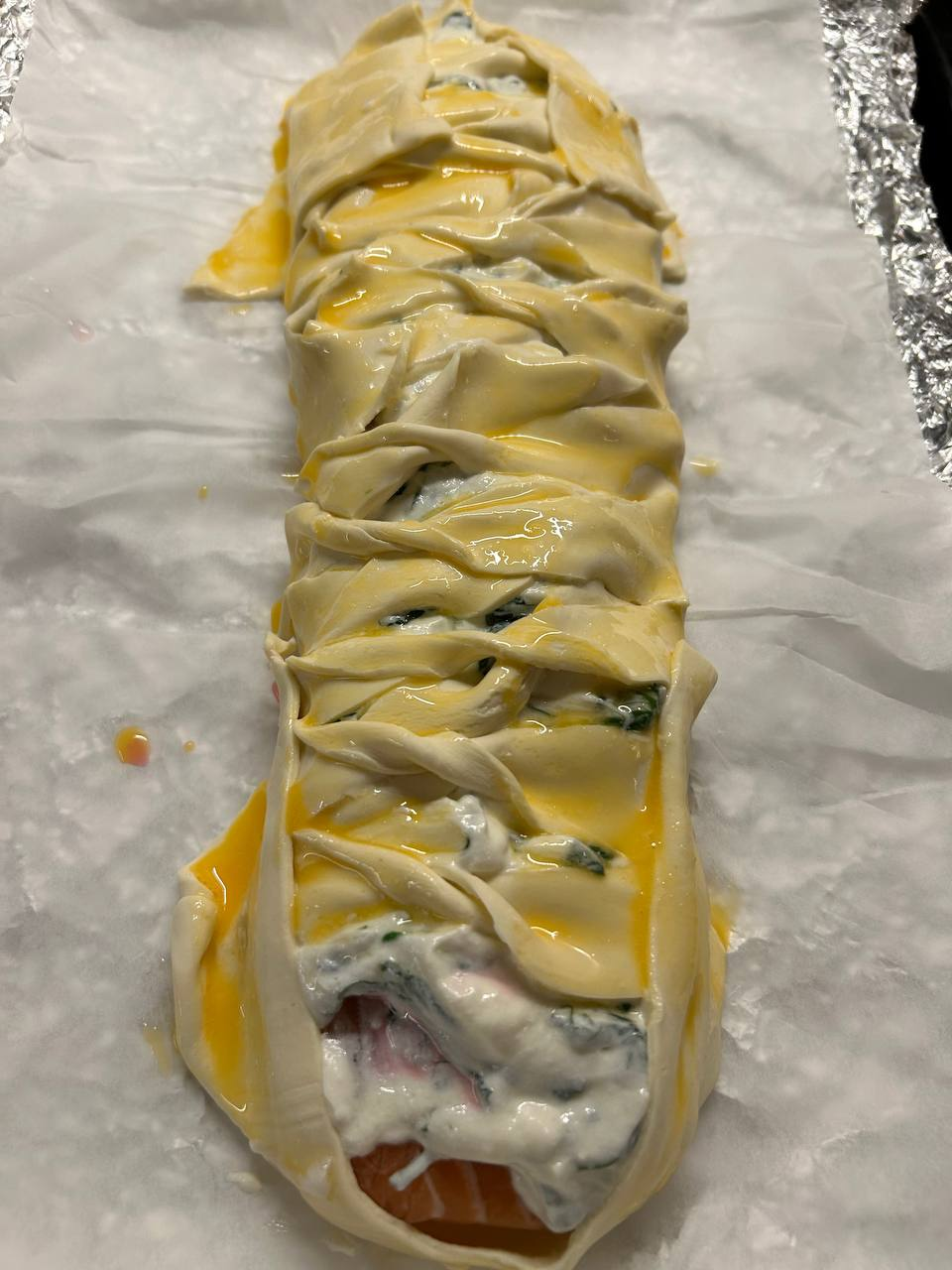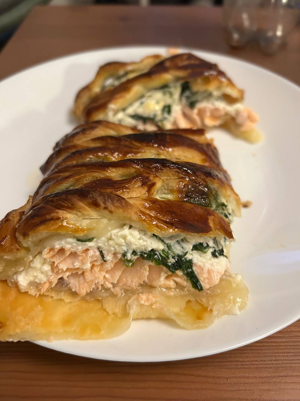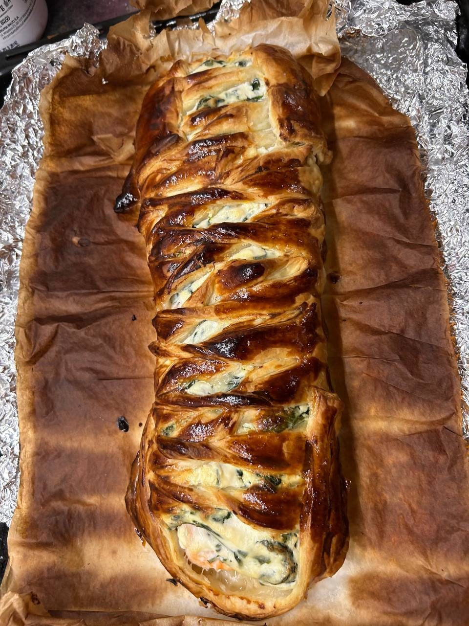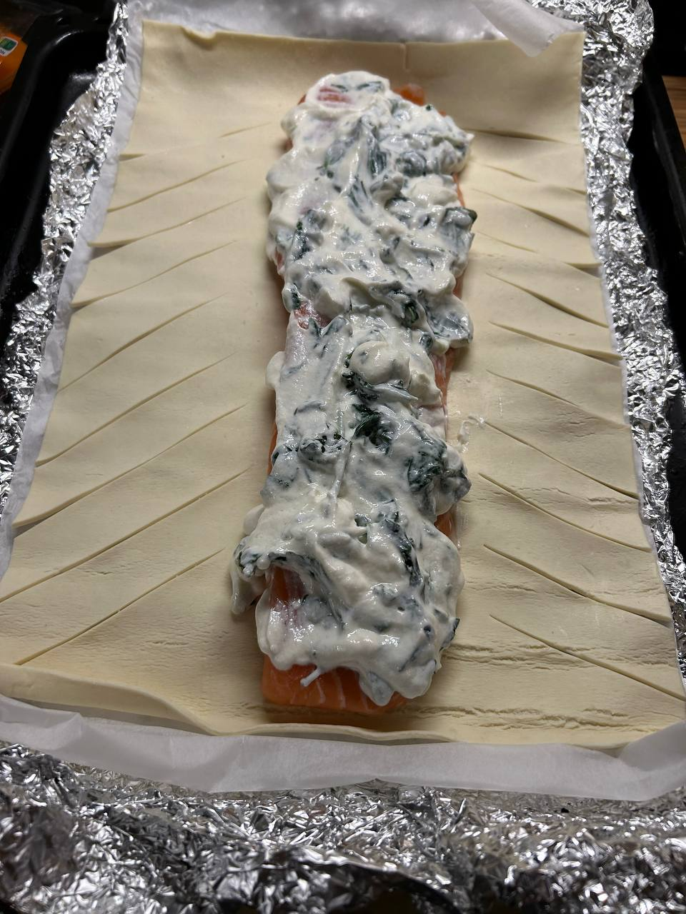 >>746106 Спасибо! Кстати, на самом деле удивительно простой рецепт, если есть доступ к покупному тесту. Жарите на солнечном масле на среднем огне шпинат. Мешаете шпинат, рикоту и соль. Снимаете шкуру с лосося, это можно сделать, окатив его кипятком. Расстилаете тесто, потом лосось, потом смесь. Дальше как на фото, обмазывал яичным желтком. 30 минут на 200 градусов в духовке, готово! очень вкусно, инстаграмно, и очень просто.