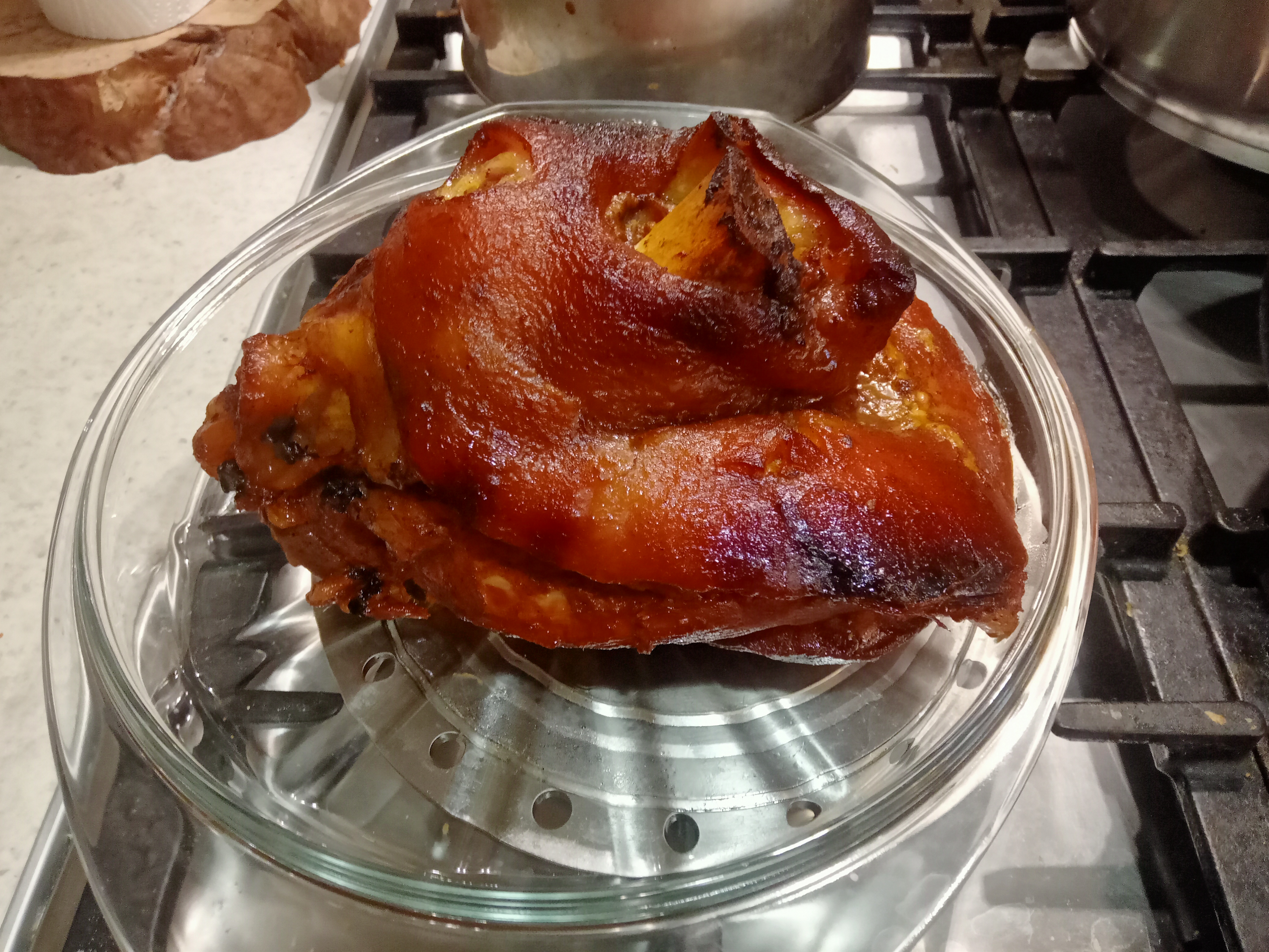 >>746681 >>746681 Спасибо. Рецепт из интернета. Очень простой, шпигуем 4-5 зубчика чеснока, нарезать потоньше. Делаем маринад, две столовых ложки мёда, две ложки соевого соуса, чайная ложка паприки и молотого черного перца, соль по вкусу обмазать и положить мясом вниз на нарезанный лук, пару луковиц. Держим сутки в холодильнике, потом заворачиваем в пергамент и сверху ещё в фольгу, так чтобы не протекало, и на три часа в духовку