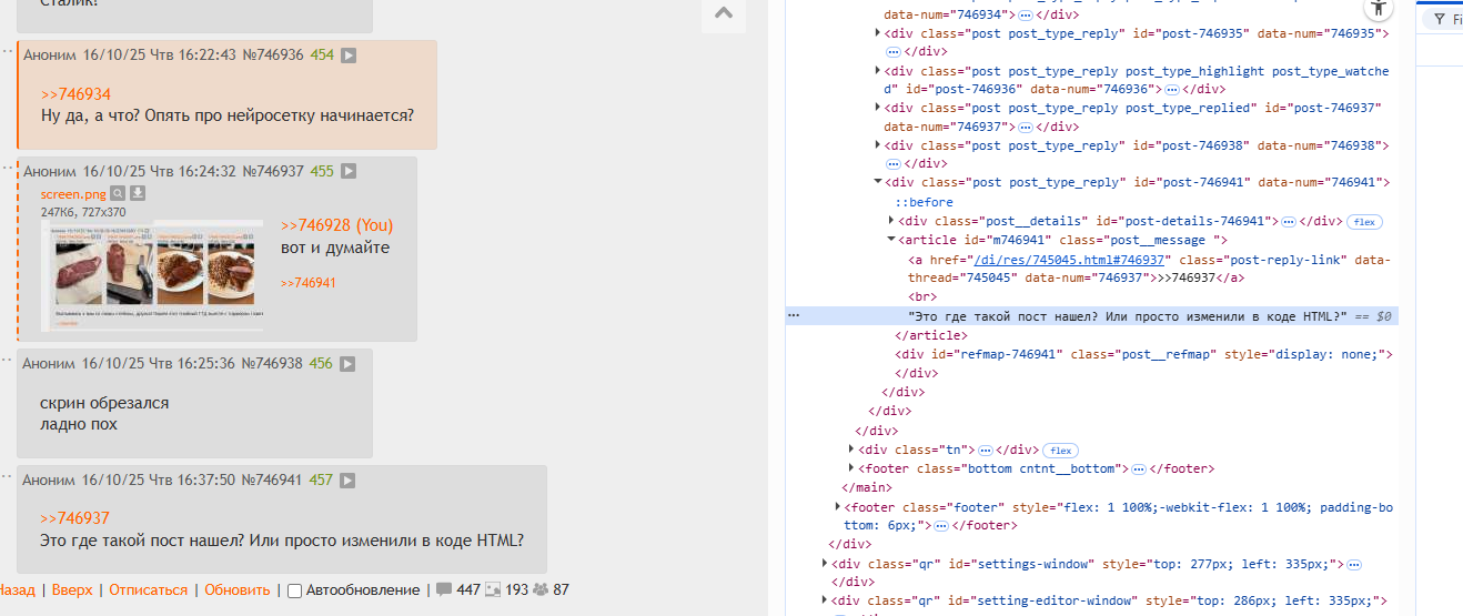 >>745146 >хотя выглядит же На первом пикриле какая-то паутина или сопли на переваренных макаёшках. Вроде бы домашних макаёшках, т.к. они кривые. На втором блин с сосисками и капустой, ну и омлет сверху. >вкусно, не Второе. >>745152 >пробовать пробиться в шапку Штобы што? Внимание с низкой соц. ответственностью ни нужно. Куй контент, не жди орденов с медалями. Это путь достойного анонаса.