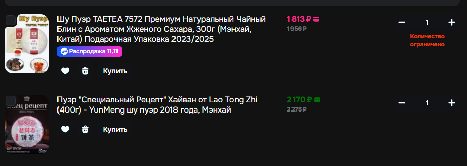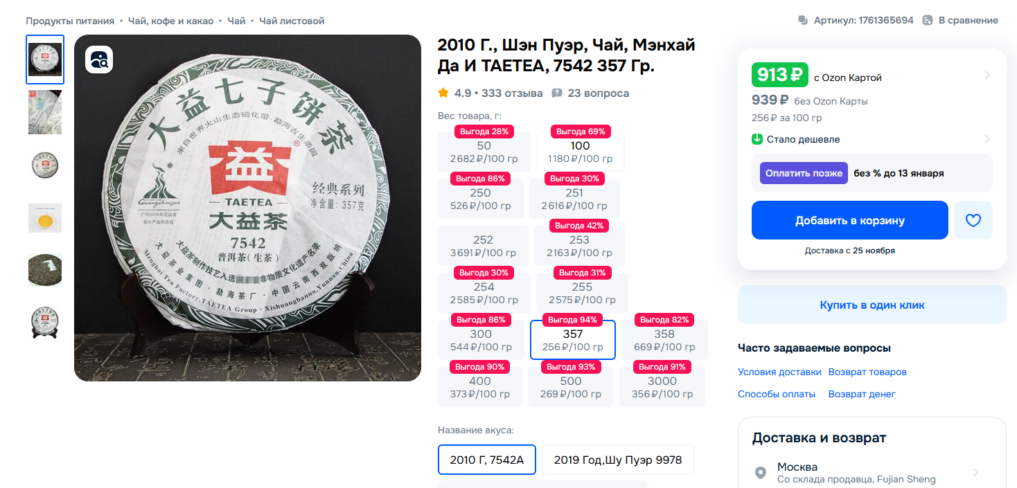 Все остальное на маркетплейсах - гораздо более рандомное, нежели блины-кирпичи пуэров. Если хочется попробоват чего-то реально вкусного, я бы советовал затариться у профильных площадок типа daochai или даже мойчае. Или на кого глаз упадет. С доставкой. Мне в прошлом году на работе задарили мини-коллекцию из 10 сортов мойчая, скажу так, это было оче вкусно и 70% из этого я бы не купил на маркетплейсах, или заебался искать и пробовать. >>750027 Раньше у них таких мемасных не было, сейчас ассортимент расширился, конечно.