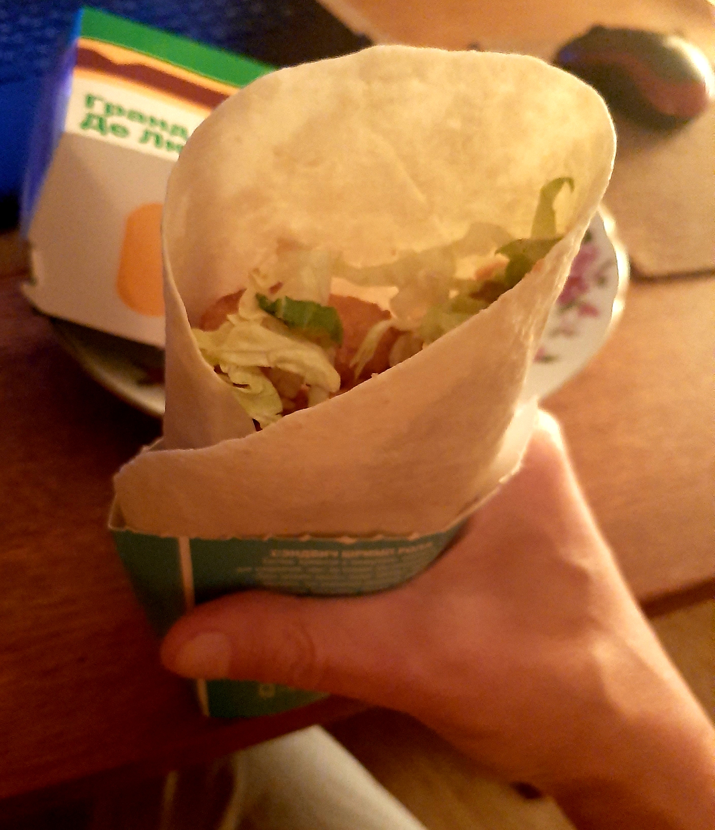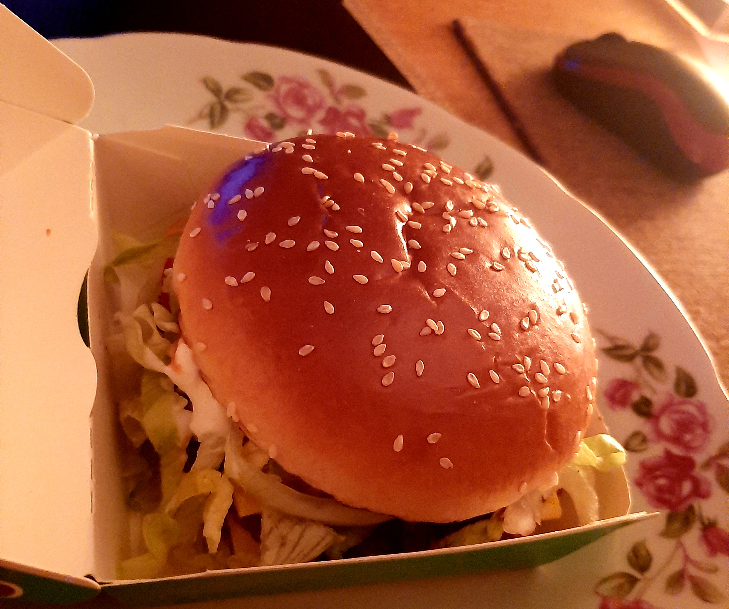 Брал бургер по-мински с курицей, бекон ароматный зажаренный, я охуел от картофельного дранника - я ждал что это будет такое же дерьмо как утренний хашбраун из меню ВиТ, а оказалось это другой по размерам, другой по толщине, более крепкий не разваливается под своим весом на куски как утренний. Прямо крепкая такая картофельная котлета, тот же огуречный соус вроде как и к картошке - все вкусно было, вкус яркий не сухой и не мокрый бургер ничего не течет так как томата нет. Булка приятная на ощупь - шершавая в обсыпке кукурузовой.