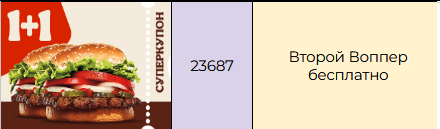 >>751936 Вот же. Это несколько месяцев самый топовый купон в БК, стыдно не знать. Лучшая комбинация в нем это если выбрать 3 цезаря кинга. То есть будет 1350 ккал за 350 руб, или 3,86 ккал/руб. Но я обычно выбираю 1 воппер джуниор и 2 цезаря кинга, там получится немного меньше ккал, но зато не скучно жевать одни цезари кинги
