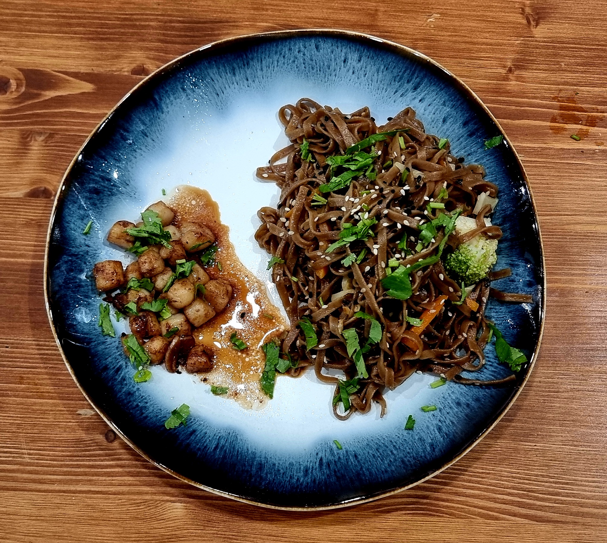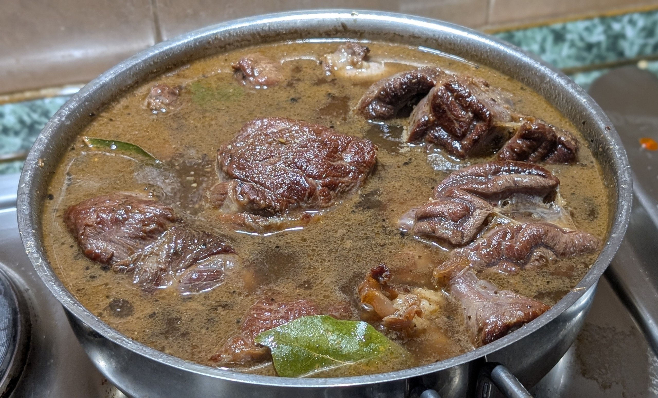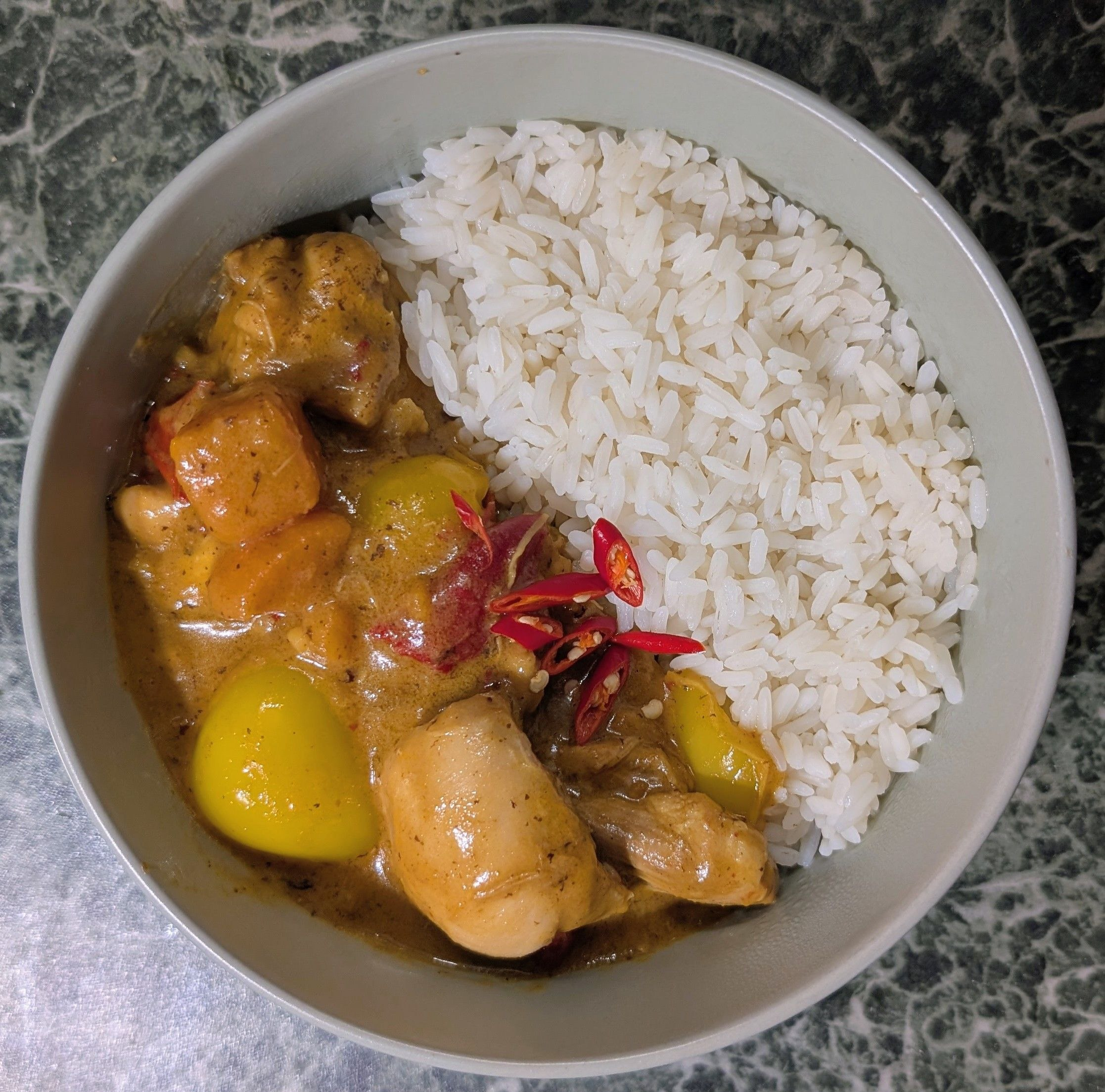 >>756901 >Желтое на втором - это такой длинный не разрезанный кусок перца Это большие КУБИКИ перца >Ну и накладывать в карри морковку и прочее - это вообще рагу какое-то, новояз, а не классические курри Это батат и да, это ближе к японскому варианту карри райсу >Чо так "мало"? Костей же нет, а ты часами... Ну и почему не в кастрюлевиче, видно же, что с боков убегало, а верх сухой, не погружен в соус. Томится не из-за костей, а чтобы мясо можно было есть ГУБАМИ. Кастрюлевич нужен для того, чтобы была меньше площадь выпаривания и жижа не убегала. А моём случае это не нужно - жидкость уварилась на 3/4, в оставшейся подливе я тушил обжаренные овощи и нут, потом всё смешал с мясом.