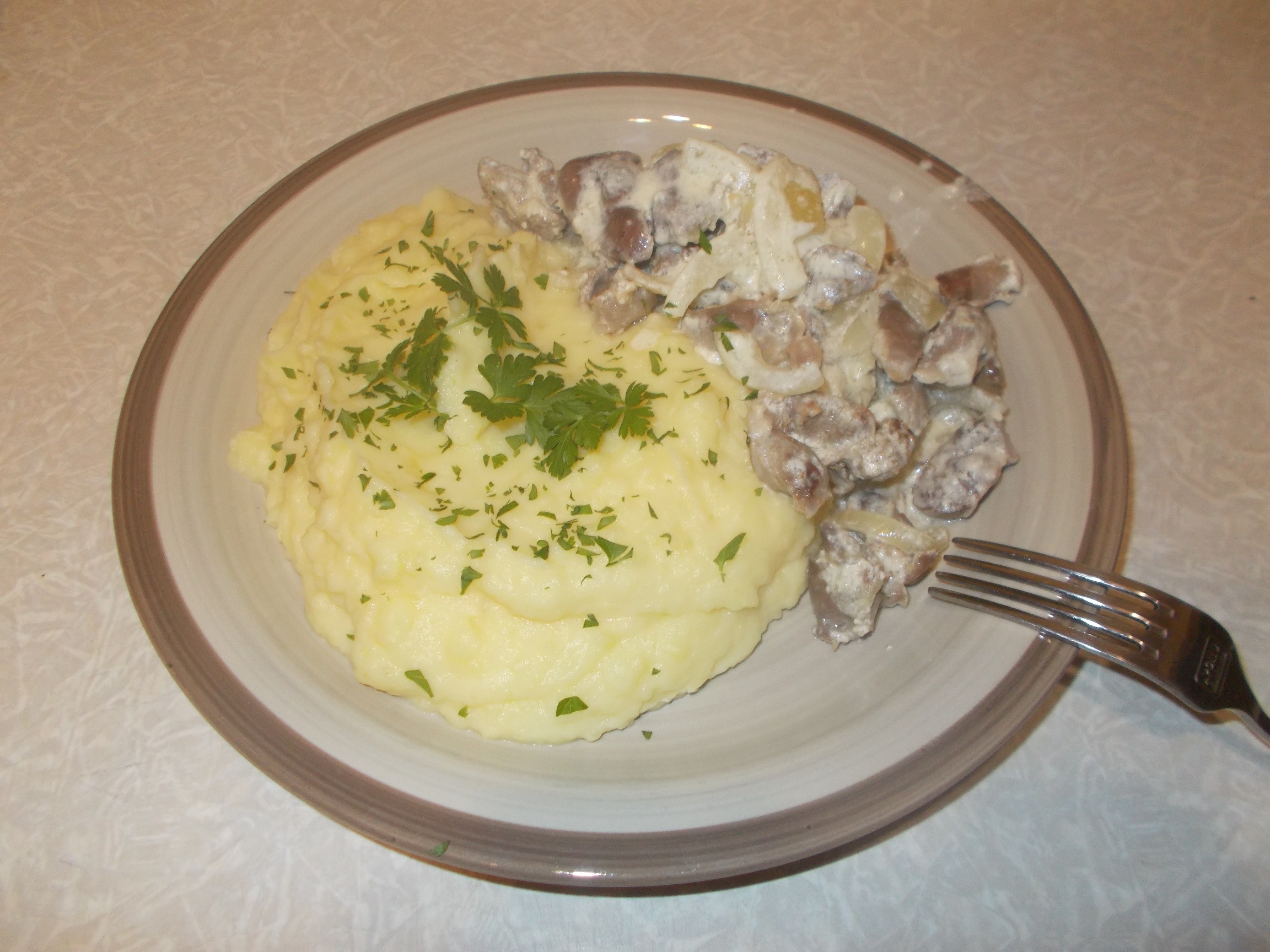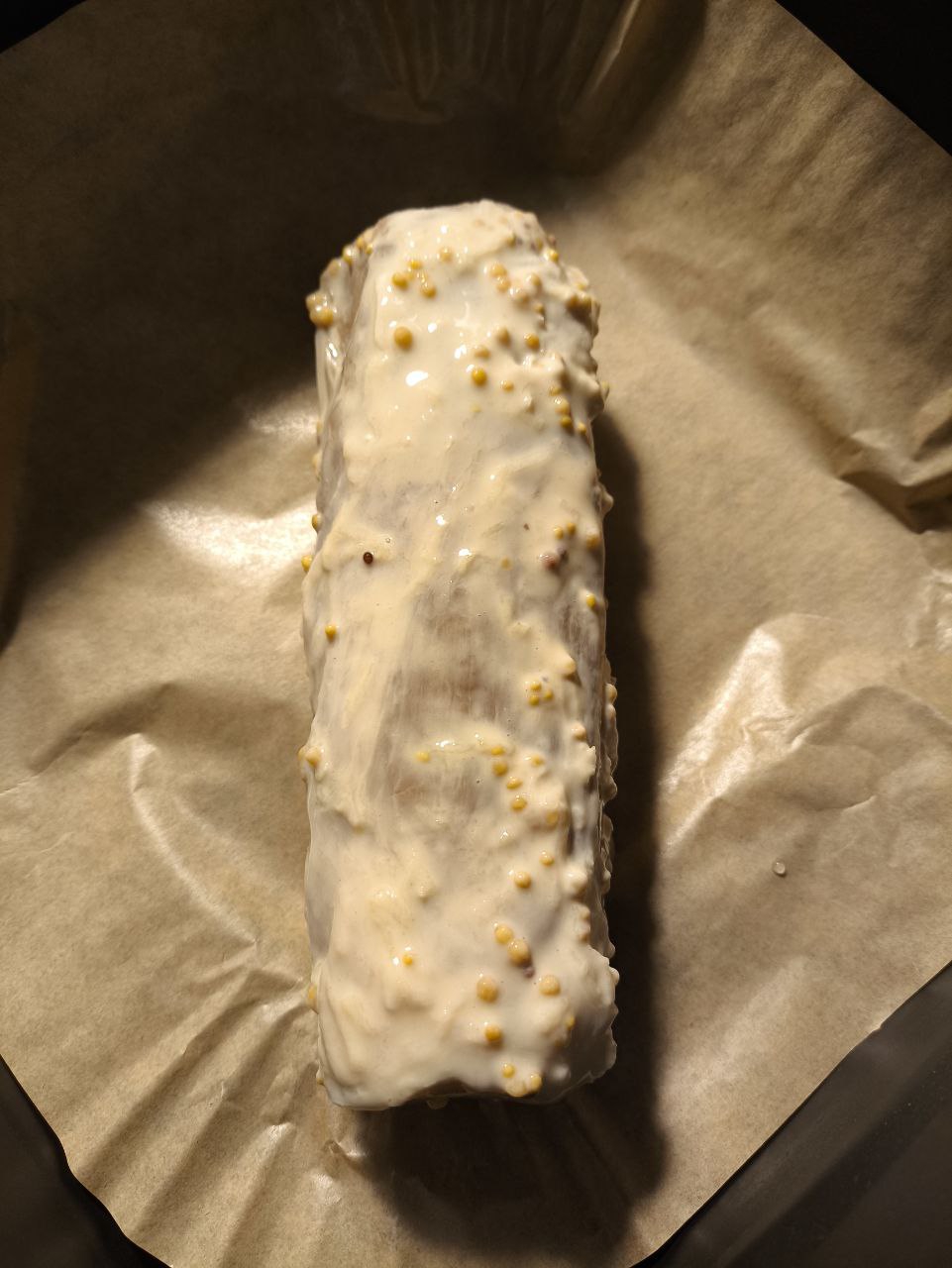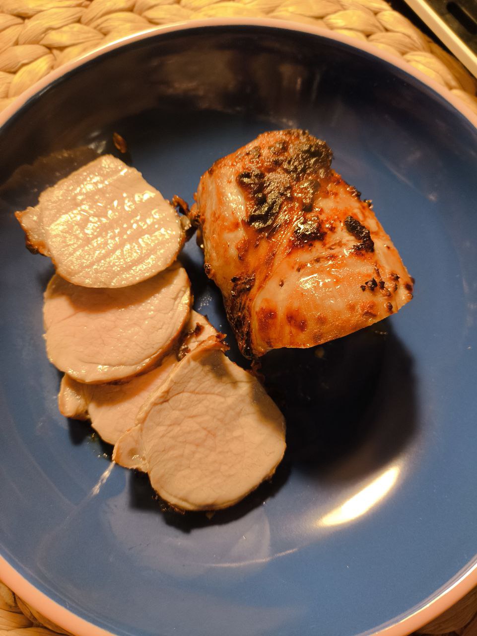 Буженина в горчично-мёдовом маринаде+сметана,2 дня в холодильнике лежала,вчера в аэрогриле запёк за 30 минут. Суховатая т.к. это свиная вырезка,но маринад мне понравился. Сегодня обед на работу: пюрешка и минтай томлёный в сметане с морковкой.