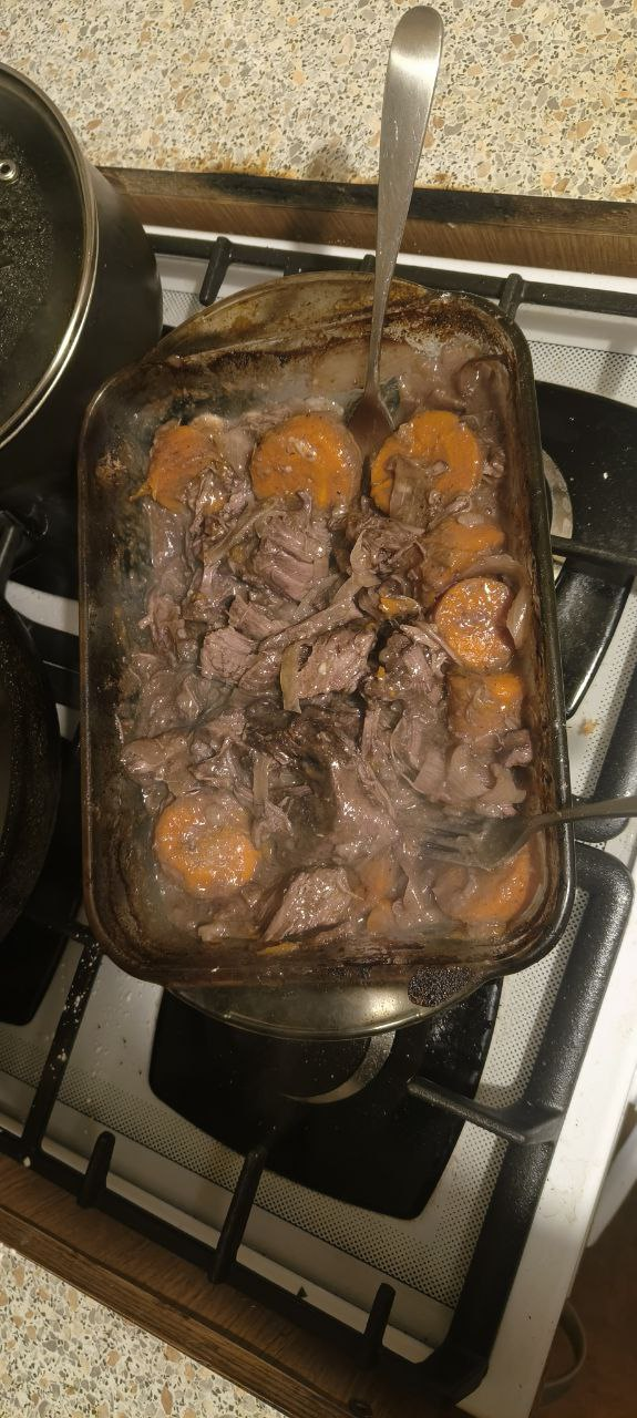 Охрененно вкусное хрючево! Рваная говядина. Томил 2.5 часа в вине и приправах. Потом крахмалом соус загустил, порвал всё и оставил без крышки томиться ещё час, чтобы всё загустело и пропиталось