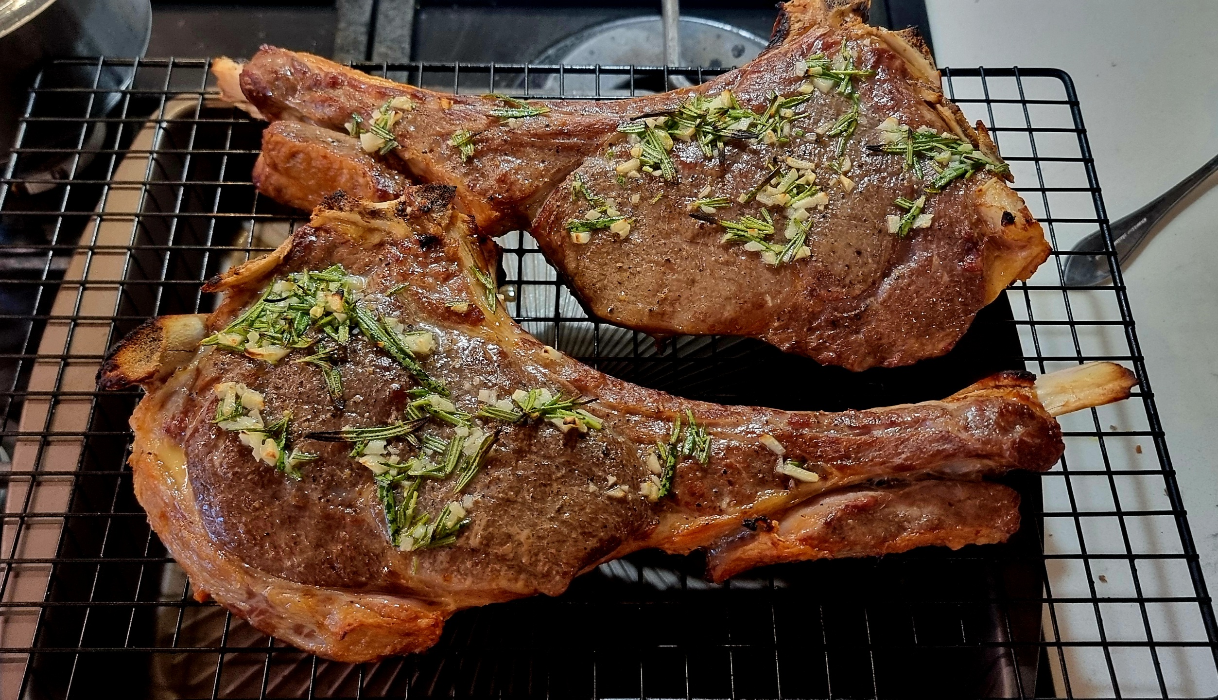 Купил на рынке говядину. Обычно выходила жестковатой, потому сувид. Кремниевый друган посоветовал сначала посолить и на решеточке на ночь оставить в прохладном месте. Потом сувид 4 часа при 56С. Так как в сковородку не лезло, то корочку в духовке делал: непосредственно под гриль, 300С + вентилятор на три минуты сторону. В конце сверху сливочное масло, чеснок и розмарин.