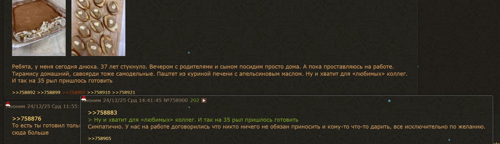 >>758883 > Ну и хватит для «любимых» коллег. И так на 35 рыл пришлось готовить Симпатично. У нас на работе договорились что никто ничего не обязан приносить и кому-то что-то дарить, все исключительно по желанию.