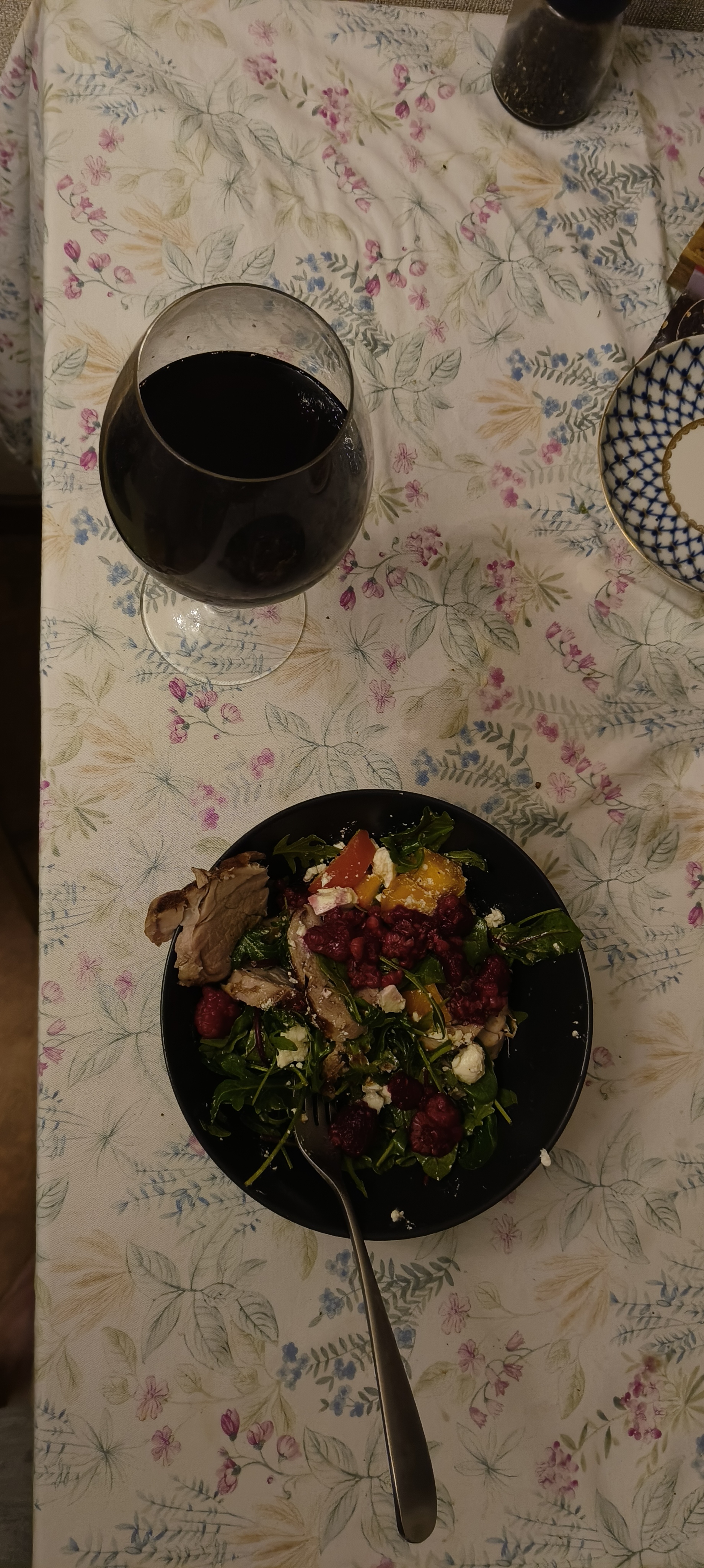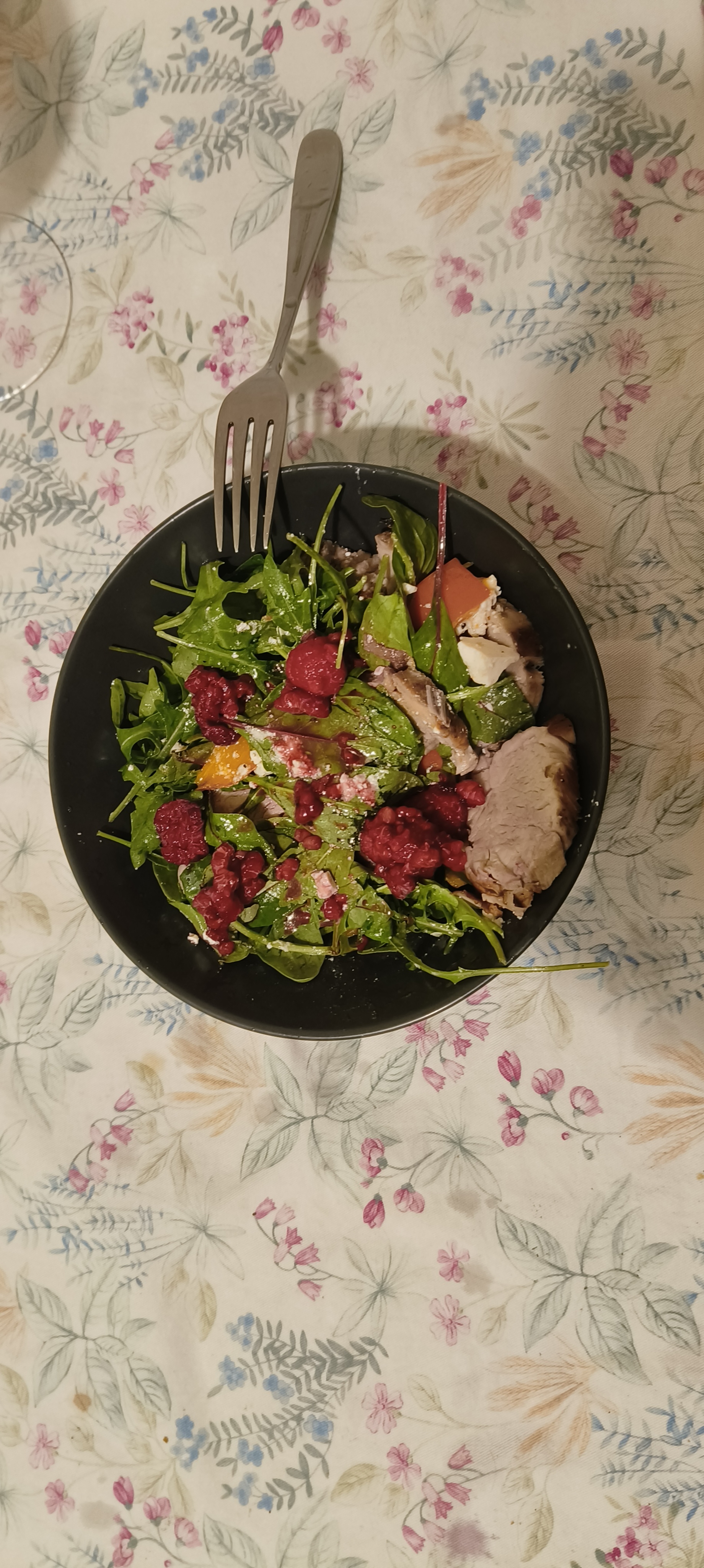 Вчера придумал салат. Ростбиф слайсами, хурма кубиками, накрошенная фета, зелень (руккола), заправка из оливкового масла и бальзамического сладкого сиропа. Малина сверху в качестве украшений и дополнительной кислоты. Получилось вкусно.