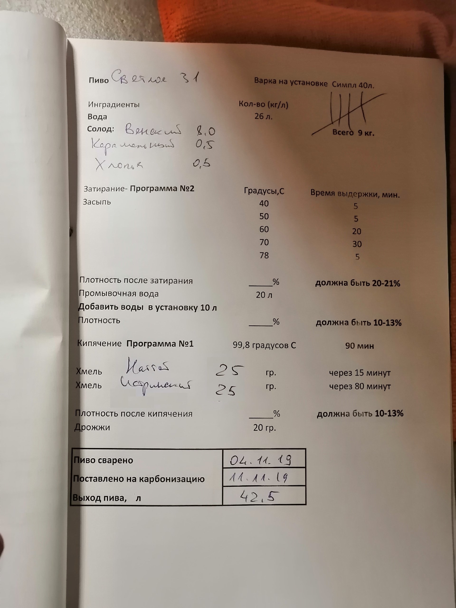 По делу как происходит. Солод мелю 9кг. Солод юзаю курский п.4. Засыпаю в воду комнатной температуры (26л) солод затирается около 2х часов с паузами( честно хз какими, но до 80 градусов) затем я все сливаю в кастрюлю 37л с фальш дном. Начинаю фильтровать сусло через дробину, пока оно не будет более менее прозрачное с отблеском. Затем пропускаю через эту же дробину 20л горячей воды. Параллельно с этим заливаю в ту же установку еще 5л воды. Профильтрованое сусло греется до 98 градусов (с открытой крышкой все время, ибо если сразу закрывать, пена ебашит через колонну) после закипания жду 15 минут, бросаю 1 хмель, теперь уже закрываю и ставлю колонну на охлаждение. Спустя еще 65 минут бросаю второй хмель, доливаю около литра воды, довожу до кипения, выключаю. Наггет 12% Истринский 4% Каскад 6.5%. Начинаю потихоньку охлаждать до 40 градусов.