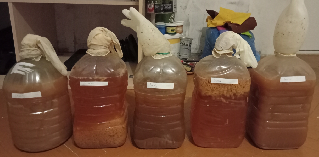 Сидр 1 - кисляк, сухарь, мне не понарвился. Хотя знакомые любители сухого вина похвалили. Без вкусовых добавок. На вкус как сухой яблочный сок. На запах как яблочный сок. Очень летник приятные ароматы, в запахе нет алкоголя. Сидр 2 - получилось что-то типа крепленого вина. Очень алкогольный. В процессе хранения появился какой-то странный сладкий привкус который мне не нравится. Особенно сильно ощущается на выдохе после глотка. Какая-то то ли помада, то ли духи, будто облизал милфе шею которую час назад побрызгали духами. Странно короче. Глинтвейн получается хорошим только при добавлении вкусовой основы - компот, сок, концентрат. Без этого получается пряный сидр, пьется хуже чем нормальный глинтвейн. Сидр 3 - кисляк. Почти не отличается от первого, но с добавками. Добавки как оказалось особо не сыграли роли на такой объем. Сидр 4,5 - абсолютно лучший сидр что я пил в своей жизни, ни один сидр с ним не сравнится, настоящий мед поэзии. Это объект моей максимальной гордости и удовольствия от проделанной работы. По сути одинаковые, но по какой-то причине в процессе брожения чуточку отличаются. Один чуть кислее, другой чуть слаще, но основа вкуса одна и та же. Сладкий, с отваром трав, малиной, медом. Приятный запах, приятный вкус, тащатся абсолютно все, мужчины, женщины, взрослые и дети. Очень надеюсь, что как минимум смогу повторить что-то такое же в будущем. Сидр 6 - медовый сидр. По сути медовуха. Тоже очень хорошо получилось, субъективно лучше чем все что я в прошлом году пробовал из медовух в разнице. Обидно что мало, потому что я пожалел тратить на алкоголь много меда.