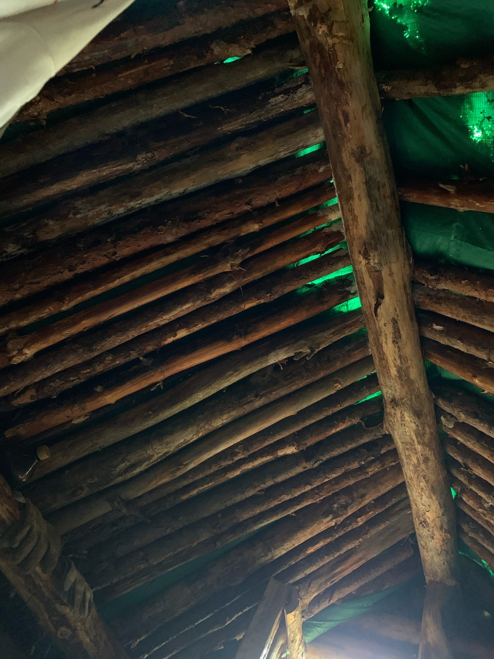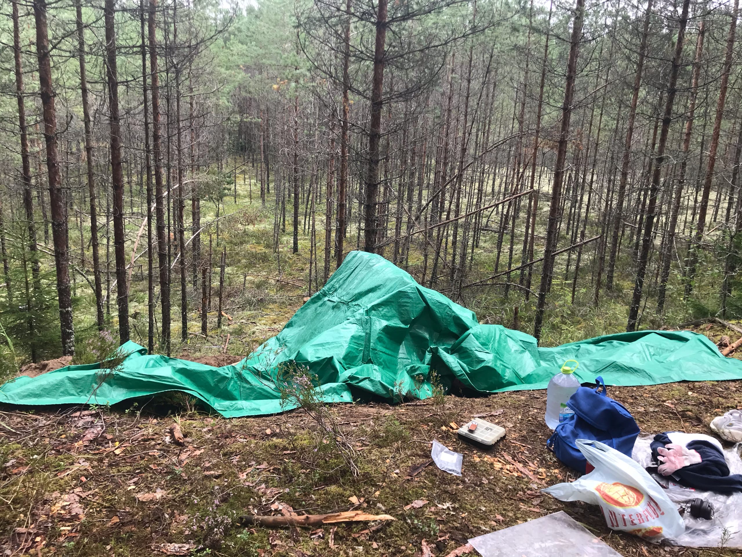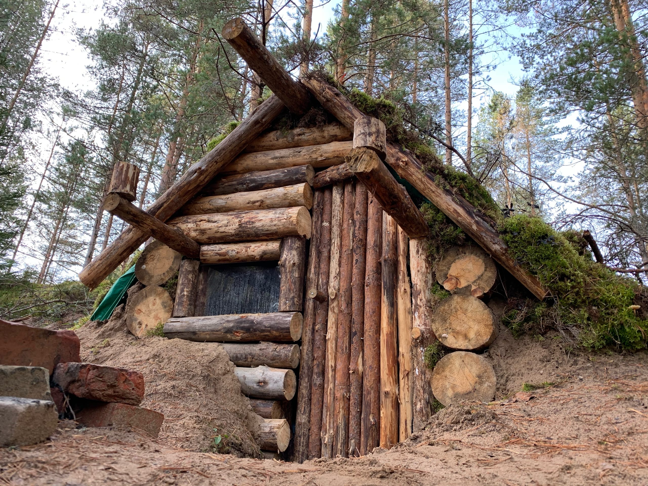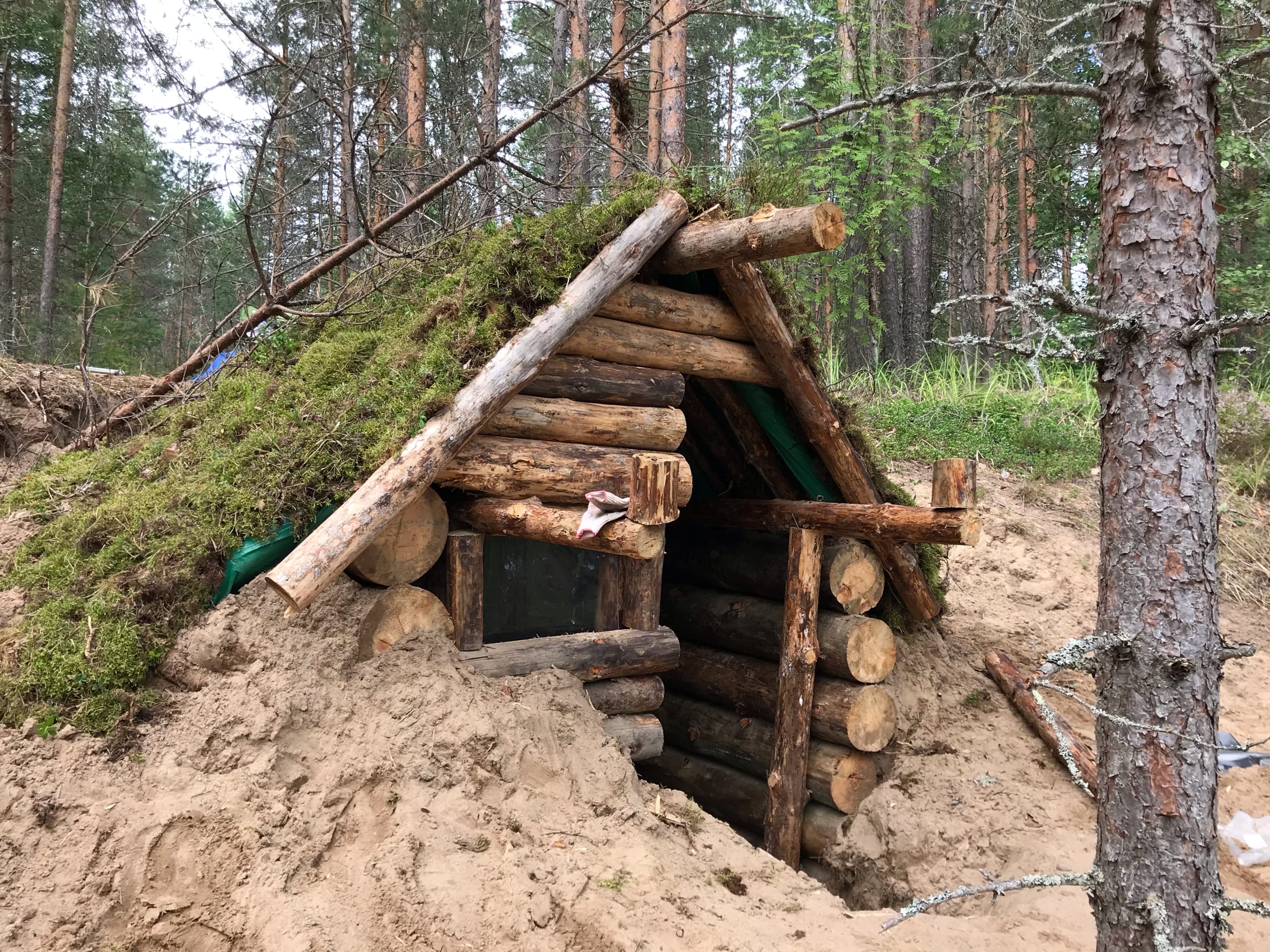 -Помимо топора, лопаты и гвоздей пришлось прикупить строительный тент, чтобы защитить крышу от дождя. -Для скрытия уродливой зеленой хуеты нарвал под трассой мха. -Пластиковое окно-бойница, как в толче у бабки в деревне, спиздил с ближайшей помойки. -Сколотил дверь