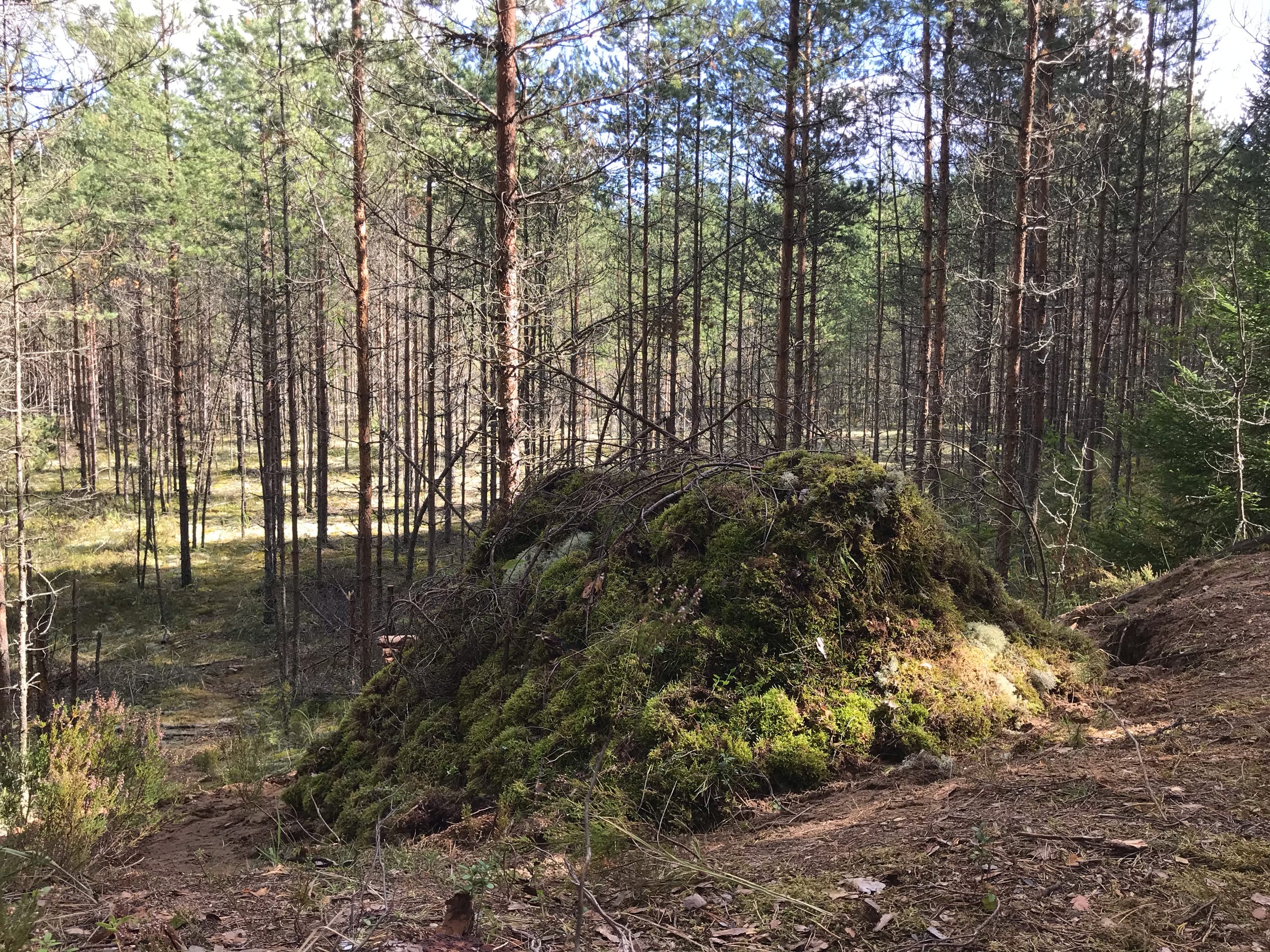Небольшой маленький совет, насчет топлива дам, хотя он необязателен для исполнения, ты и так неплохо справляешься. Печь ты не планируешь (пока что), но будь печь, или просто костер, ночевать как я вижу ты планируешь. Нужна ДРОВНИЦА небольшая, почему? Дожди. Ты в любой день приезжаешь - у тебя всегда есть сухие дрова на обогрев целой ночи, или днем пищу приготовить по фану, ууух. Когда собираешься покидать землянку, наполняешь дровницу уже нарубленными дровами, даже если они и сырые, подсохнут. Но как мы видим в самой землянке место и так не много, только самое необходимое жизненное пространство, хотя ты в этом и выиграл... хата быстрей протопится, тепло сохранять будет дольше. Так что можно недалеко от хаты, или вплотную, сделать что то типа ящика с крышкой для дров, и замаскеровать его, камуфлировать под ухаб, неровность поверхности, землей вокруг присыпать, округлить форму, сверху на крышку мха, веточек, как обычно. Вот. Это конечно на твой вкус. Что бы ты не на погоду смотрел, блин дождь, че делать, а на желание кайфово заночевать при звездах.