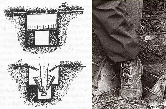 СРАЛЬНАЯ ЯМА Ver. 2.0 - сяральная яма с элементами ловушки, все просто, глубокая яма в которую оп срёт не мение 10 раз, накрывается тонкими ветками, маскируется листьями, распологается по пириметру от землянке на расстоянии 30-40 метров, при попытке мимокрока, алконафта, грибника, подойти поближе, посмотреть, а что это там такое интересное, проваливается в яму с говном по колено, и вот он уже бежит домой менять штанишки. Можно расставить около 5-20 сральных ям ловушек для надежной защиты. Конечно срать придется много, гороха из дома бери побольше. И главное, тренеруй интеллект, мозг, сам запоминай где ямы расположены будут, а лучше составь на бумаге карту и отметь иксом (Х) где у тебя ямы с говном. И главное, не потеряй это карту в лесу, а то грибники начнут искать клад.