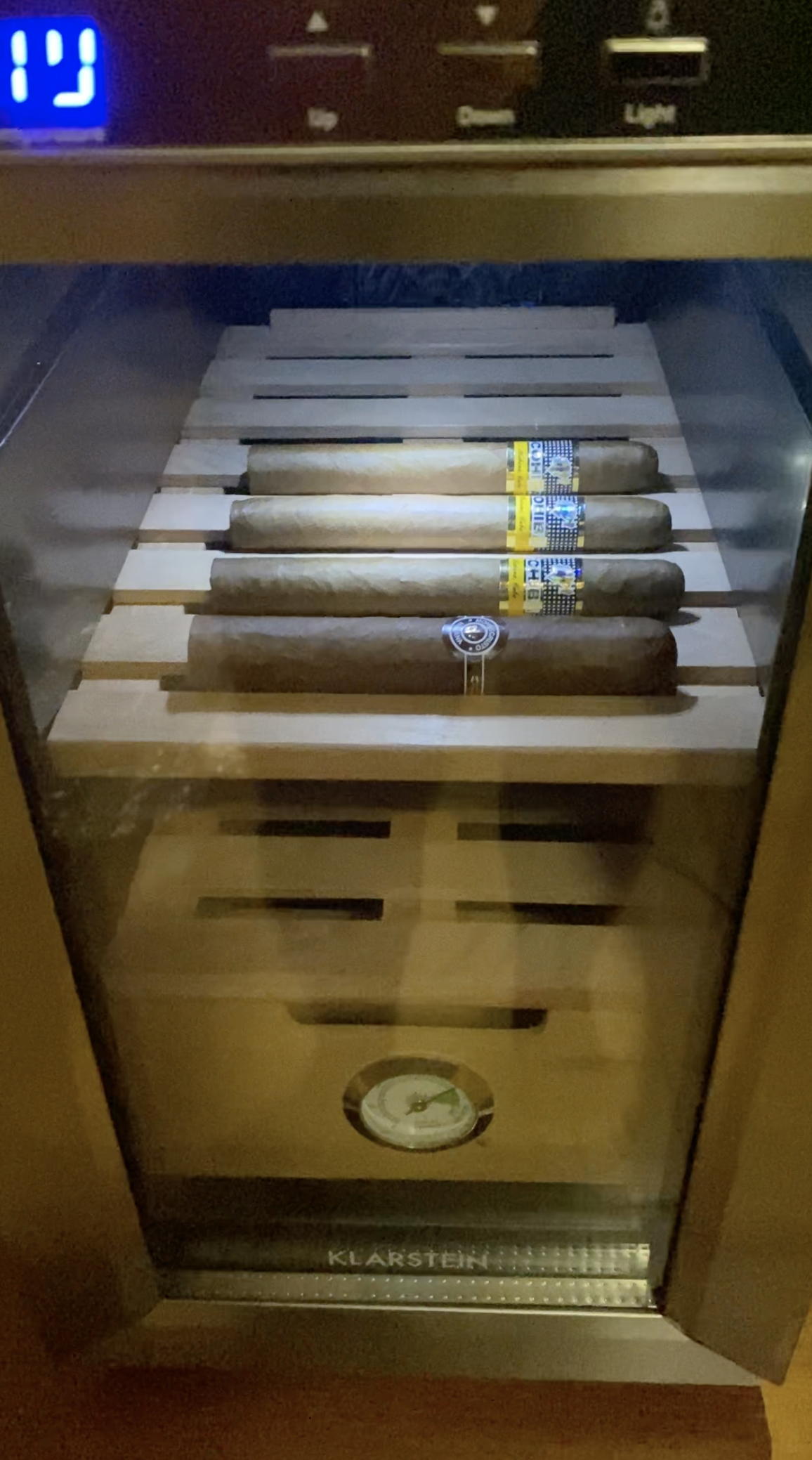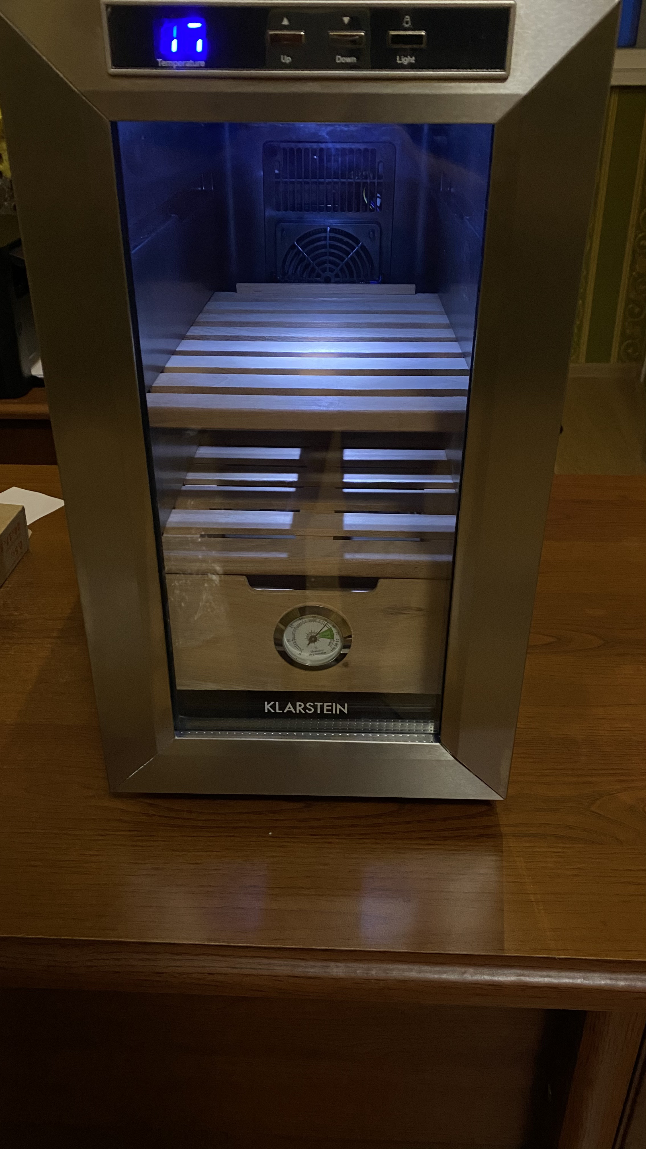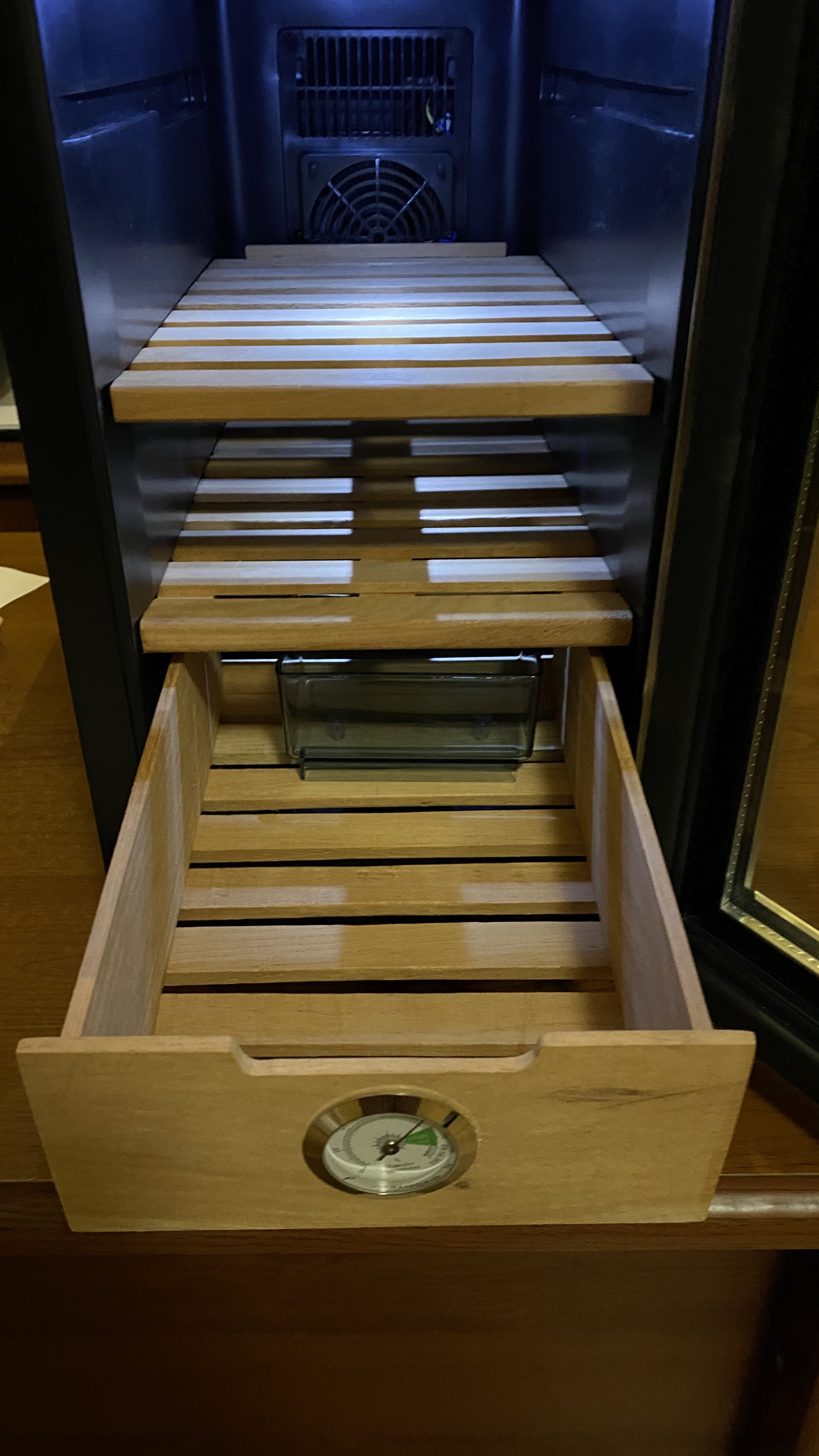 Ну шо, пацаны, хьюмидор? История такова: захотелось купить первый хьюмидор, но очень хотелось на приличное количество сигар и со стеклом. Но, проблема стекла в том, что через пососные стыки с деревом проёбывается влага + цены на них в сигарных магазинах ебанутые. Случайно наткнулся на фотку такой няши и подумал, что такая-то штука будет стоить космических денег, а оказалось, что меньше, чем хлипкие и мелкие хьюмики из спец магазов (180 баксов). Называется Klarstein El Presidente, производитель Кларштайн пилит всякую бытовуху, в том числе и винные холодосы на модулях Пельтье и они решили заменить митолльные полки с формовкой под бутылки на деревянные полки под сигары + кинули пластиковую ёмкость для воды/шариков, в итоге получился хьюмик. Это самая мелкая модель на 23 литра, есть здоровенные дуры, в которые сотни сигар можно разместить(правда горками). Из плюсов вижу то, что: 1. Пиздатое стекло с холодильным уплотнителем и магнитами(1 в 1 ваш бытовой холодос); 2. Подсветка 3. Автоматическое поддержание заданной температуры с помощью модуля Пельтье; 4. Вент внутри, который сдувает тепло/холод с радика, перемешивает воздух в хьюмики, за счёт чего влага и температура распределяется равномерно по всему объёму; 5. Не компрессорный = очень мало шума. Мне пох, ибо он будет стоять в отдельной комнате на 2 этаже, но если ты живёшь в квартире и купишь такой - вряд ли он будет тебе давить на уши. 6. Выглядит штатушнее обычного хьюмика-шкатулки. Из минусов вижу только то, что в нём мало дерева, а некоторые считают, что обмен аромата сигар с запахом испанского кедра - мастхэв фича, но я хз. Когда я его открыл, то с него пошёл довольно сильный запах, идентичный тому, что я ощущал из деревянных хьюмиков, а если забить его хорошенько сигарами, то вообще не проблема, что дерева маловато. Второй минус это размер, похож на в 1.5 раза уменьшенный системник кудахтера. Пока что нравится, посмотрим, как будет себя показывать со временем. Хотел к нему докупить электроувлажнитель, но потом понял, что на такой небольшой объём он и нахуй ненужон. Если в будущем куплю большой Хьюм - куплю автоувлажнялку.
