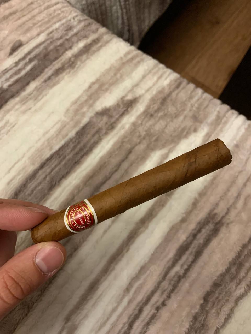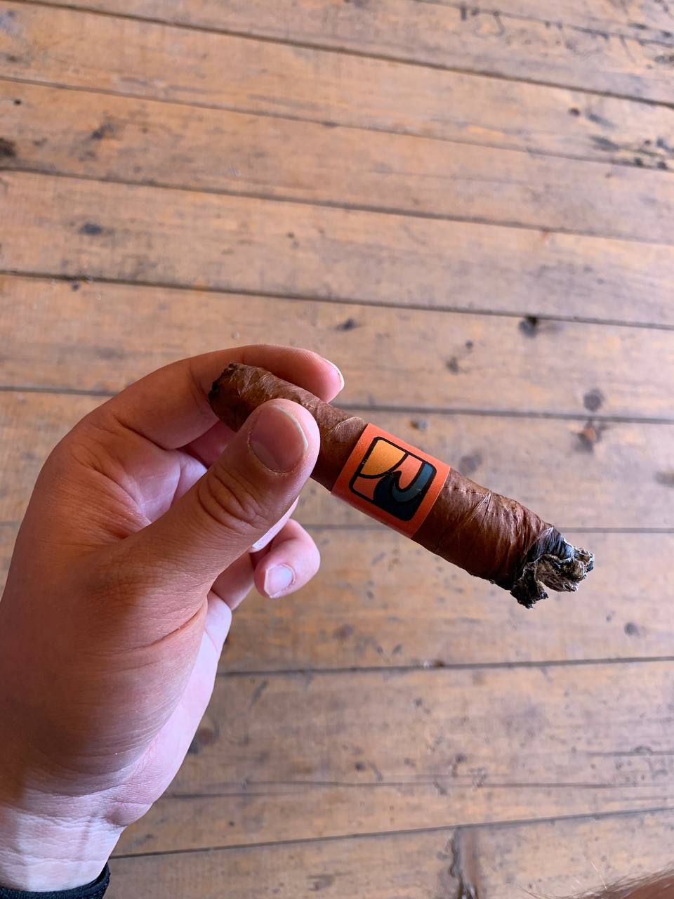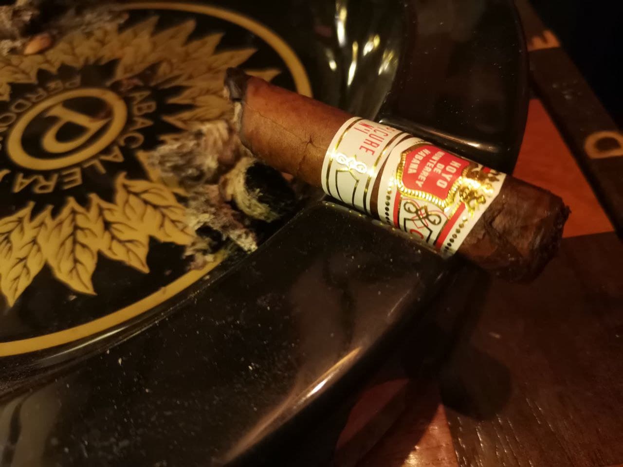 Попробовал сегодня Эпикура 1 от дыры Монтеррея в Че. Приятная сигарка, тяга средняя. Мне даже большевата оказалась, не докурил ибо сильно развезло - больше голодным этого делать не буду. В первой трети была прям черёмуха, потом древесные тона пошли. Из минусов - горение неравномерное было, на пикче видно - угол получился сантиметра в полтора. С любимыми R&J такой херни не бывало. Нравится мне эта фирма.