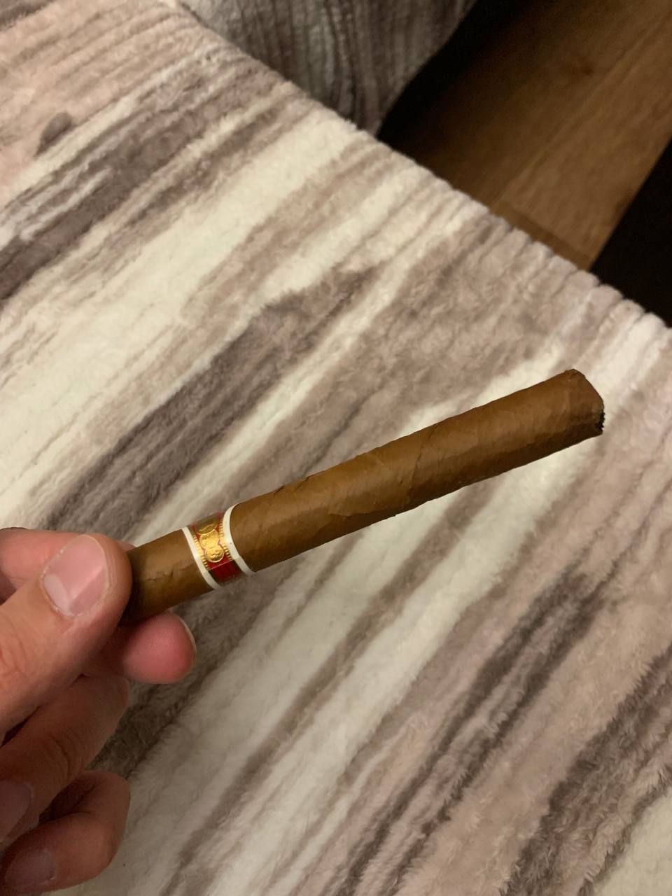 Покурил погара. В этот раз с влажностью кажись ок было: сигара не хрустела и не крошилась особо. Тяга ниже среднего, но пойдет. По вкусу все равно осталось ощущение ароматизированной, но намного меньше чем у прошлой.