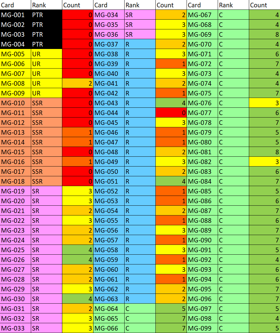 >>823186 Список дубликатов обновился, вскрыл ещё 100 карточек, 3 новых, ни одной PTR. Теперь интересуют карточки MG-001, 002, 003, 004, 005, 006, 015, 018