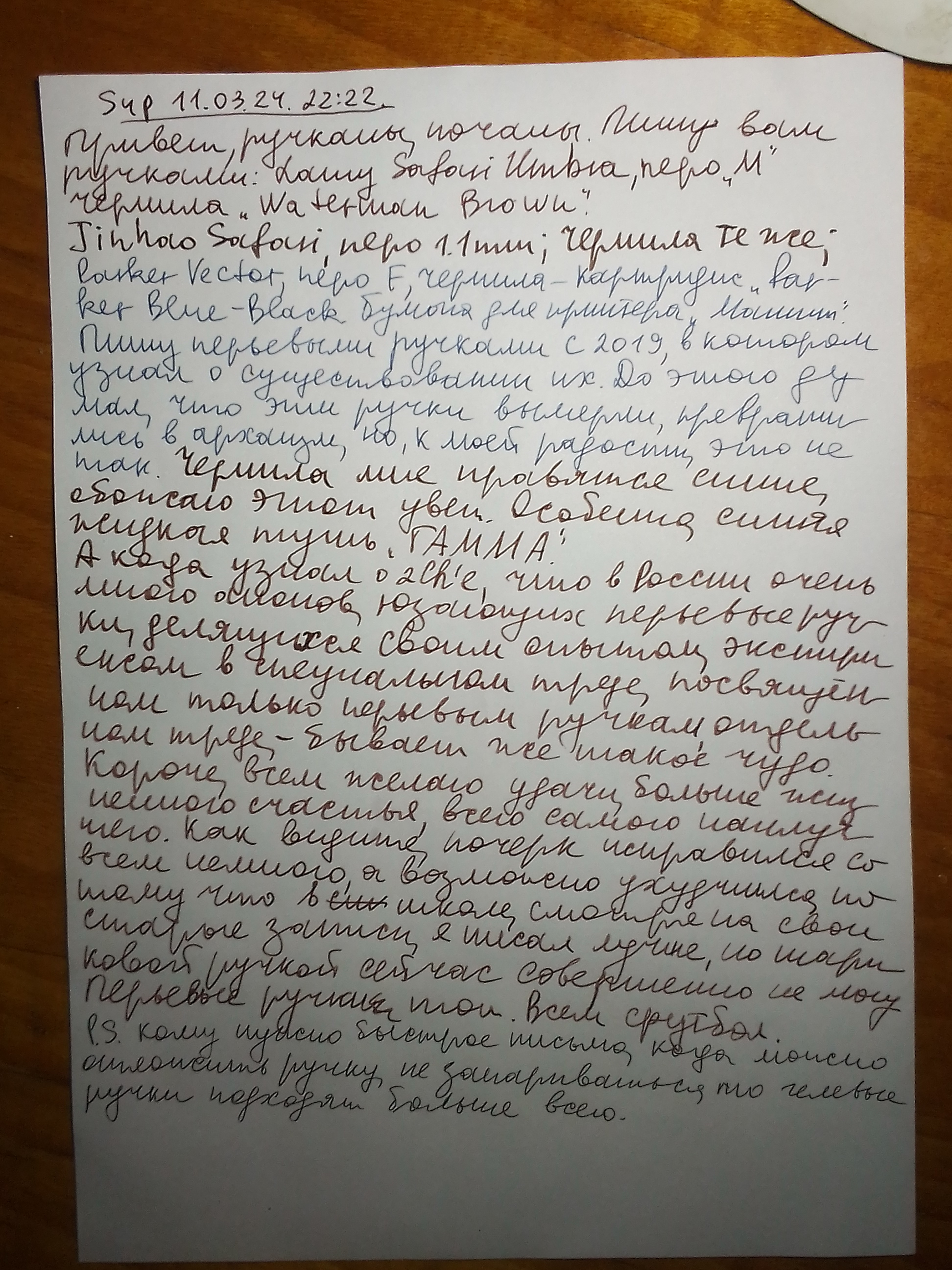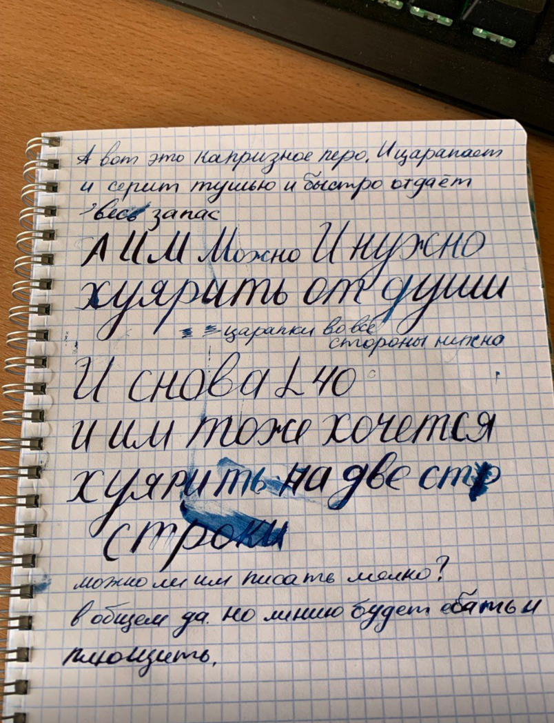 Ну и из-за этого потреблядства интереса к ручкам впервые возникло желание купить перьевую годноту, но объективно перьевая ручка мне не нужна (даже роллер мне нужен с натяжкой), ведь я практически не пишу. Иногда думаю о том, чтобы писать что-то в блокнотах, начать письмо от руки (например, ребенком я писал рассказы в тетрадях), но в конце концов все равно прихожу к тому, что это бесполезное занятие, которое все равно потребует переписывания в цифру; нет смысла писать от руки.
