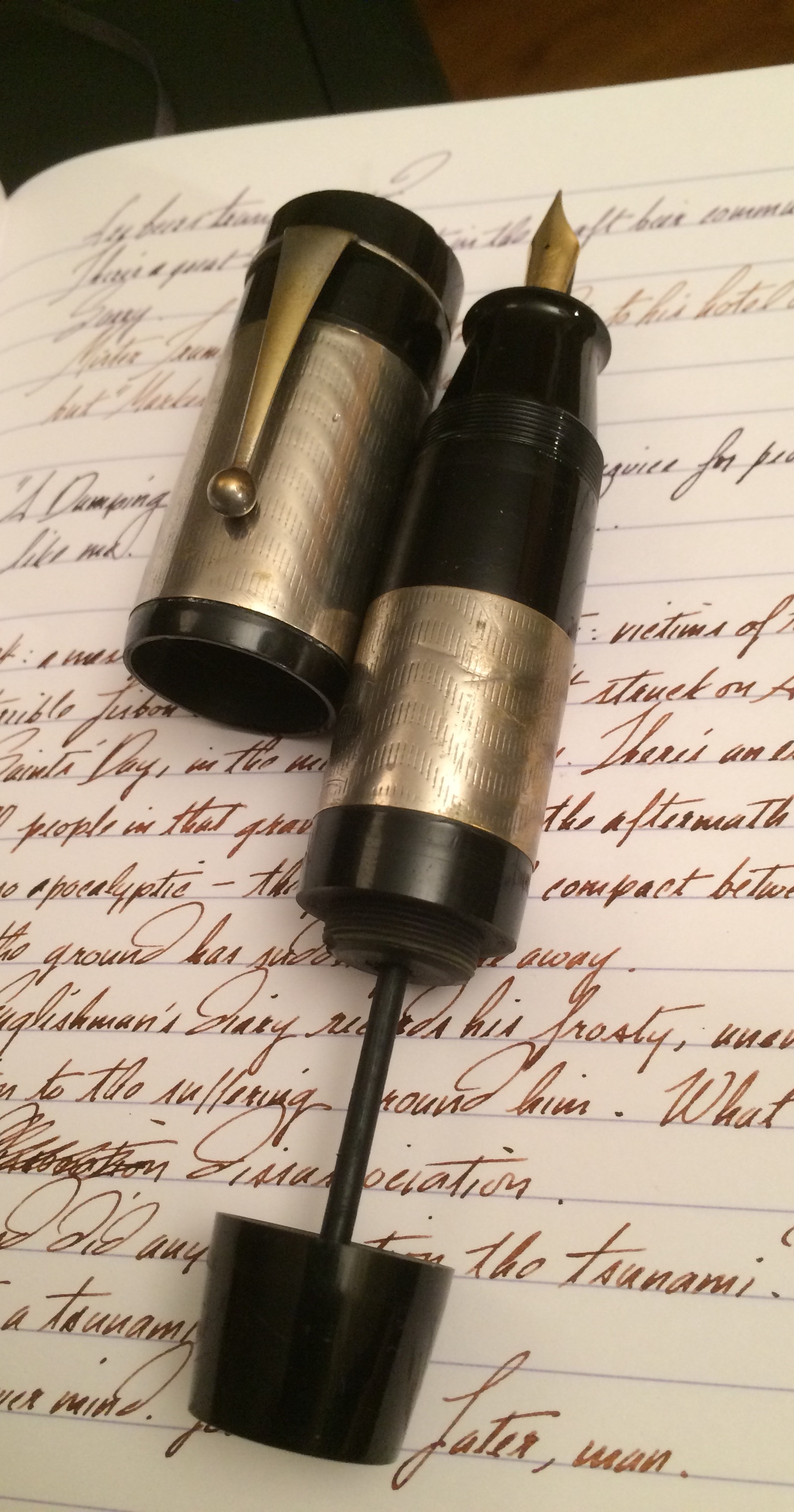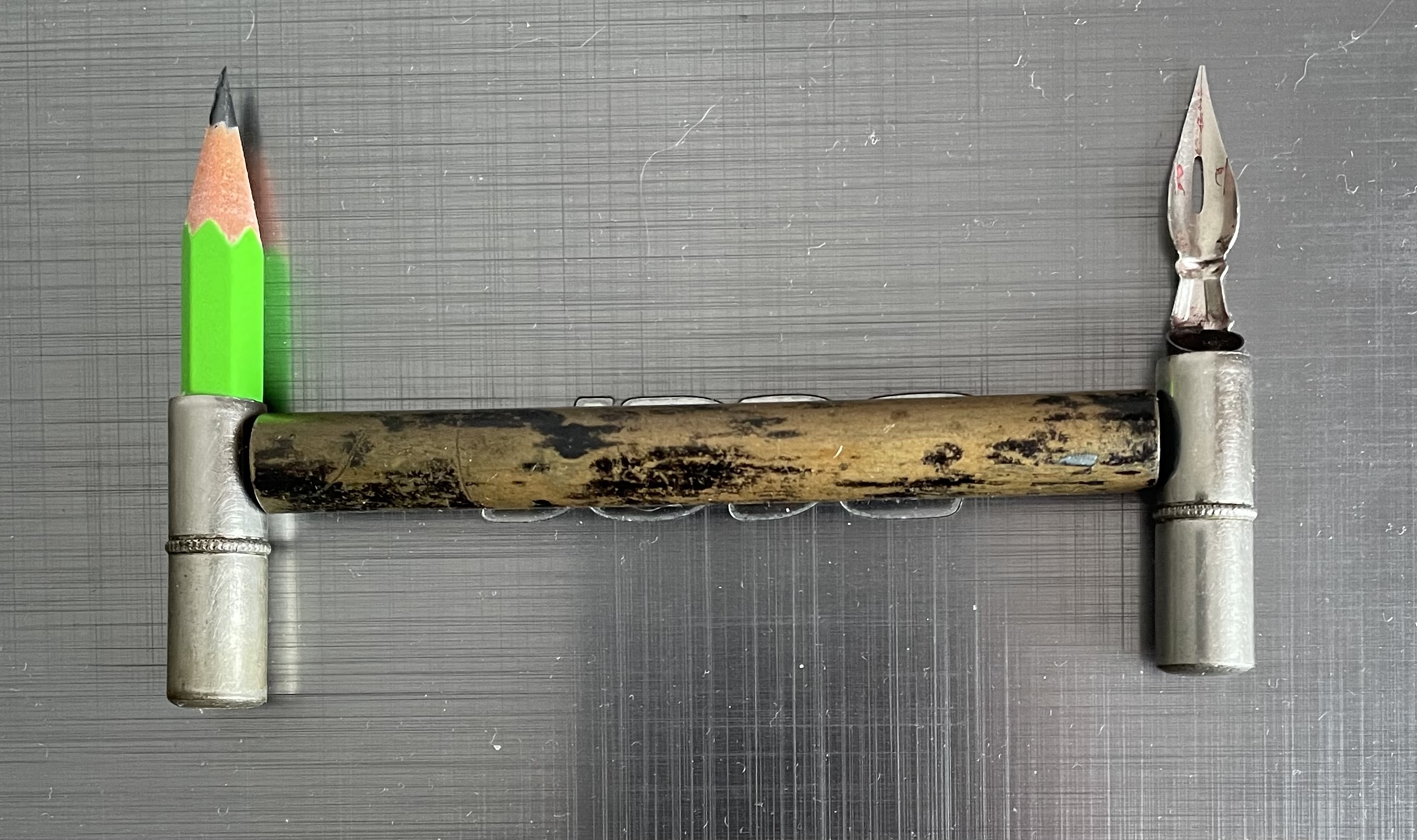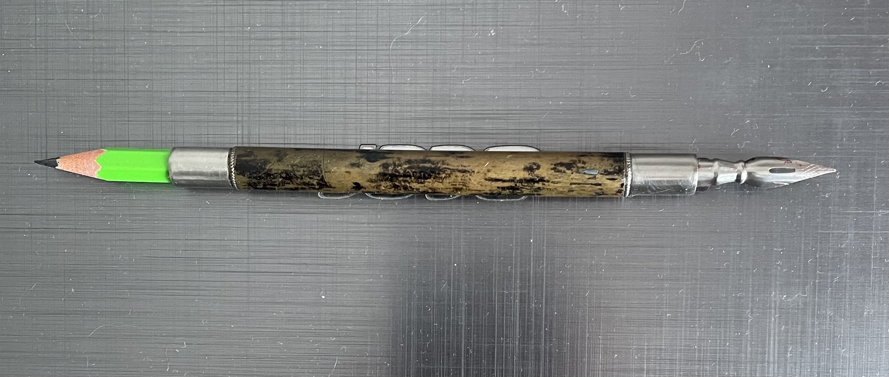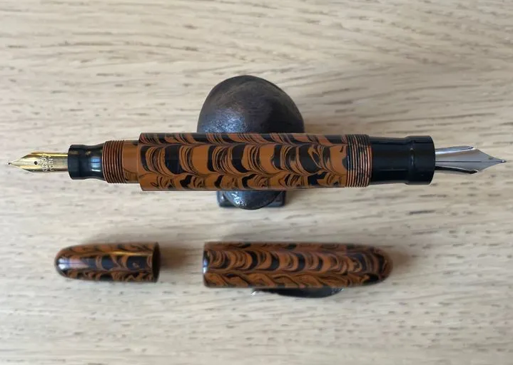 Вот такая индийская ебанитовая биба-наливайка. Похожее есть тут: https://www.kiwipens.com/collections/handmade-fountain-pens Но там перья и фидеры отличаются (на моей фидер вручную сделан, а на пере нет никаких опознавательных знаков) и нет йоб с двумя пишущими узлами. Раньше некая kim & co эти ручки делала, которая теперь лицензию продаёт просто, так что у меня или оригинал индус, или другой лицензиат (маловероятно, других не нашёл), или более ранняя киви. Интересно было бы точно идентифицировать. Предлагаю всем итт помериться ручками.