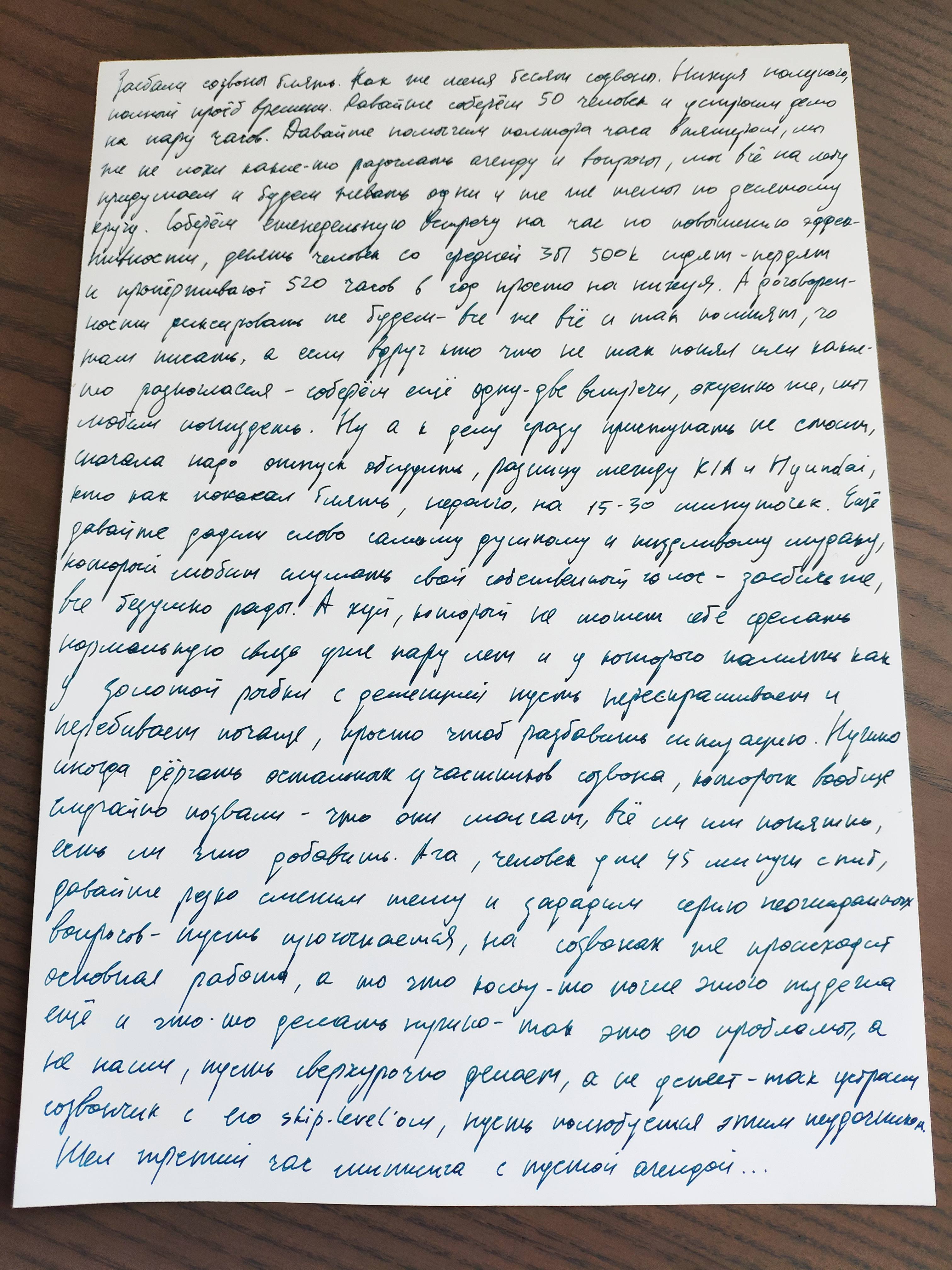 >>757510 >Ну например, у меня как у студента есть зачетная книжка, там все преподы синими чернилами пишут Э-э-э, я, как бы, препод, вообще-то... И в зачётках, и в ведомостях пишу всё теми же коричневыми чернилами, правда, перо беру EF, ибо графы мелкие, а бумага из говна с опилками деланная.