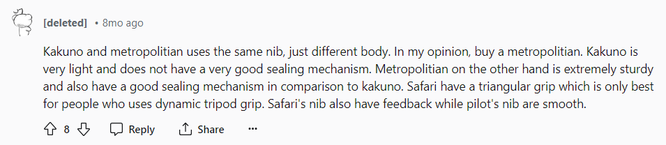 >>762601>>762612 Твои домыслы противоречат непосредственному опыту десятков тысяч людей, в частности студентов и школьников, для которых начальная система platinum p стала первой перьевой ручкой в жизни. Популярность обеспечена доступностью, хорошим стабильным качеством перьев, практичностью, совместимостью (ты можешь взять любой модуль с пером, фидером и грип-секцией, и нацепить на него любой баррель и колпачок из начальных серий, которые, кстати, можно купить раздельно) и надёжностью (высокое качество поликарбоната, картриджи из толстого пластика с тяжёлым стальным шаром, выдерживающие многочисленные перезаправки, наличие конвертеров или айдроппер-мод, изначально предусмотренный производителем). Только что решил посмотреть что там есть и заказал пик рилейтед. 10 баксов с доставкой. Приводимые тобой "проблемы" — не основанные на рациональных соображениях и опыте высосанные из пальца маняфантазии. Считать ты можешь что угодно, но отгружаемые мешками начальные platinum у любого крупного stationary ритейлера должны навести на какие-нибудь мысли. Учитывая упавшее качество перьев у пилотов 78/88 (Metro — одна из подсерий 88х), они давно перестали быть лучшим вариантом для вкатывания в перья. Какие-нибудь бюджетные Jinhao с али теперь имеют куда больше смысла (и я их пробовал, они приемлемые по качеству) для задачи "попробовать перья".